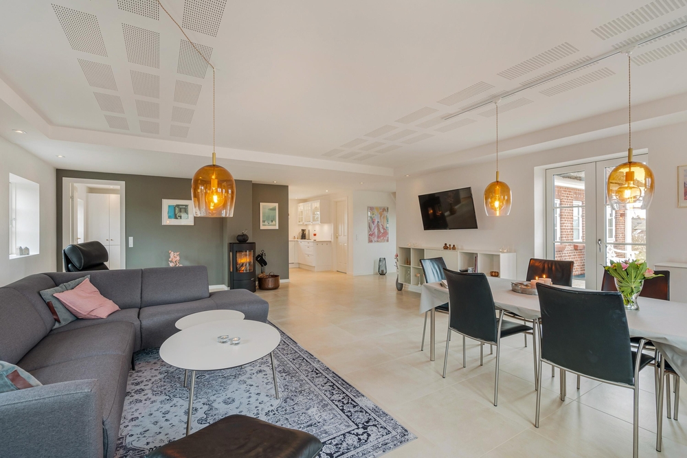 Feriehuset i Blåvand har plads til op til otte personer med tre hyggelige soveværelser, der hver er udstyret med en komfortabel dobbeltseng og dertil en sovesofa på 1. sal. Forestil jer hyggelige aftener foran den knitrende brændeovn, der skaber en varm og hyggelig atmosfære. Derudover byder huset på moderne bekvemmeligheder som opvaskemaskine, vaskemaskine og tørretumbler, der gør hverdagen nemmere. Opholdet bliver også forbedret af gulvvarme på badeværelset og en effektiv luft-vand-varmepumpe, der sikrer en behagelig temperatur året rundt.