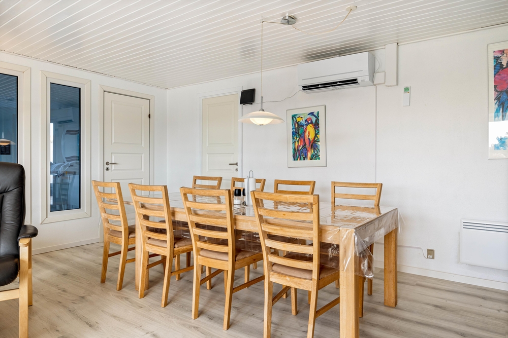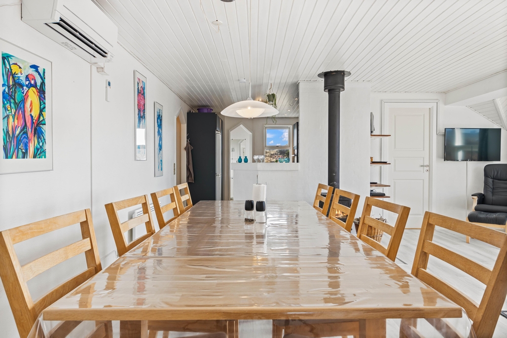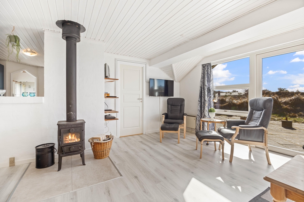 Det store samlingspunkt i sommerhuset, der er renoveret i 2022, er alrummet, hvor I blandt andet kan samles til skønne måltider omkring spisebordet og gode film i tv?et ? I kan endda streame jeres favoritfilm via Chromecasten. Her sørger brændeovnen for at sætte prikken over i?et med sin knitren i baggrunden og varme.