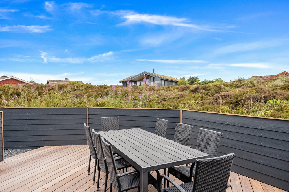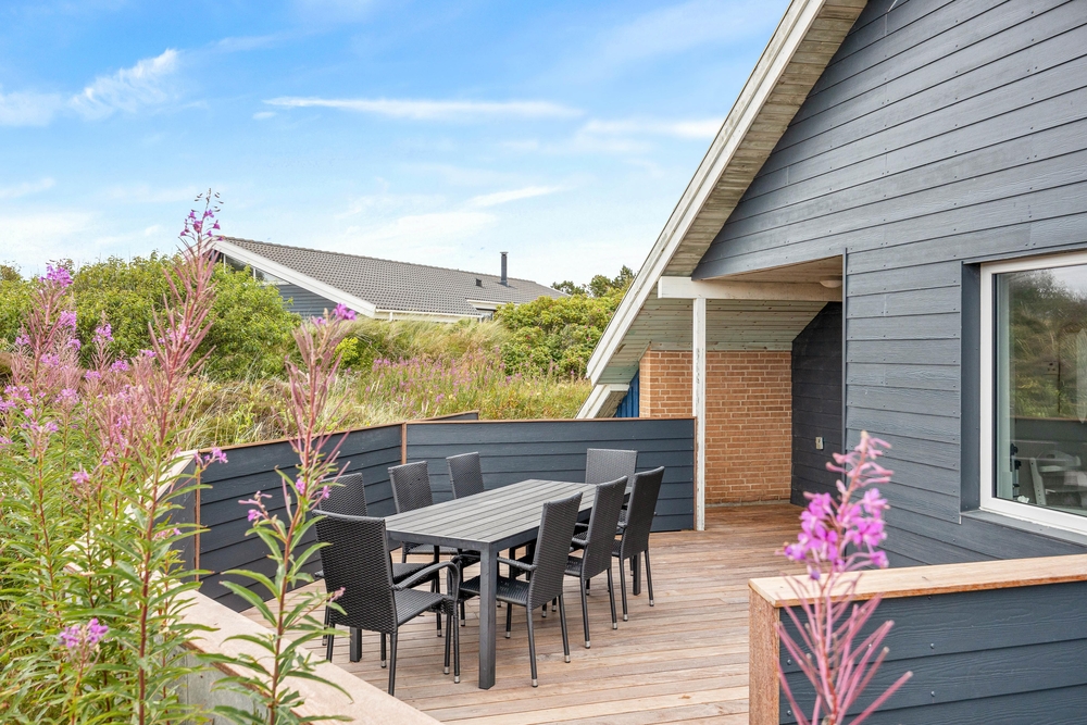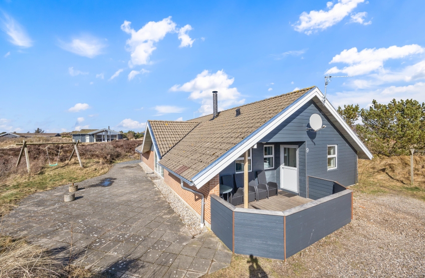 Sommerhuset på Kløvervej 9 i Henne ligger på en 1.600 kvadratmeter stor naturgrund, og på sommerhusets udeområde kan både store og små tilbringe feriens solrige dage. Til børnene er der en gynge, og imens de gynger, kan I finde jer en god plads på terrassen og læne jer tilbage i havemøbler og liggestole.
