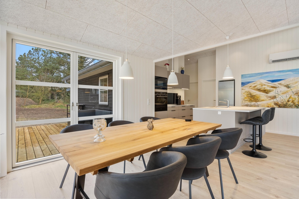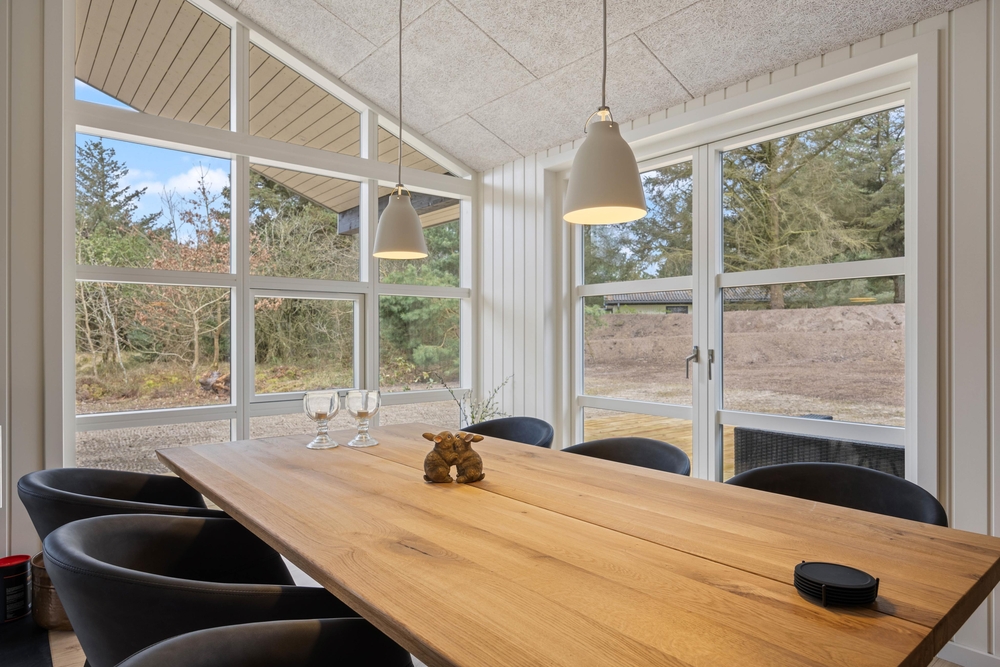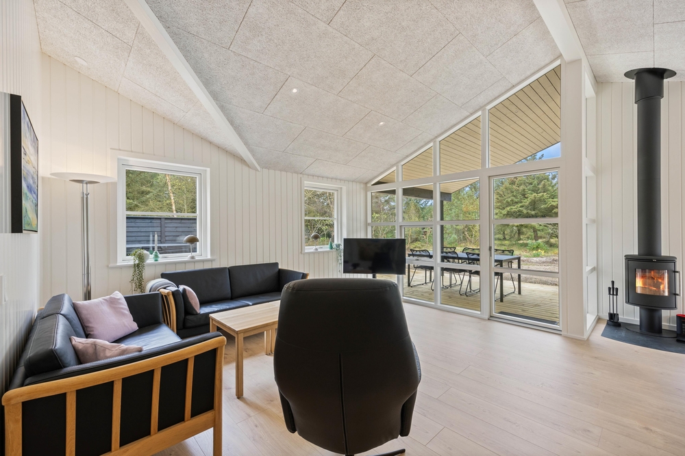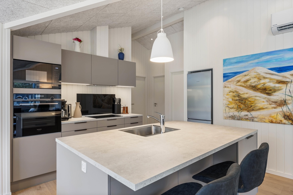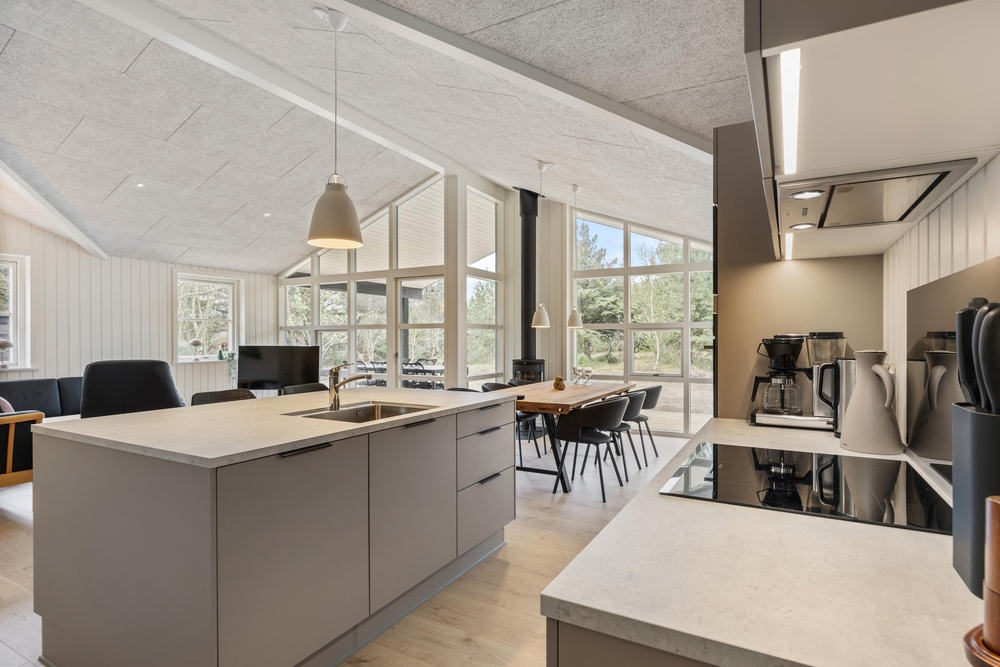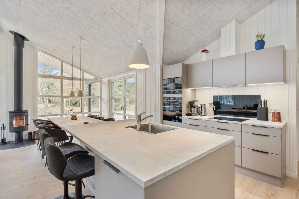 Koglevej 4 byder jer velkommen til en moderne og lækker indretning med et køkken, der er fuldt udstyret med alt det nødvendige køkkenudstyr, der skal til for, at I kan lave en masse lækker mad på ferien. Opvaskemaskinen klarer hurtigt opvasken på ferien, og der er god plads til at samles samt nyde et glas vin, imens børnene slapper af, og maden simrer. Om aftenen kan i synke ned i sofaen og kigge ud på stjernehimlen og naturen igennem de store panoramavinduer, mens brændeovnen knitrer og bidrager til ægte sommerhusstemning. Der er adgang direkte inde fra badeværelset med sauna ud til terrassen.