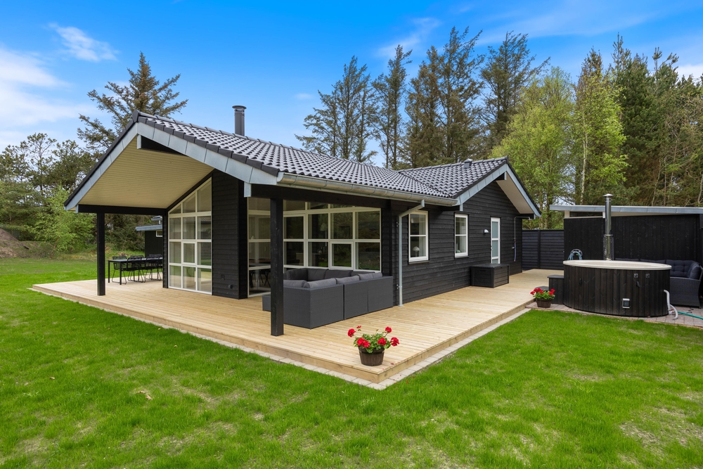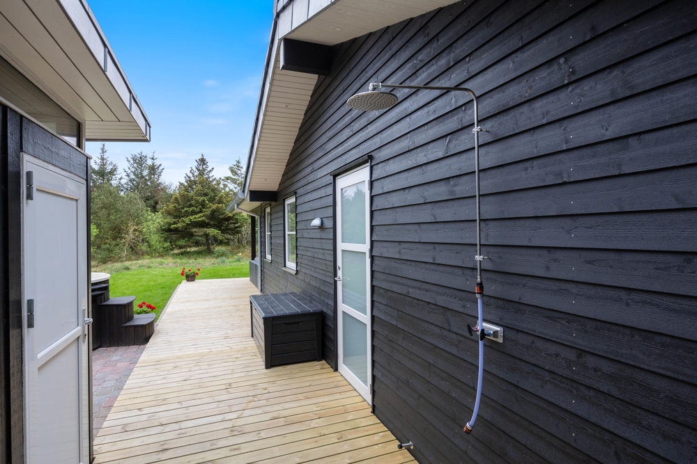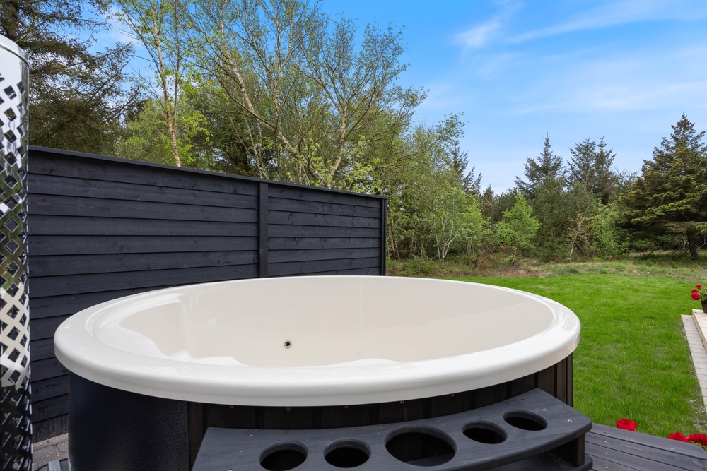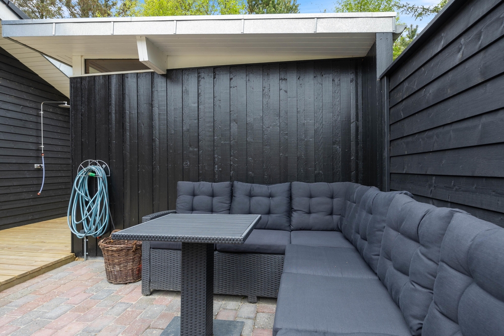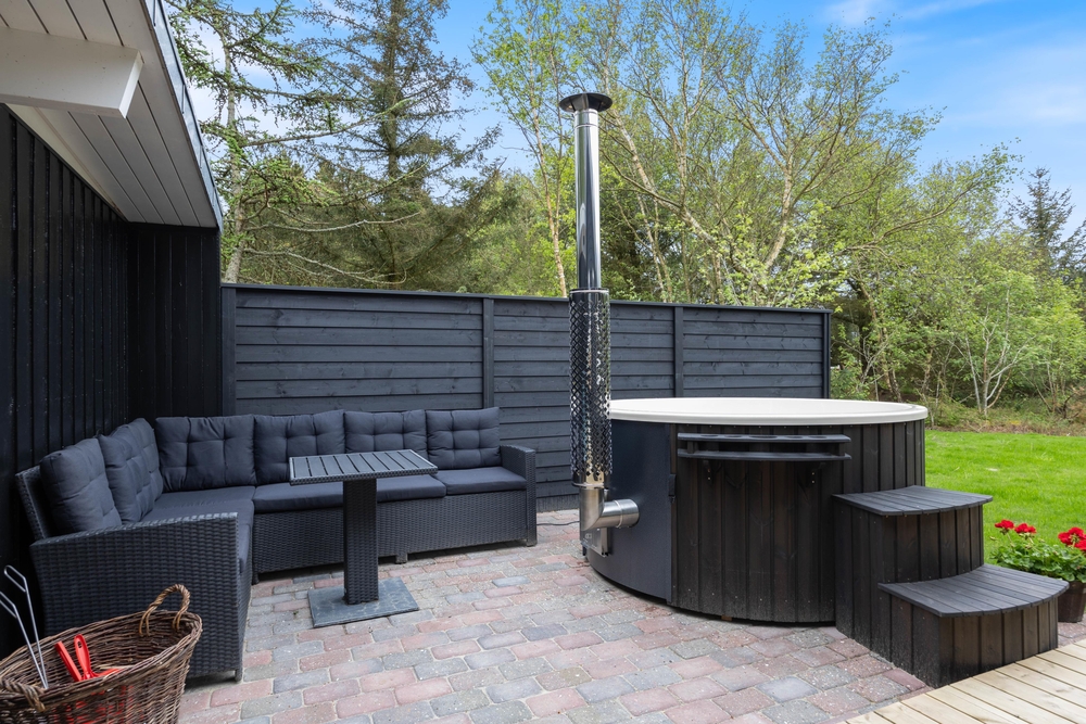 Et af sommerhusets absolutte highlights er uden tvivl det udendørs vildmarksbad. Vildmarksbadet har plads til 5 personer, og wellnessområdet med vildmarksbadet og udebruseren er helt lukket af, så I kan sidde der ugeneret og i læ. Her kan I sidde uanset vejret, om det regner eller sner og kigge op på stjernehimlen, mens I bliver varmet godt igennem. Der er en dejlig terrasse næsten hele vejen rundt om huset, som er delvist overdækket. Der er både havemøbler og grill til rådighed, så I rigtig kan slappe af og nyde solen og ferien.