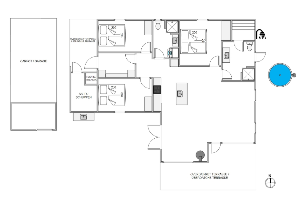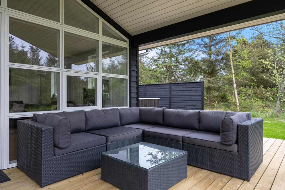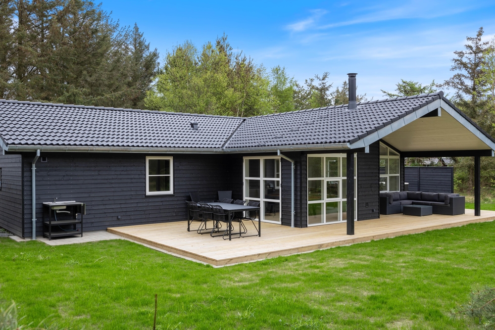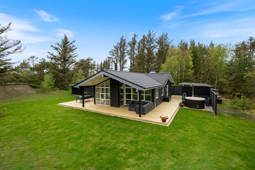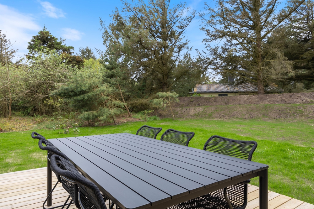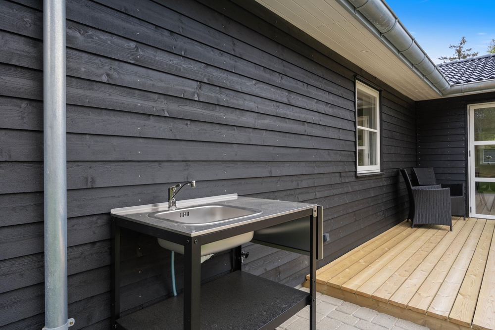 Et af sommerhusets absolutte highlights er uden tvivl det udendørs vildmarksbad. Vildmarksbadet har plads til 5 personer, og wellnessområdet med vildmarksbadet og udebruseren er helt lukket af, så I kan sidde der ugeneret og i læ. Her kan I sidde uanset vejret, om det regner eller sner og kigge op på stjernehimlen, mens I bliver varmet godt igennem. Der er en dejlig terrasse næsten hele vejen rundt om huset, som er delvist overdækket. Der er både havemøbler og grill til rådighed, så I rigtig kan slappe af og nyde solen og ferien.
