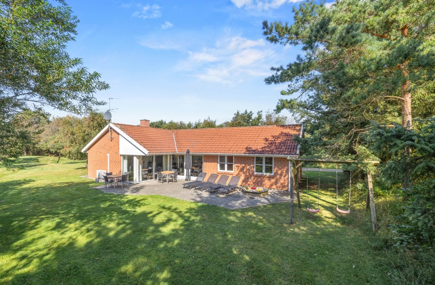 Sommerhuset på 154 m2 er beliggende på en stor naturgrund, der er afskærmet af de omkringliggende træer.
