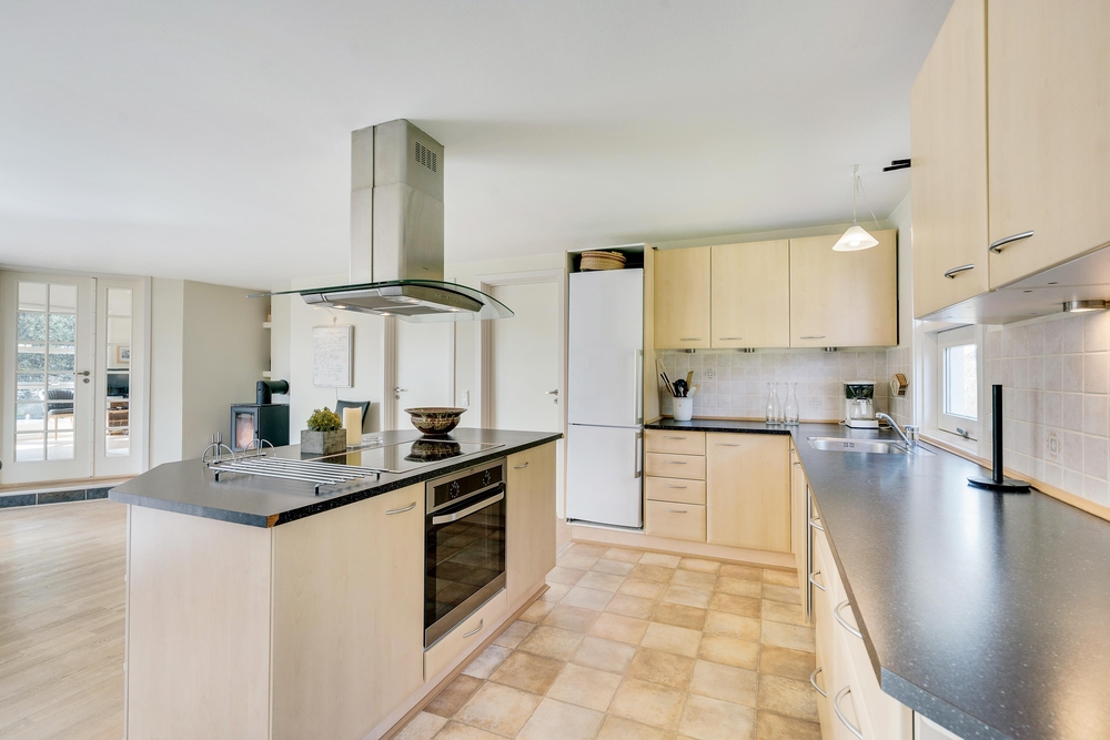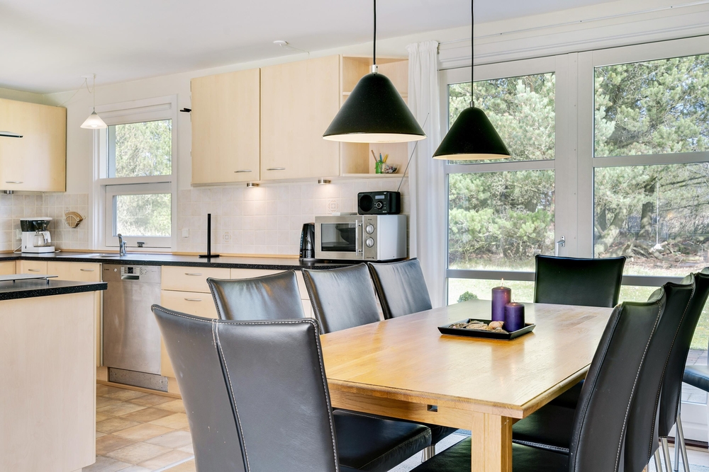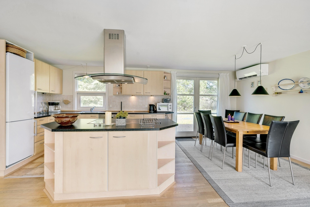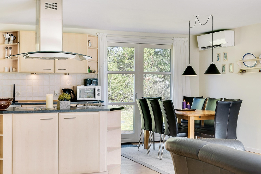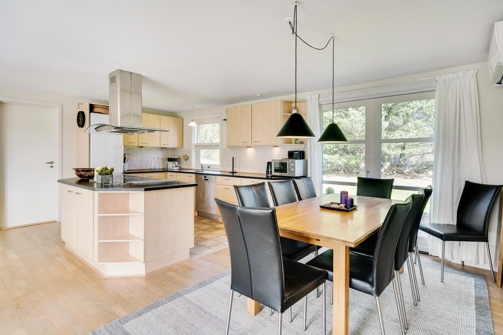 Det lyse og flotte hus er indrettet med alle bekvemmeligheder. For at give jer mulighed for optimal feriehygge, er her både vaskemaskine, tørretumbler og selvfølgelig opvaskemaskine. I det store flotte køkken med kogeøen er der god plads til i fællesskab at tilberede lækre måltider, og imens opvaskemaskinen klarer resten er der god tid til familiespil ved det store spisebord. Huset er udstyret med en energisparende varmepumpe og der er naturligvis gulvarme i badeværelserne. Vil I have det ekstra hyggeligt, så kan I naturligvis tænde op i husets lille brændeovn.