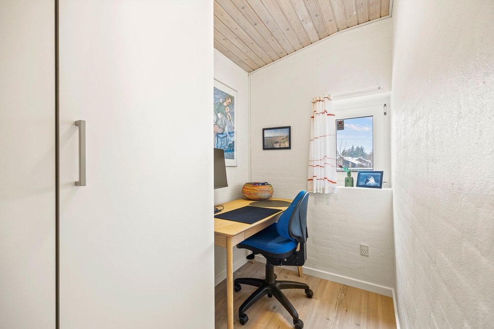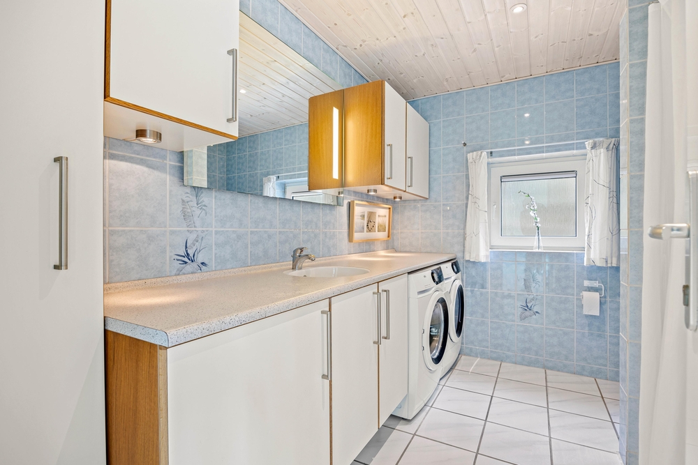 På et af de to badeværelser har I mulighed for at ordne det praktiske gøremål: at vaske tøj, da vaskemaskine og tørretumbler her er tilgængelige. Det samme gør sig gældende for kontoret, hvis nogen er nødt til at få ordnet noget arbejde på ferien.
