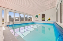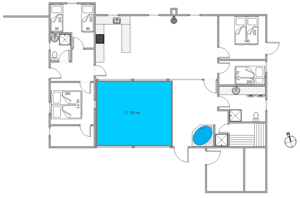 Sommerhusets planløsning er praktisk og veludnyttet ? her er et stort poolområde med tilhørende spa og infrarødsauna, køkkenalrum med stue og køkken i åben forbindelse, to badeværelser, fire soverum samt et lille fint kontor.