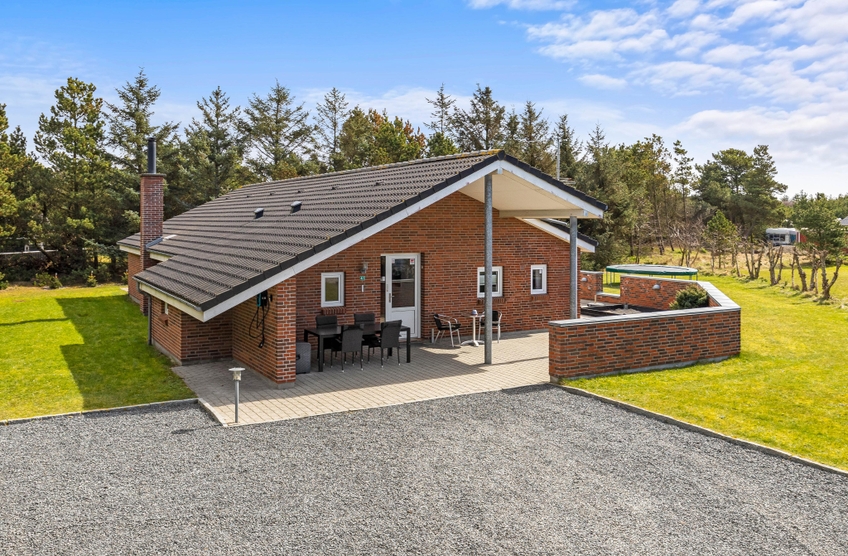 Sommerhuset, der kun ligger 800 meter fra stranden, er beliggende på en stor plænegrund og har en stor, afskærmet og delvist overdækket terrasse. Der står havemøbler og liggestole klar til jer, så I kan finde jer godt til rette på en god plet på terrassen. Desuden kan I takket være grillen spise en lækker grillmiddag på terrassen på de lune sommeraftener.