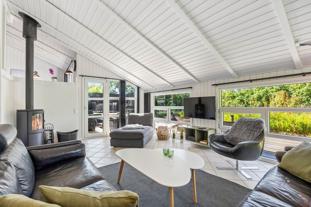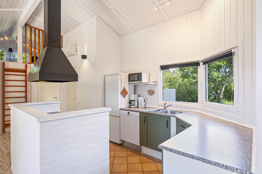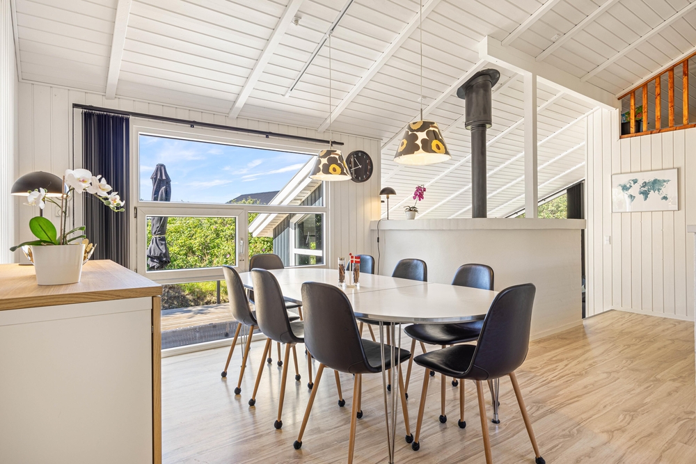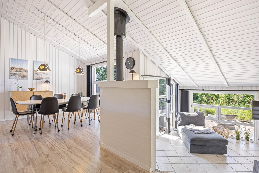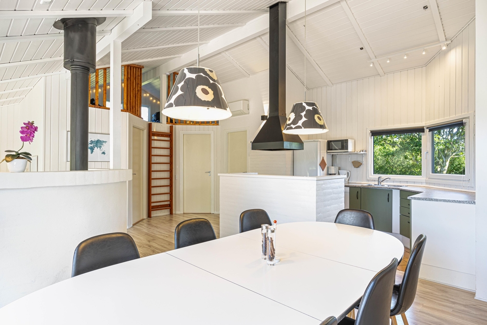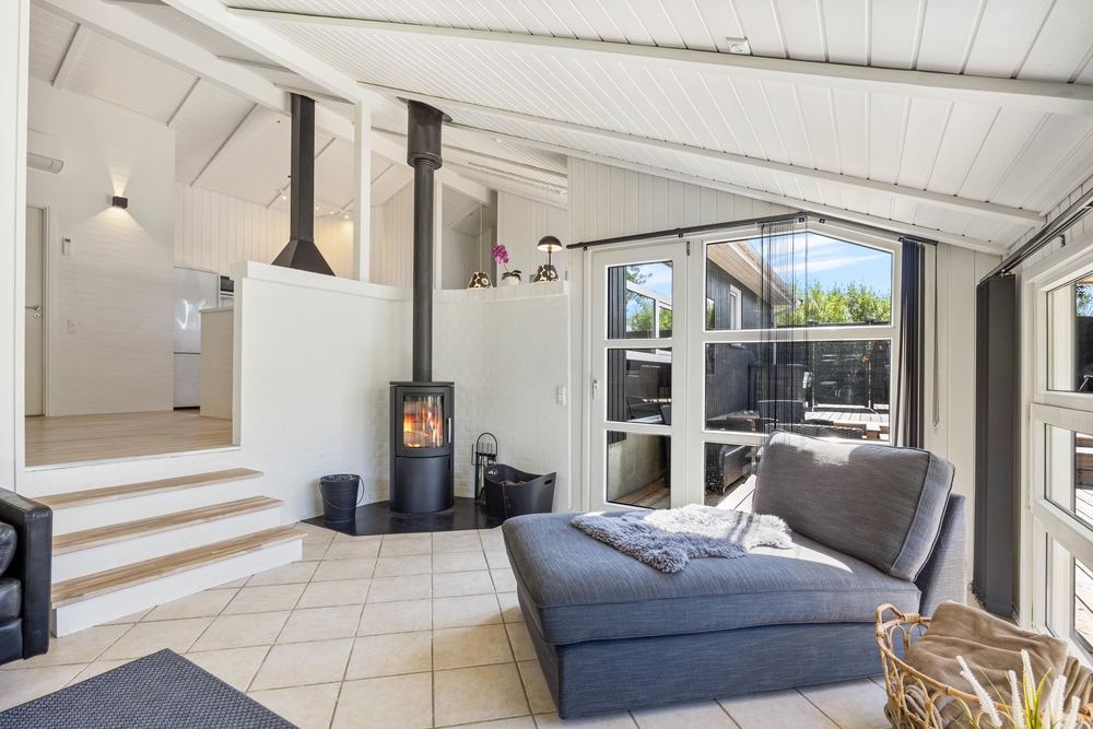 Sommerhusets hjerte er det åbne opholdsrum, der binder køkken og stue sammen. Vær sammen om madlavningen, spil brætspil eller find en sjov film i tv?et ? mulighederne er mange. Brændeovnen fuldender den gode feriestemning med sin knitren i baggrunden, og ellers sørger en energivenlig luft-til-luft varmepumpe for et behageligt indeklima i sommerhuset. Også her er en stige til hemsen, der kan er en hyggelig krog for børnene.