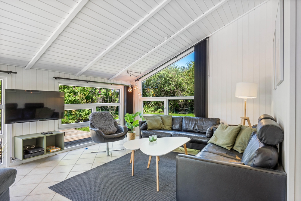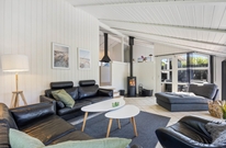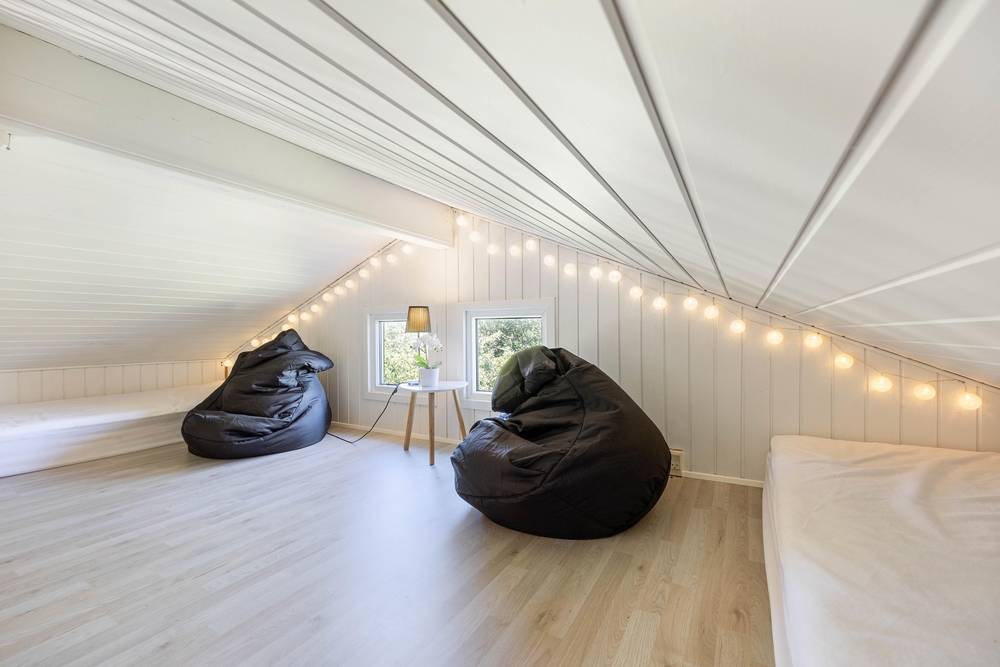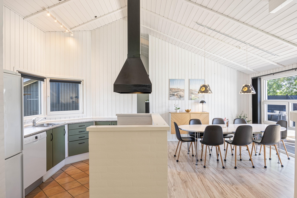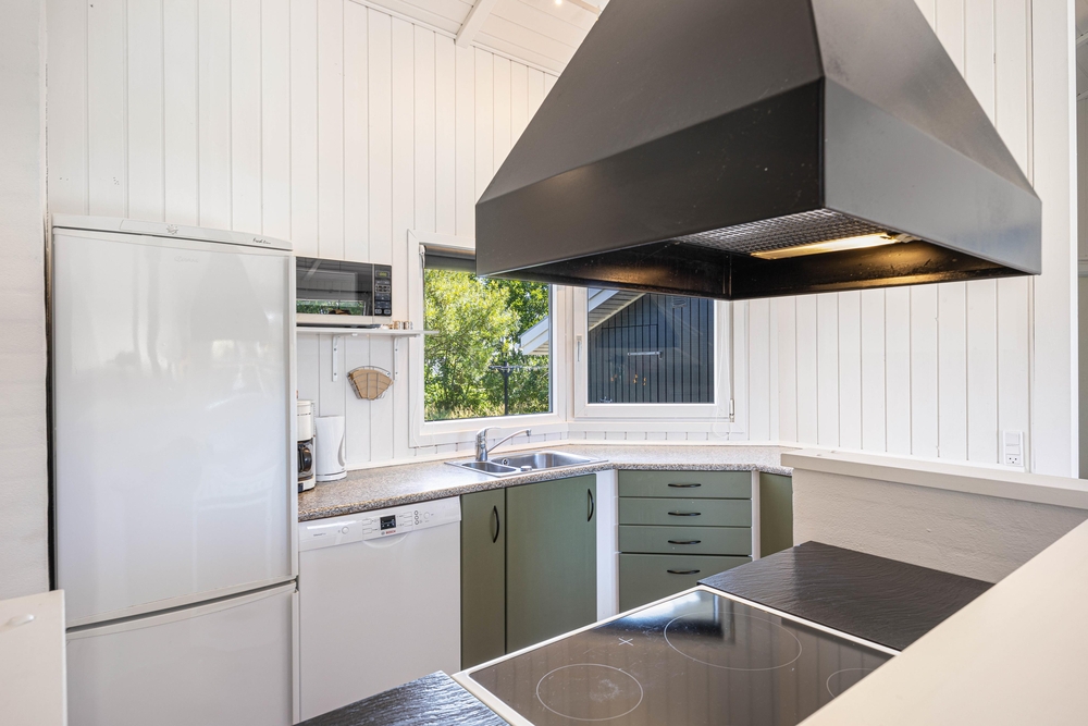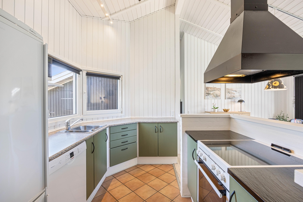 Sommerhusets hjerte er det åbne opholdsrum, der binder køkken og stue sammen. Vær sammen om madlavningen, spil brætspil eller find en sjov film i tv?et ? mulighederne er mange. Brændeovnen fuldender den gode feriestemning med sin knitren i baggrunden, og ellers sørger en energivenlig luft-til-luft varmepumpe for et behageligt indeklima i sommerhuset. Også her er en stige til hemsen, der kan er en hyggelig krog for børnene.