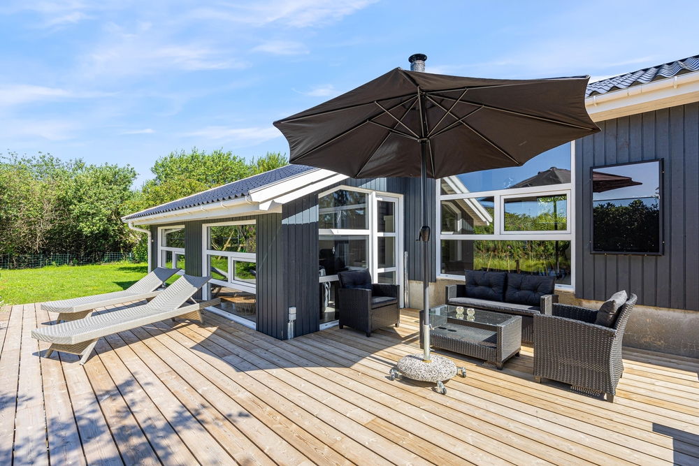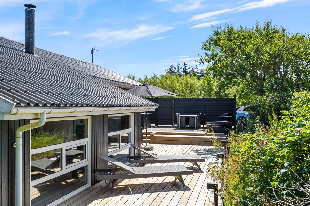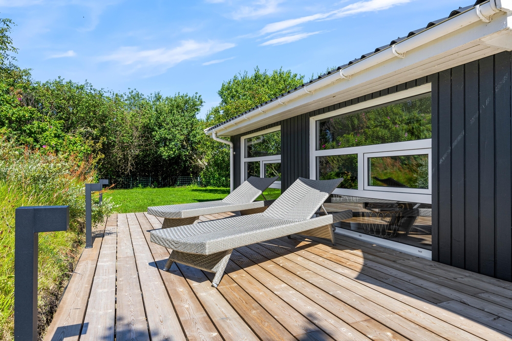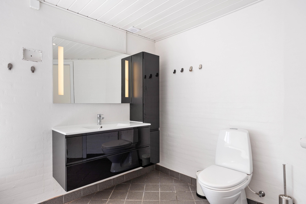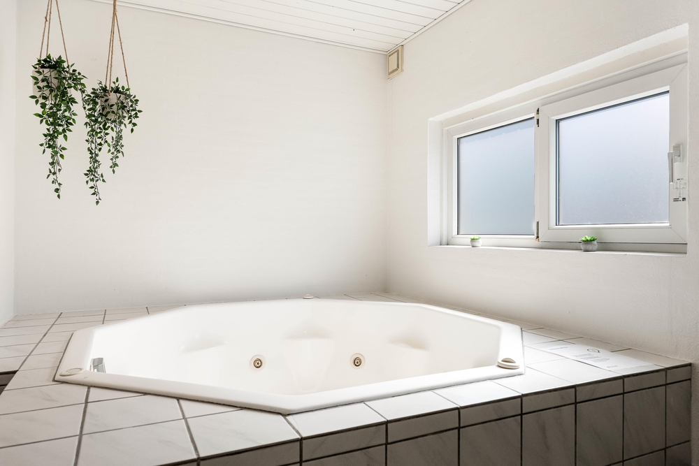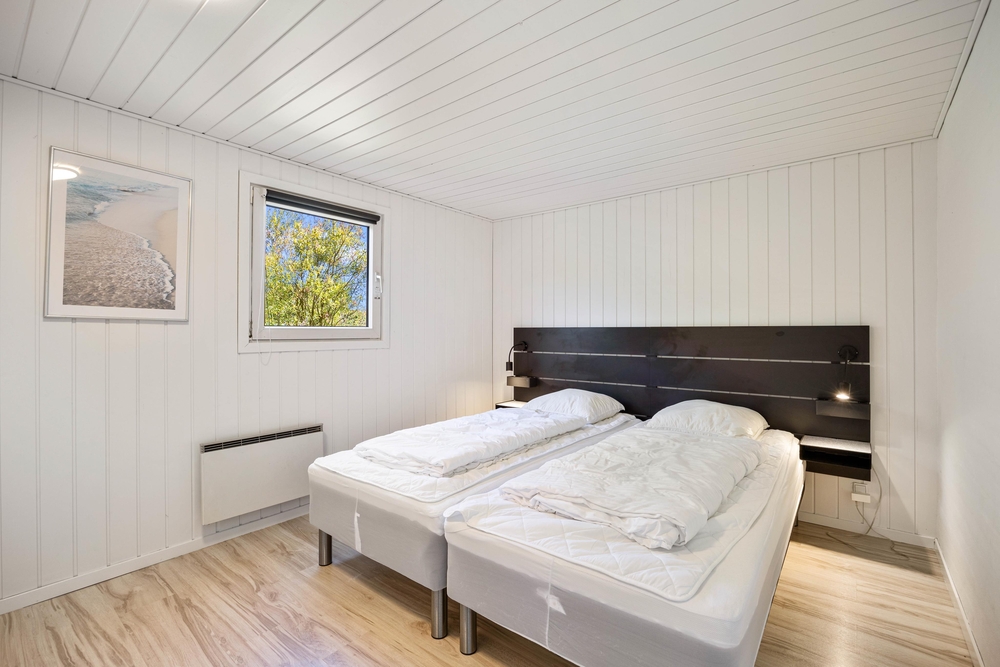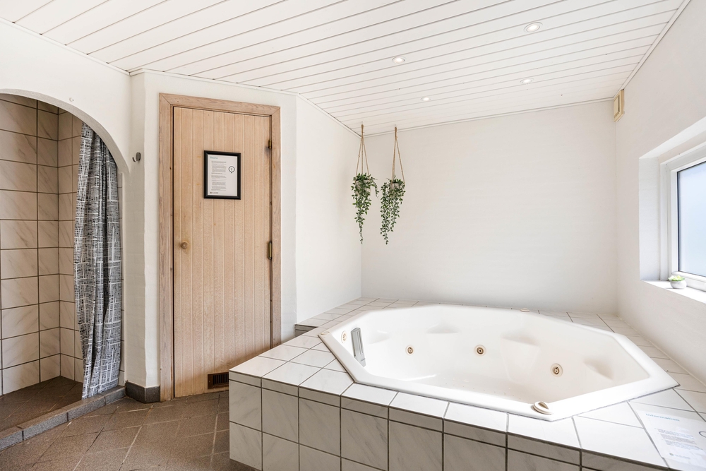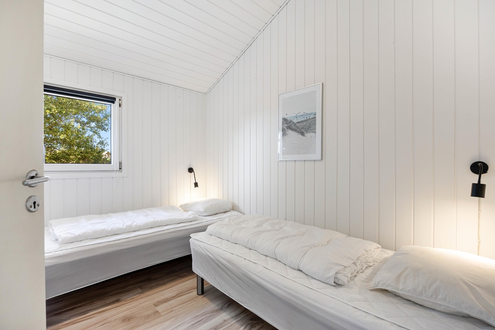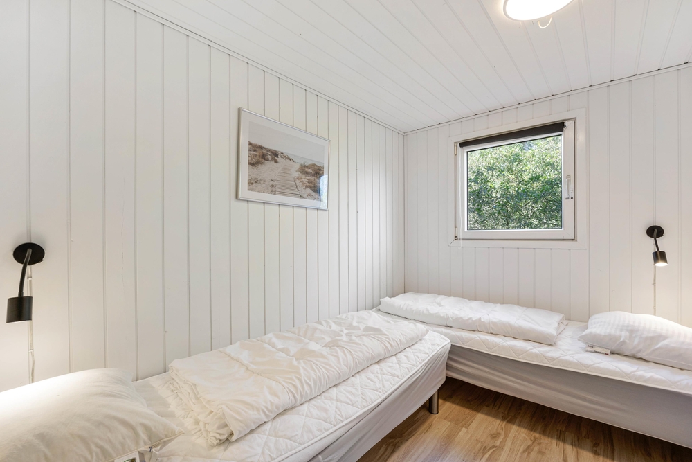 Sommerhuset er indrettet med 4 gode soveværelser, alle med komfortable enkeltmandssenge. Praktisk er her 2 badeværelser, én i hver sin ende og begge med gulvvarme. På det ene finder I både spabad og sauna, hvor I kan blive varmet godt igennem ? også helt perfekt efter en tur ved Vesterhavet.