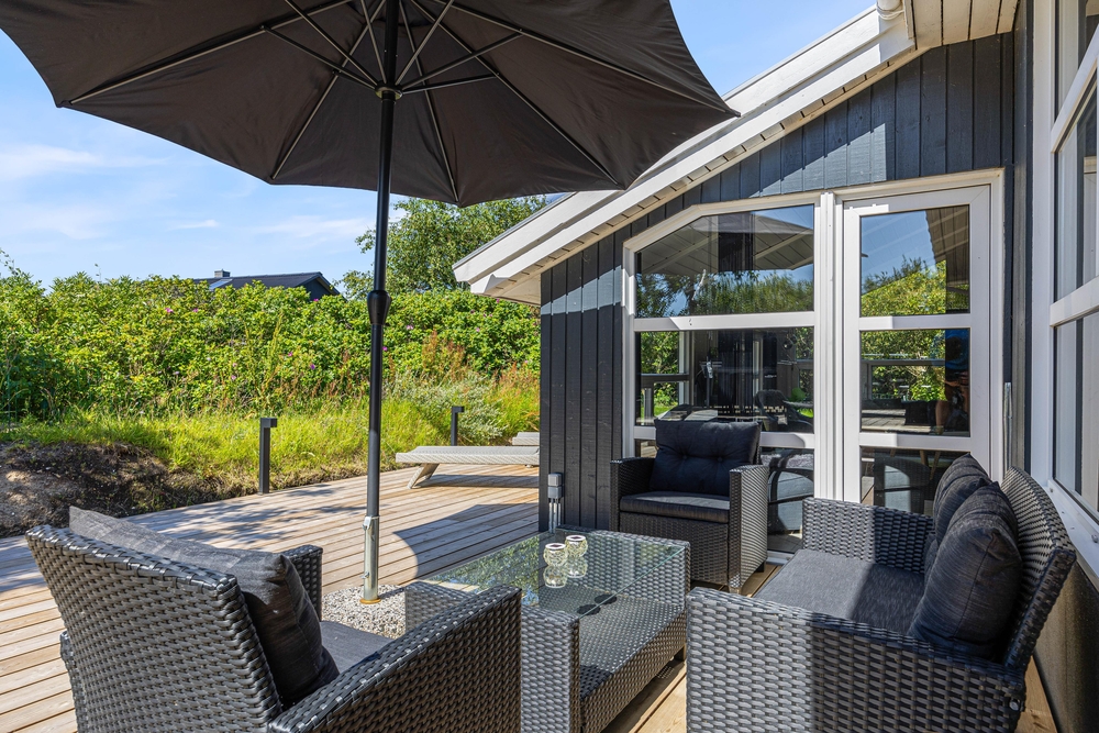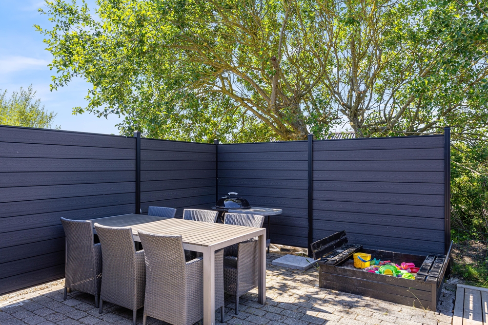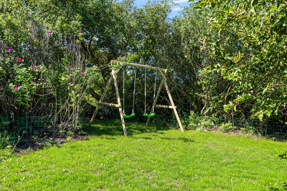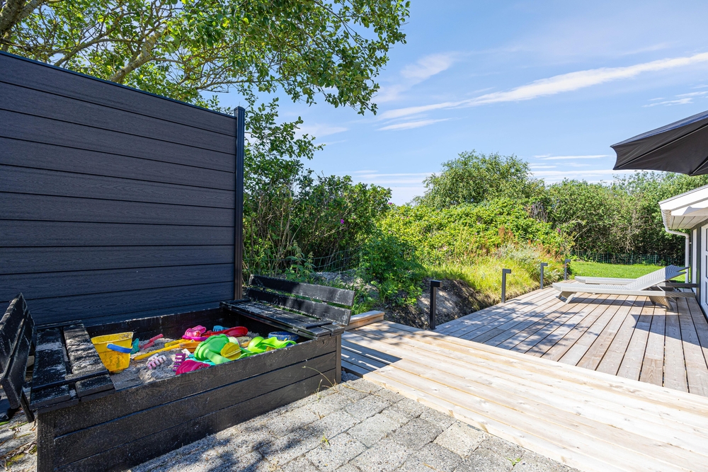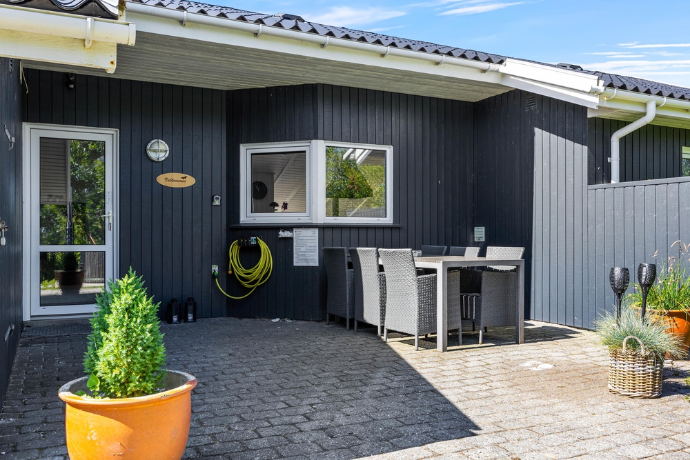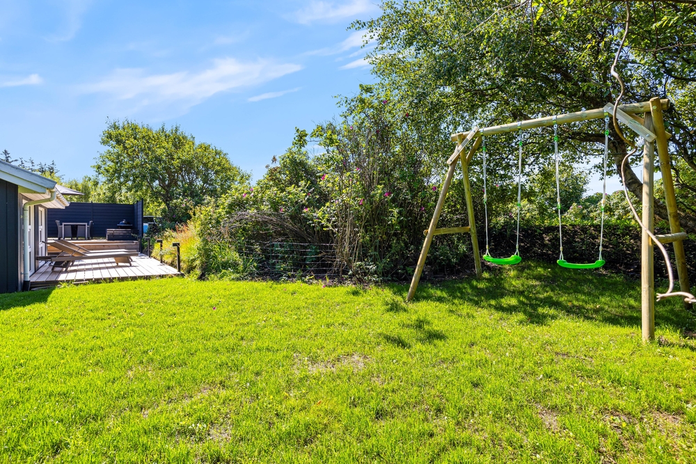 Udenfor venter jer en dejlig terrasse, hvor I kan nyde morgenkaffen, slappe af i solen eller samle hele familien til en dejlig grillaften. Her er der rig mulighed for at nyde solskinstimerne ? havemøblerne venter her allerede. Slap af i solen og se børnene lege. Her er både gynger og sandkasse at finde.