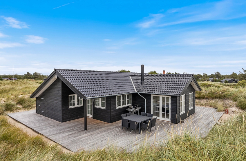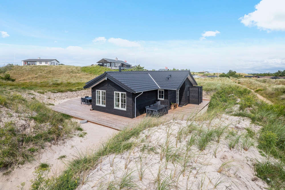 På en naturskøn plet i Vejers Strand, kun 400 meter fra Vesterhavet, finder I dette flotte sommerhus til 4 personer. Det klassiske træhus er opført i 2021 og byder på et velafstemt miks mellem moderne, skandinavisk stil og høj hyggefaktor i bedste charmerende sommerhusstil. Det indbydende indre er blandt andet indrettet med brændeovn, og en stor træterrasse hele vejen rundt om feriehuset sørger for, at I kan nyde solens stråler fra morgen til aften. På terrassen er der også en udebruser, der kan benyttes fra april til november.