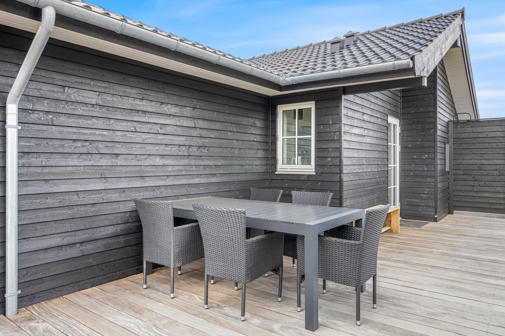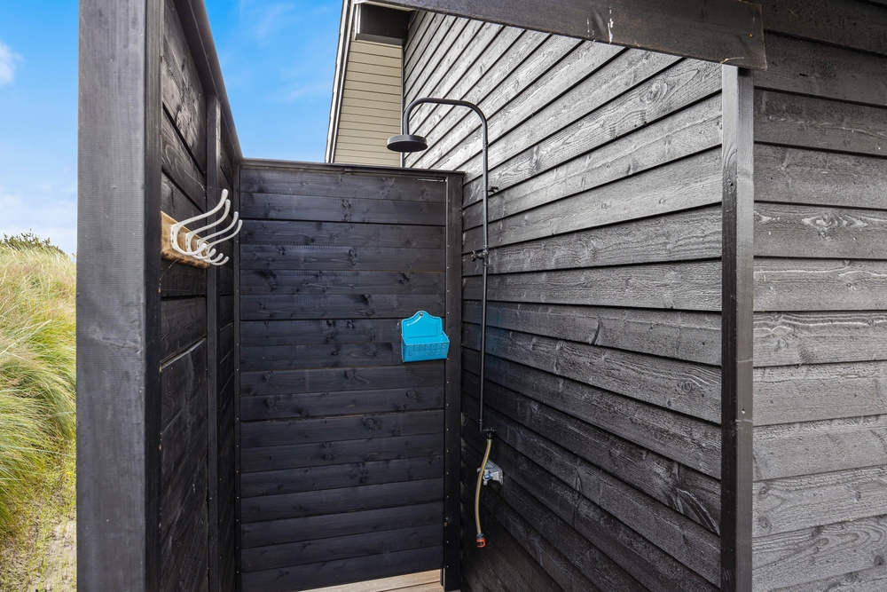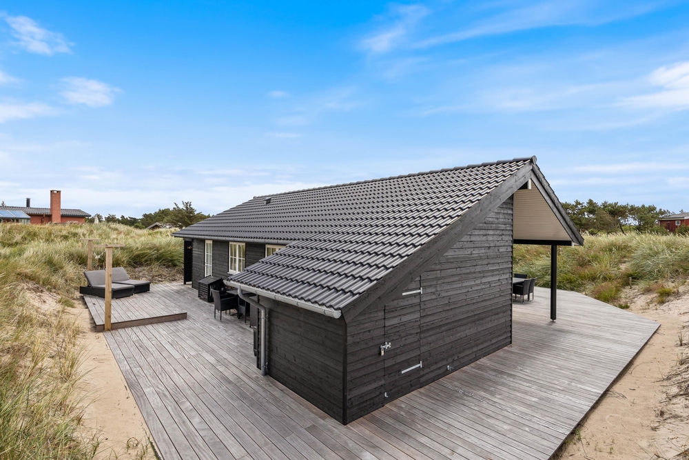 Den store træterrasse løber hele vejen rundt om sommerhuset og er absolut et af feriens højdepunkter. De høje klitbanker rundt om naturgrunden giver jer en læfyldt beliggenhed, og terrassen har også en overdækket del, der er oplagt at tage i brug, når I vil fyre op i grillen på en lun sommeraften. Sommerhuset er udstyret med en gasgrill, så I hurtigt kan tilberede et lækkert feriemåltid. Terrassen gemmer desuden på en udebruser. Udebruser er lukket fra 1. november til 1. april på grund af frosten.