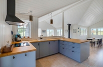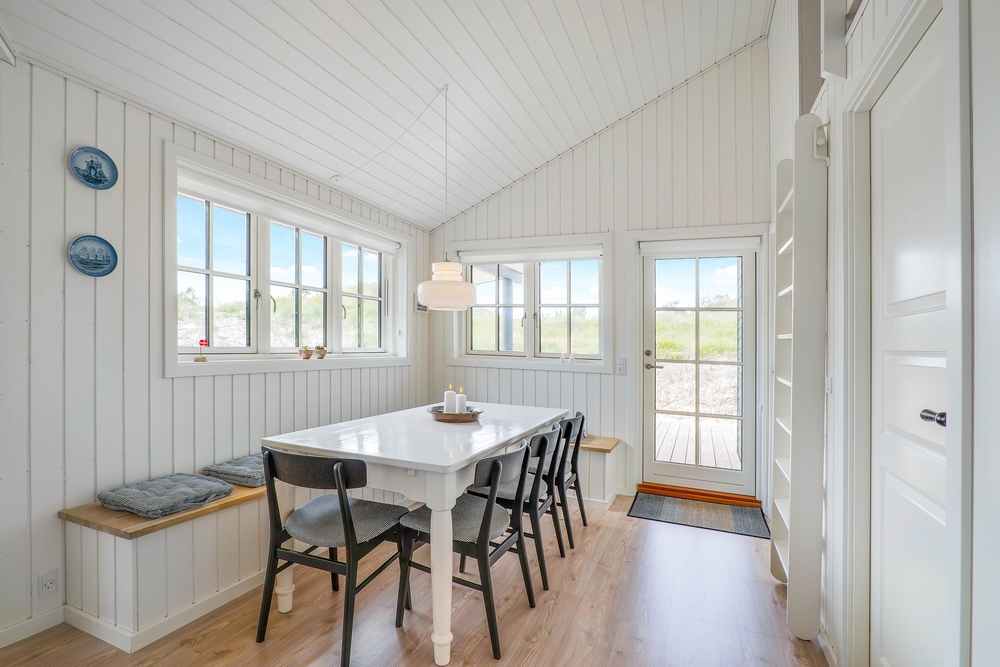 Hyggelige feriestunder får I med garanti masser af i opholdsrummet, der forener både køkken, spisestue og stue. I de kølige måneder står brændeovnen i sofahjørnet klar til at sprede hyggelig stemning og god varme. Omvendt byder sommerhalvåret helt sikkert på mange dejlige solskinsdage, og her er det meget praktisk, at I har flere udgange til terrassen.
