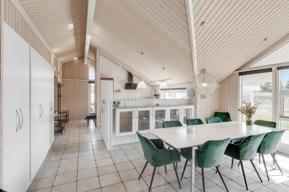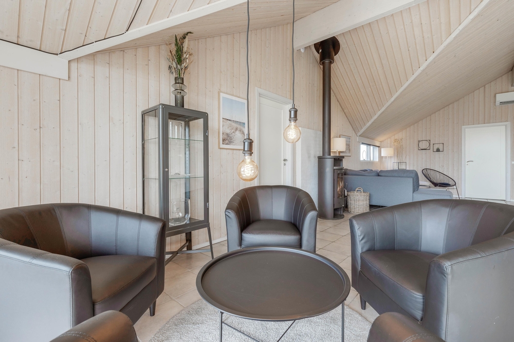 Hjertet i feriehuset er det store alrum, hvor køkken, spiseplads og stue er forenet. Her er der rig mulighed for, at I kan nyde hinandens selskab. Brændeovnen sætter prikken over i?et for feriestemningen med sin knitren og varme.