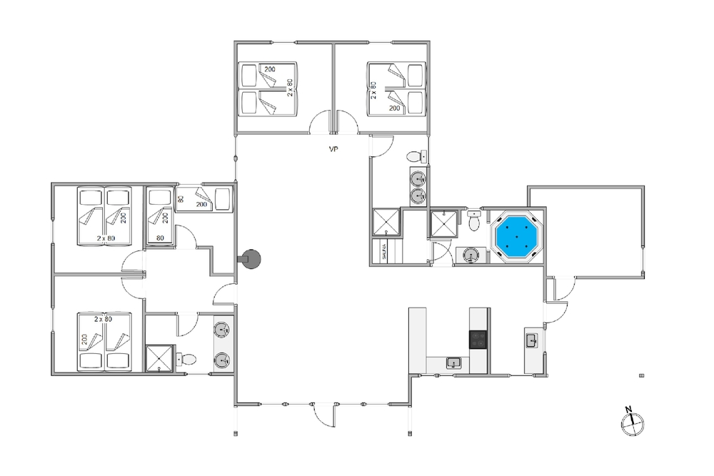 I det 178 kvadratmeter store sommerhus er der 5 soveværelser. 4 af soveværelserne er indrettet med en dobbeltseng hver, mens det femte soveværelse er indrettet med 2 enkeltsenge. Med hele 3 badeværelser i sommerhuset slipper I desuden for at starte jeres feriedage med at stå i kø til badeværelset ? alle 3 badeværelser har endda gulvvarme.