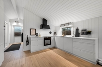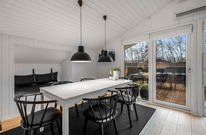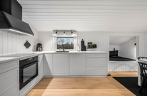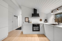 Stue, køkken og spisested er samlet i ét stort rum, hvilket giver en skøn følelse af sammenhold, selv når I har forskellige aktiviteter i gang. I kan slappe af i sofaen og se tv, spille brætspil ved spisebordet, eller blot nyde hinandens selskab med ilden fra brændeovnen knitrende i baggrunden. I feriehuset er en energibesparende varmepumpe, som hurtigt og effektivt sørger for et behageligt indeklima og en god temperatur.