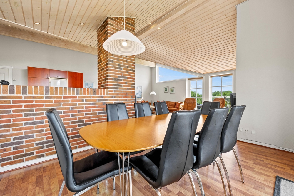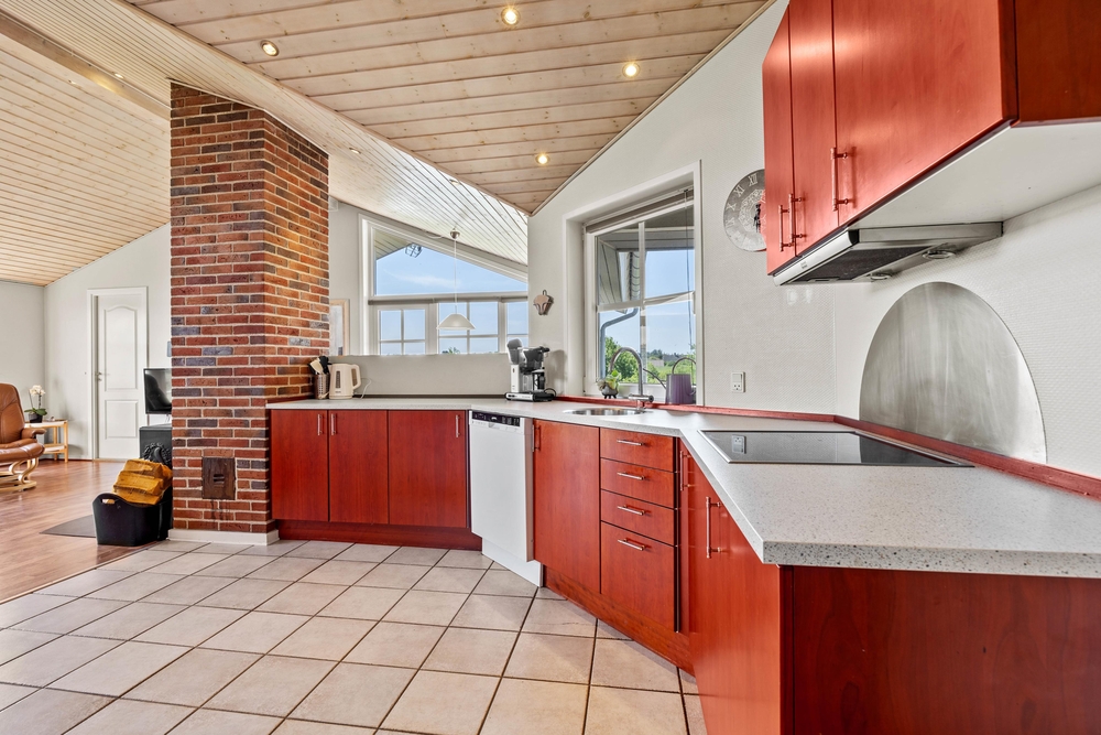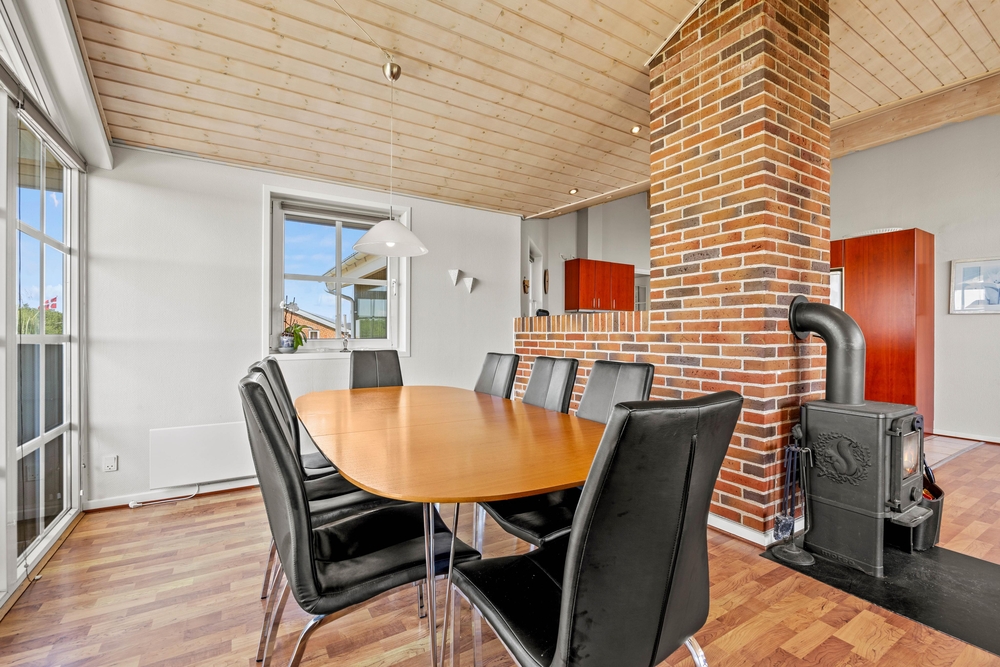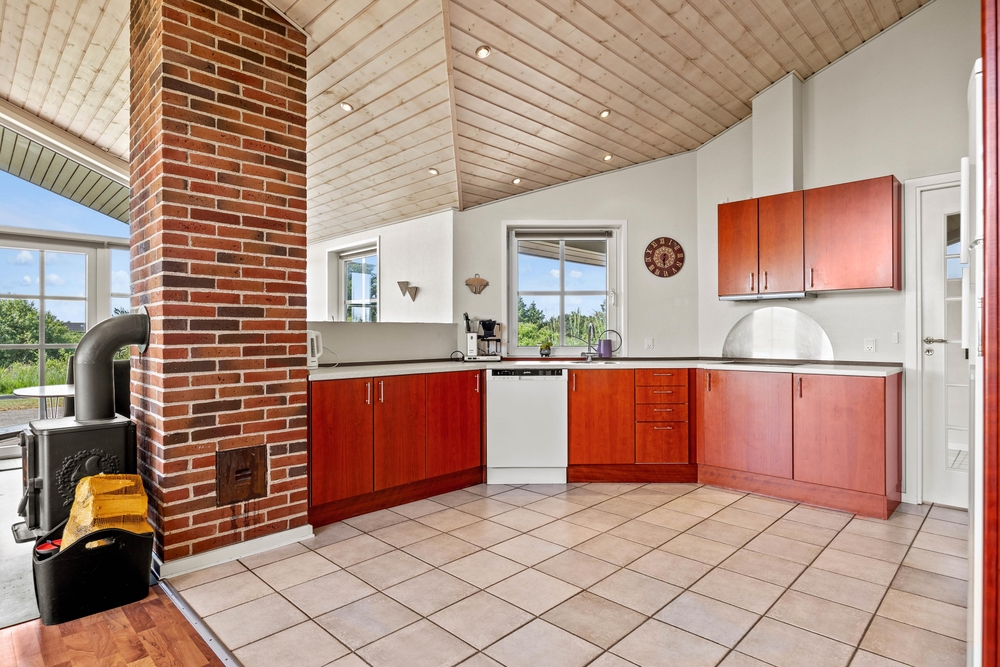 På de 120 velindrettede kvadratmeter på Lakolk 21 er der lagt vægt på hygge og samvær. I den lyse stue med trælaminatgulv kan I tænde op i brændeovnen og hygge jer sammen i sofagruppen. En snak og en kop kaffe eller et brætspil kan I også få i den lyse krog ved spisebordet. Det velindrettede køkken med klinkegulv indeholder alt, hvad I har brug for, når I vil forkæle hinanden med lækre hjemmelavede måltider. I kan lave en fælles madlavningsaften eller lade børnene og de unge stå for menuen en dag.
