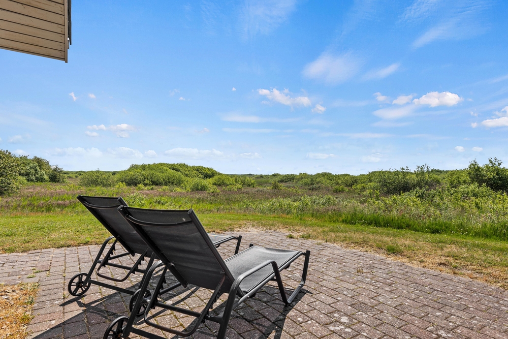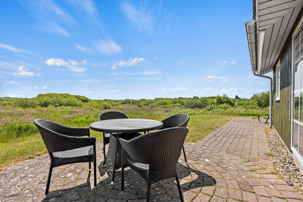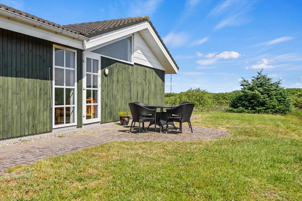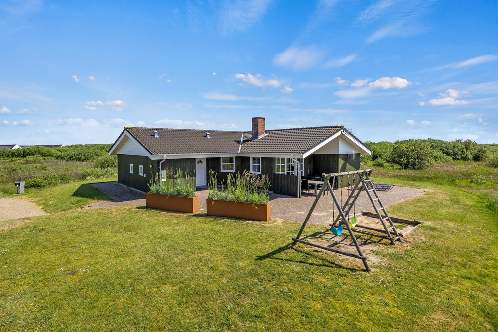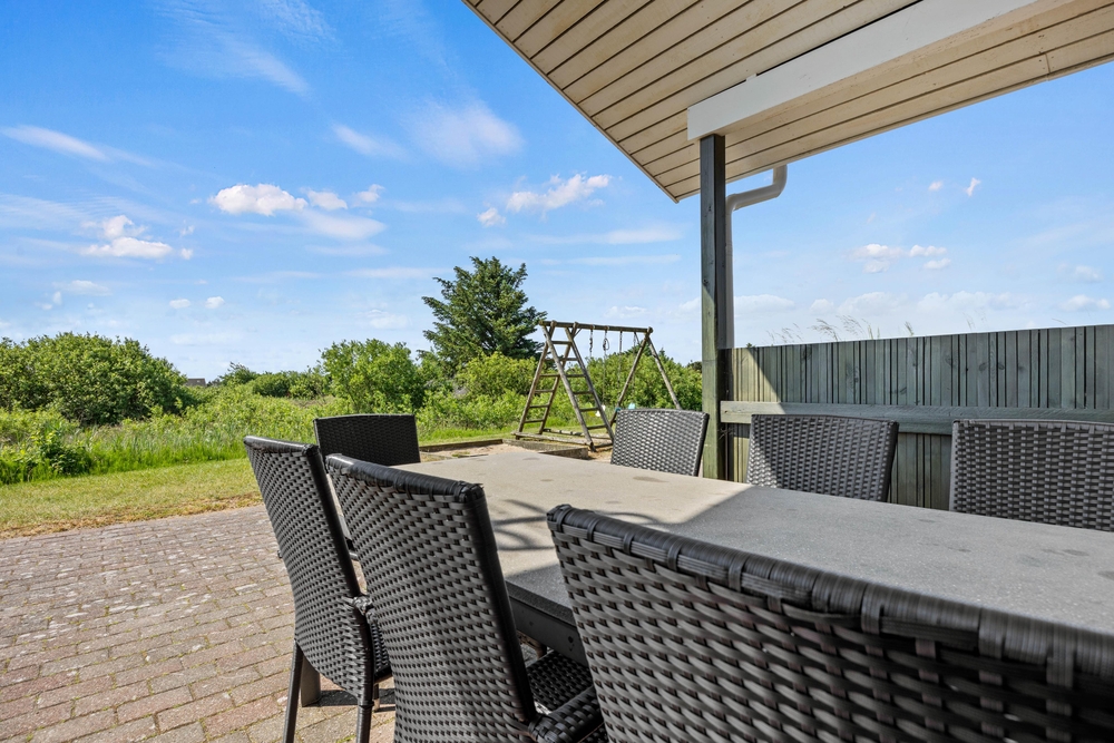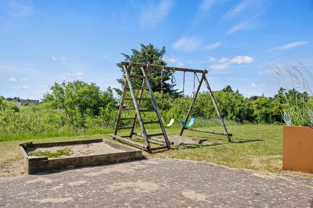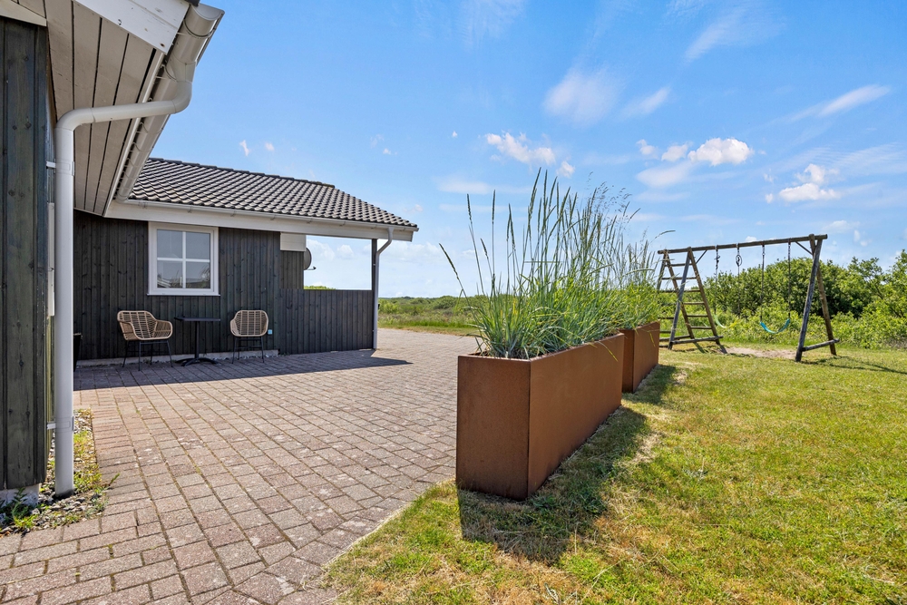 Terrassen ved sommerhuset har både et åbent og et overdækket afsnit, så her kan I rykke rundt efter solen. Tag solbad og slap af i havemøblerne, imens børnene leger i sandkassen og gyngerne. Tænd op i grillen til aften, og nyd et lækkert grillmåltid sammen, imens skyggerne bliver lange. Bagefter kan I nå en tur igennem klitlandskabet ned til stranden og opleve solnedgangen i Vesterhavet.