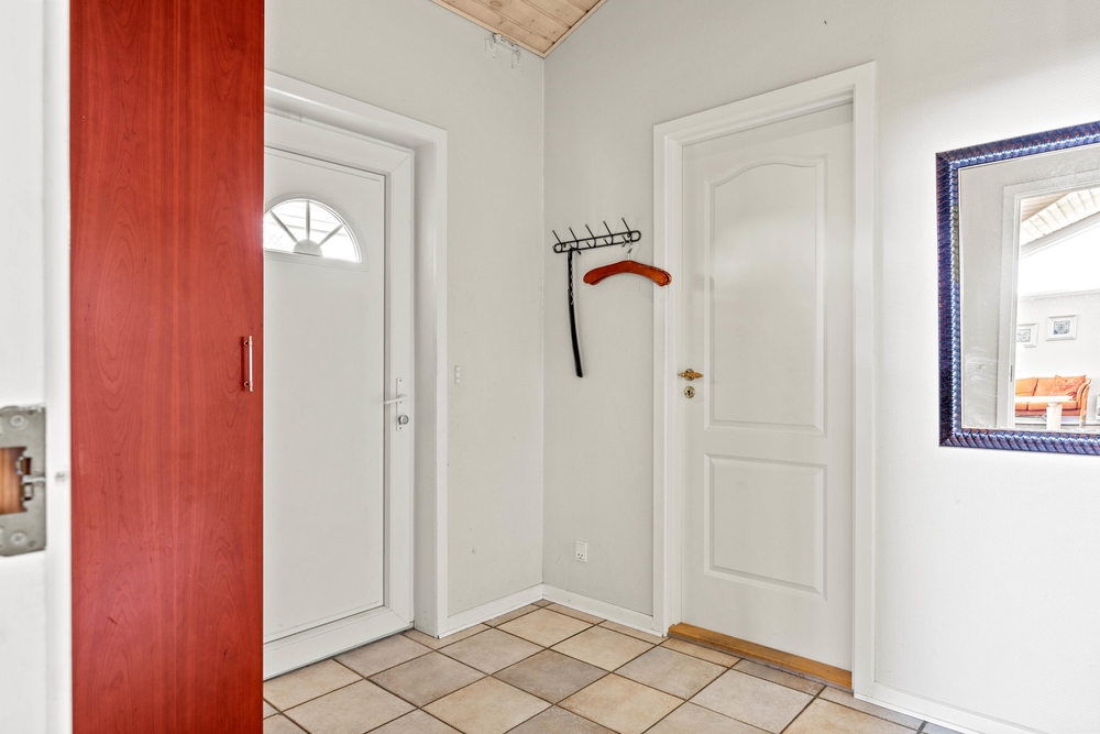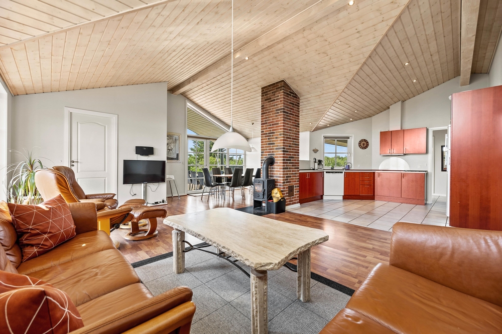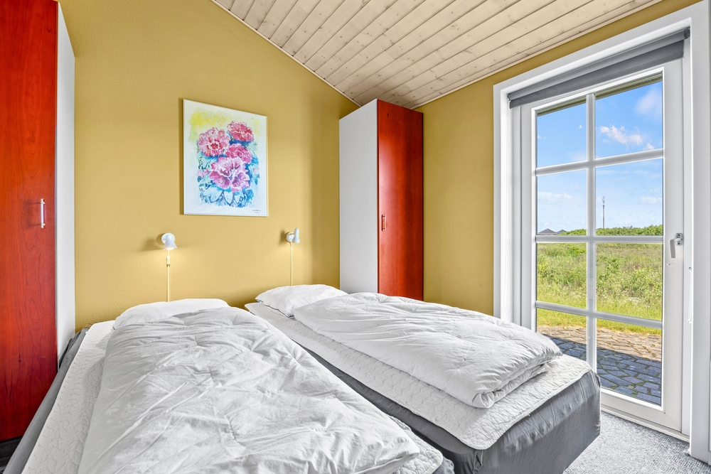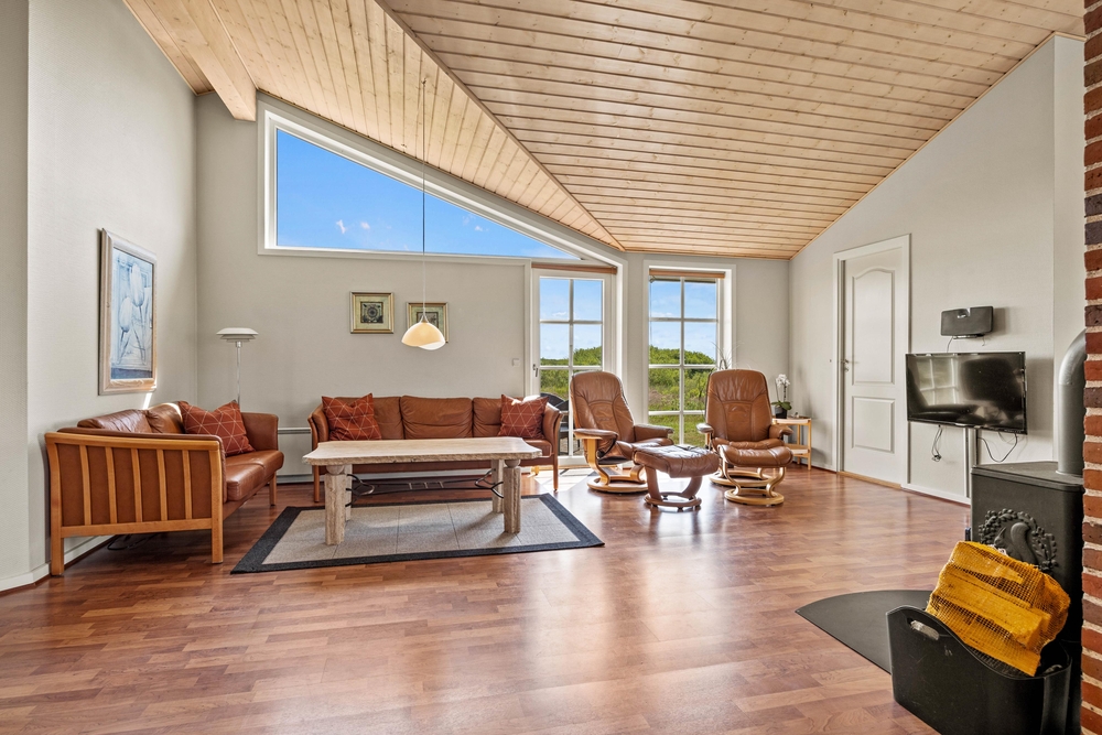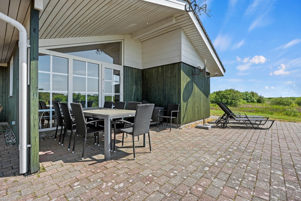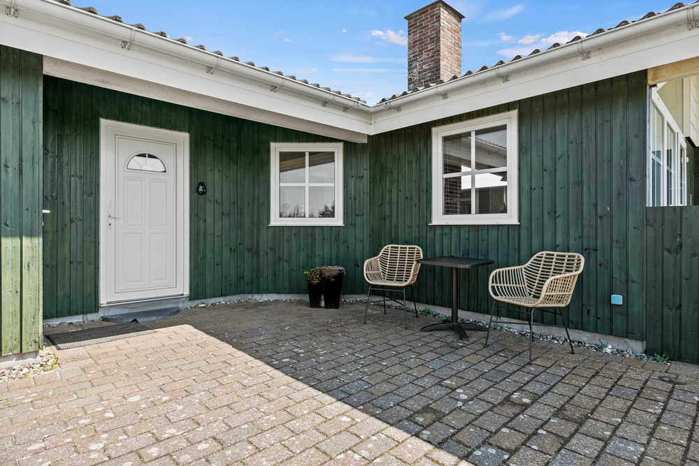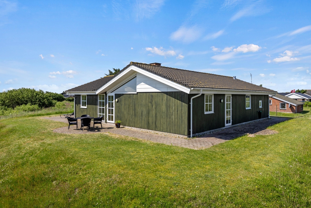 Terrassen ved sommerhuset har både et åbent og et overdækket afsnit, så her kan I rykke rundt efter solen. Tag solbad og slap af i havemøblerne, imens børnene leger i sandkassen og gyngerne. Tænd op i grillen til aften, og nyd et lækkert grillmåltid sammen, imens skyggerne bliver lange. Bagefter kan I nå en tur igennem klitlandskabet ned til stranden og opleve solnedgangen i Vesterhavet.