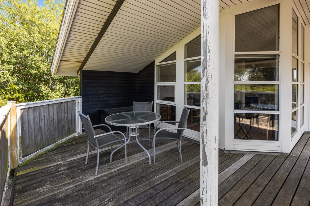 Indvendigt finder du eksempel på et traditionelt og klassisk indrettet sommerhus, som emmer af dansk sommerhusferie. I det store køkkenalrum og stue kan hele familien samles om fælles madlavning, og I kan samtidig hygge jer i udestuen med brændeovnen tændt. Trænger I til afslapning er det også muligt at fylde husets spa og læne sig tilbage deri.