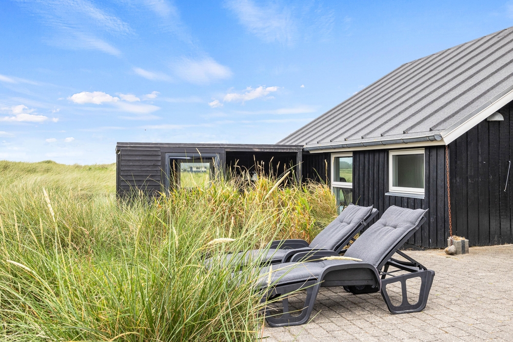 På terrassen står naturligvis havemøbler og liggestole klar til jer, og til aften kan I tænde op i grillen og tilberede en lækker grillmiddag, der kan nydes i det lune vejr, mens Vesterhavets bølger bruser i baggrunden.
