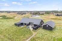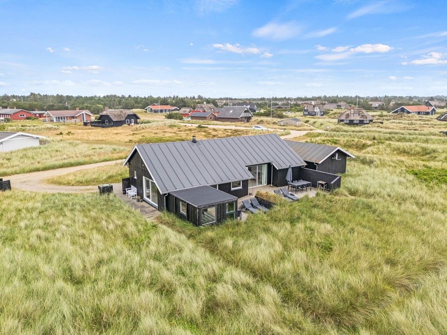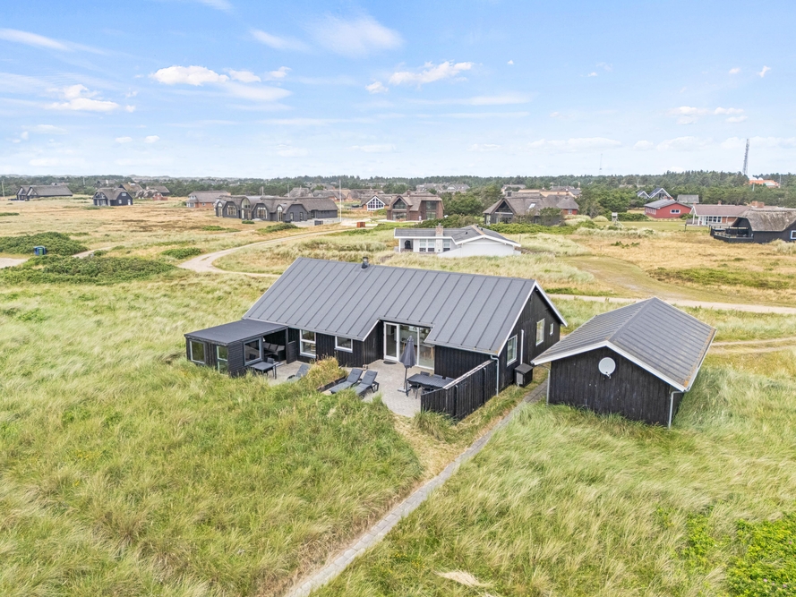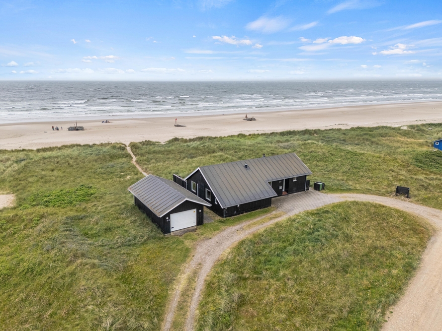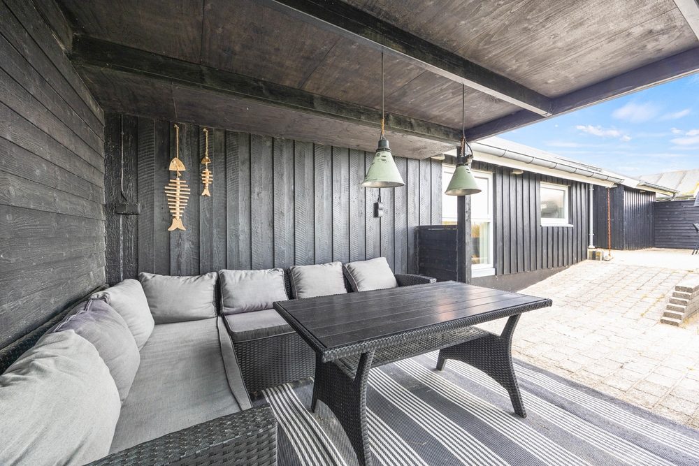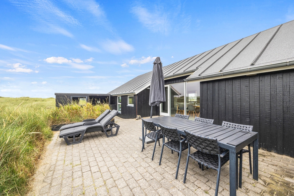 Sommerhuset har en skøn terrasse, hvorfra I har en smuk udsigt over strandlandskabet ? huset ligger lige bag den yderste klitrække; derefter er I på stranden. En del af terrassen er afskærmet og overdækket, så her kan I nyde feriedagen, selv hvis der skulle komme en lille regnbyge eller et friskt vindpust.