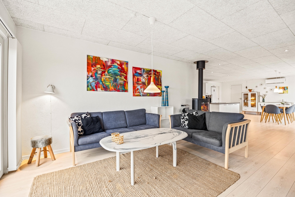 Sommerhusets samlingspunkt vil uden tvivl være i alrummet, hvor I har en skøn udsigt til den omkringliggende natur og havet ? udsigten breder sig ud i al sin herlighed med det samme, man træder ind i stuen. Her kan I sætte jer godt til rette i sofaen, nyde udsigten, holde en hyggelig filmaften med brændeovnens knitren og varme i baggrunden. Der er danske og tyske tv-kanaler i sommerhuset.