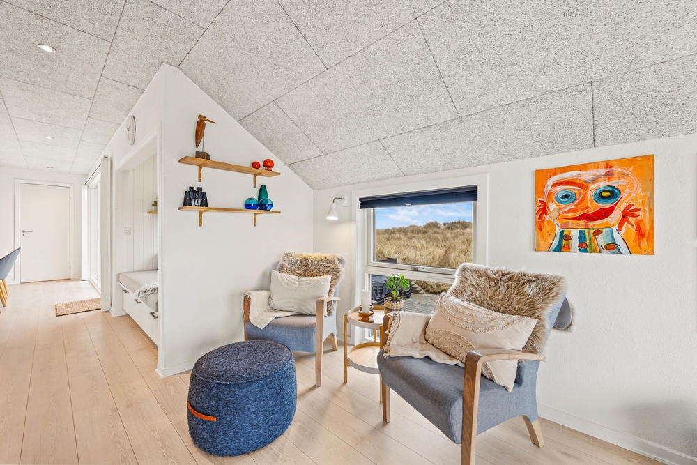 Straks I træder ind i sommerhuset, vil I føle jer hjemme og mærke den hyggelige sommerhusstemning. De lyse lofter og vægge gør sommerhuset indbydende, og sammen med de store vinduespartier i alrummet er der en god og hyggelig atmosfære.