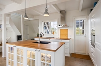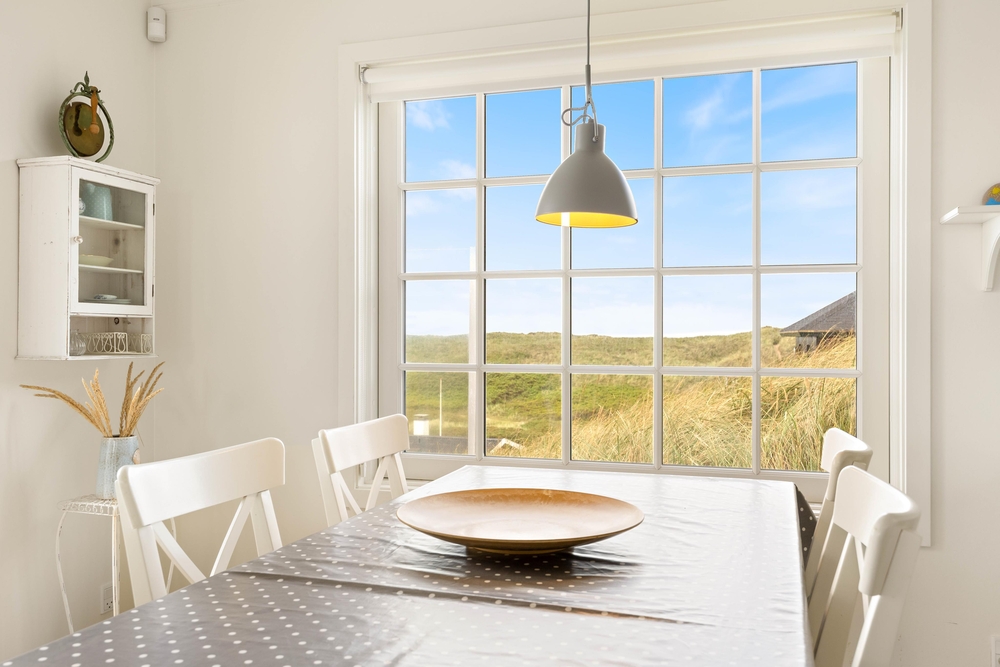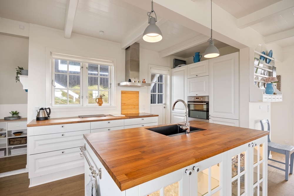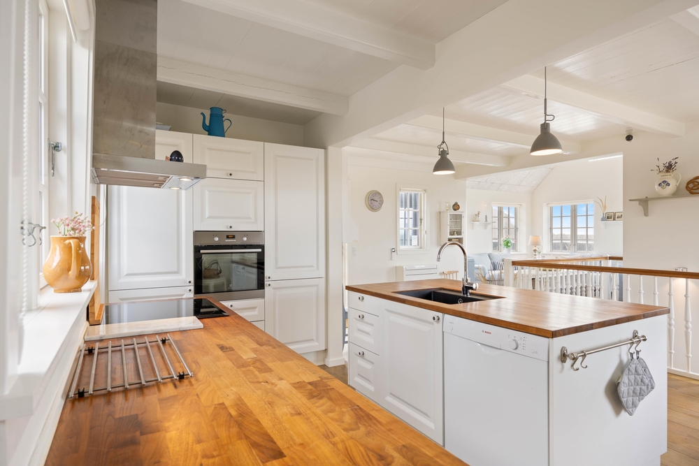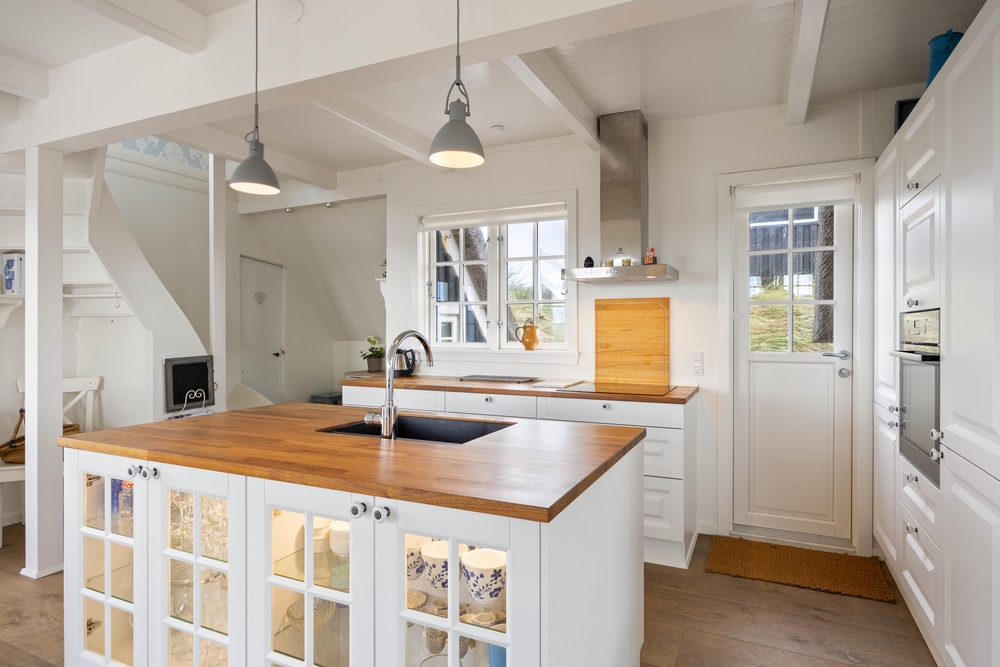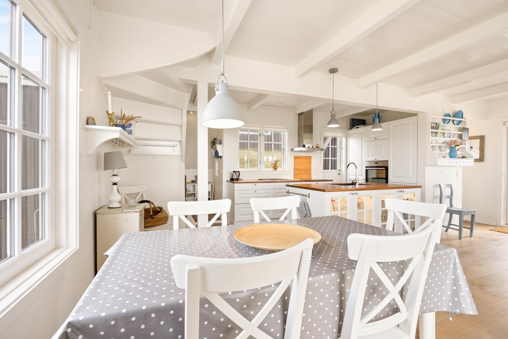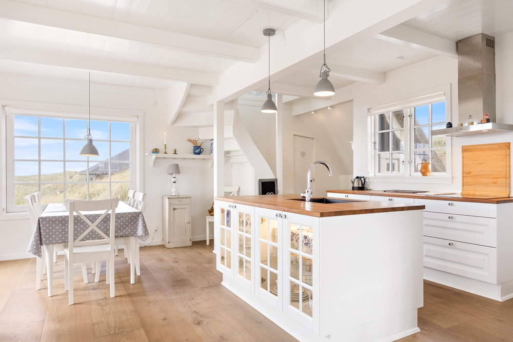 I samme plan finder I det åbne samtalekøkken i romantisk stil med koge-ø og spiseplads i den ene ende af lokalet. Under morgenmaden, middagen og lignende kan I nyde den skønne udsigt over den omkringliggende natur. Der er altså rig mulighed for, at I rigtig kan nyde hinandens selskab i disse skønne rammer. I stueetagen finder I også et lille toilet.