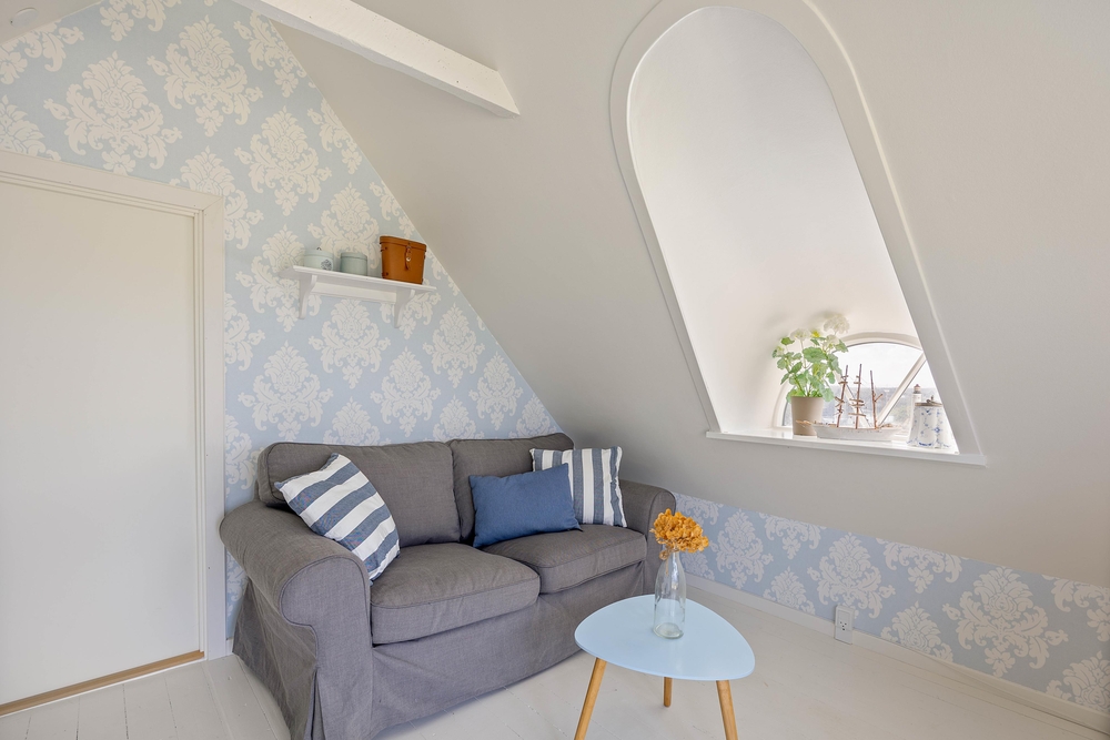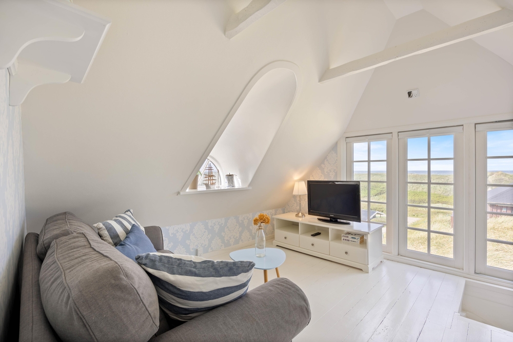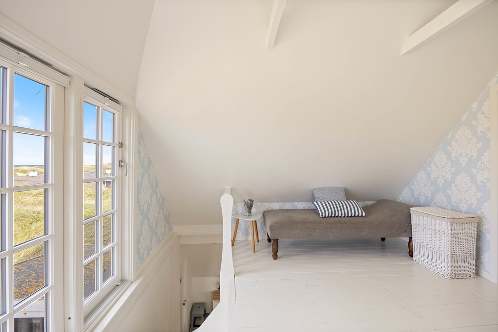 Når I begiver jer op på første sal er der ydermere et lille opholdsrum med fjernsyn, hvor I herfra også kan nyde den fantastiske havudsigt imens i hygger jer med et glas vin eller lignende i sofaen. Heroppe finder I også et soverum med dobbeltseng. Desuden finder i el-radiatorer, der hjælper til, at I kan opnå en behagelig temperatur.