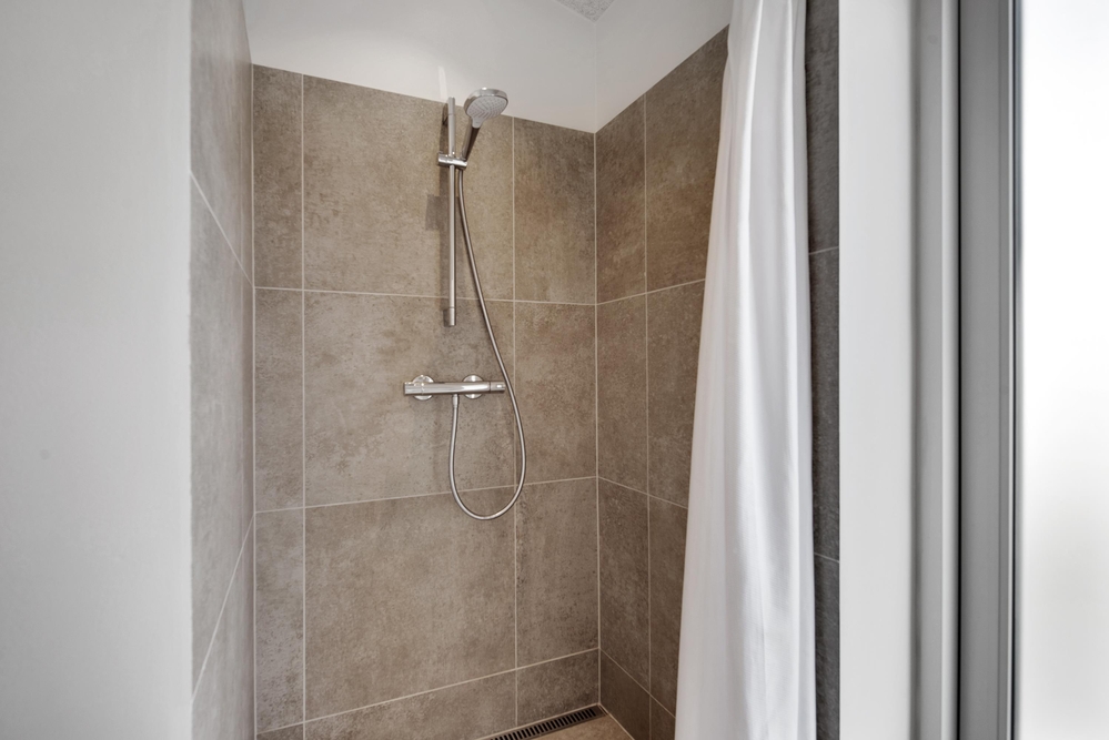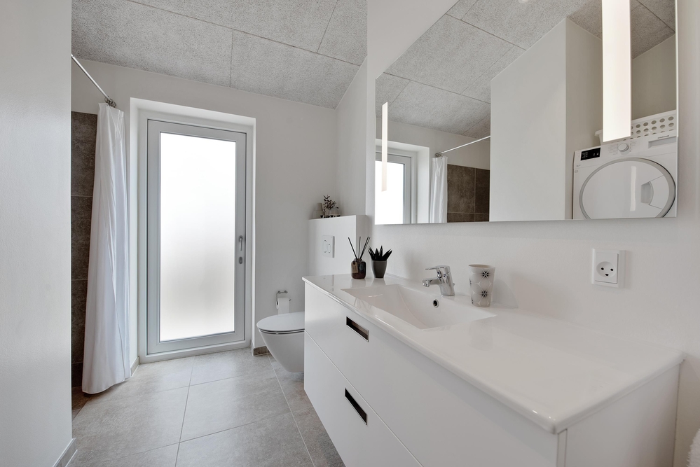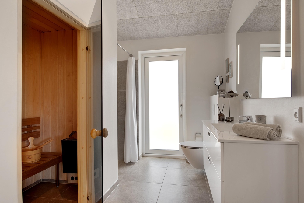 Begge badeværelser er topmoderne, hvoraf det ene er med sauna. På badeværelset findes også vaskemaskine, tørretumbler og pusleplads. Desuden er feriehuset godt isoleret, hvilket også hjælper med til at holde forbruget nede.