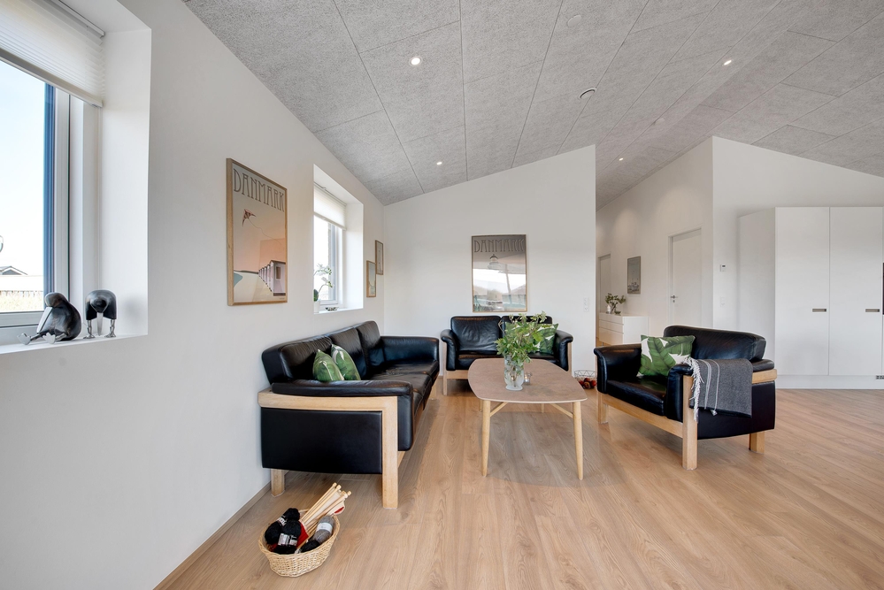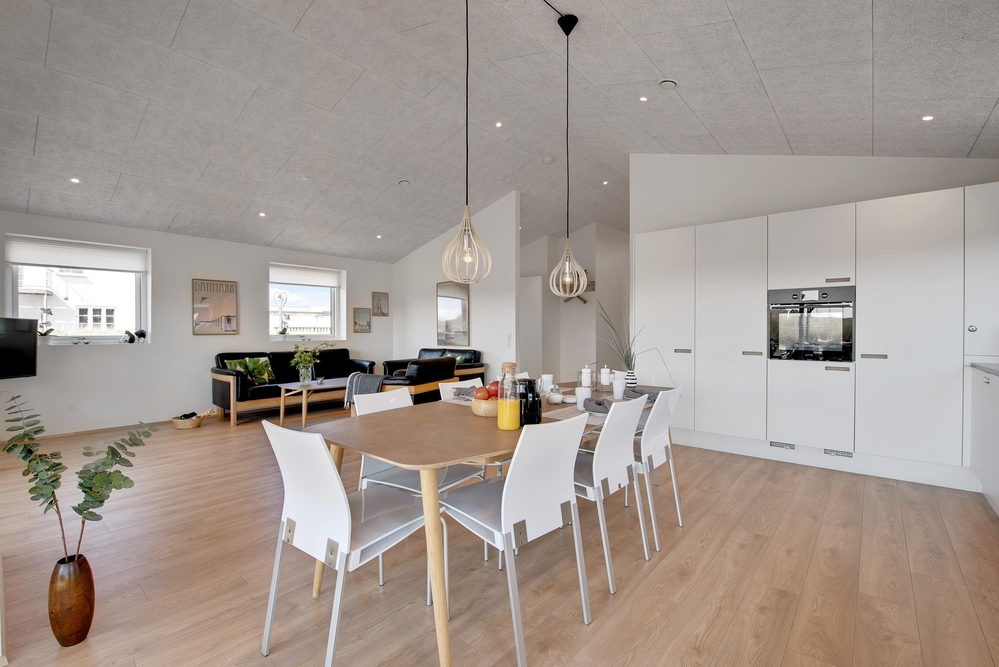 Her er tænkt på det hele. Troldtek-lofter garanterer en fantastisk akustik, genvex-anlæg giver et frisk indeklima, og med gulvvarme i samtlige rum har I garanteret en behagelig ensartet opvarmning i de kolde måneder.