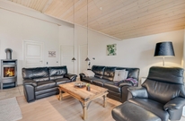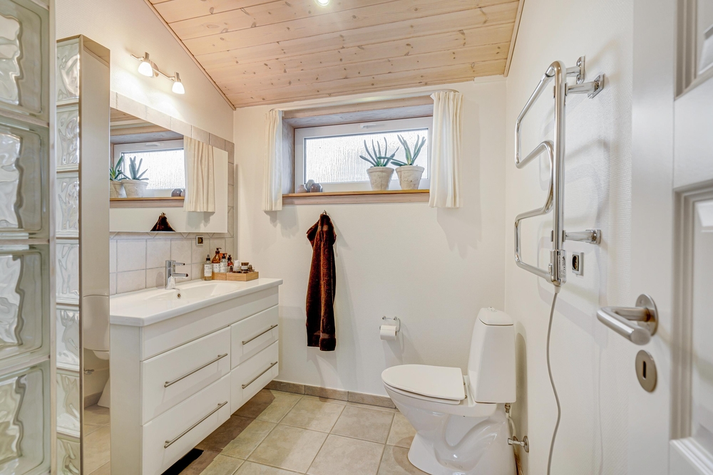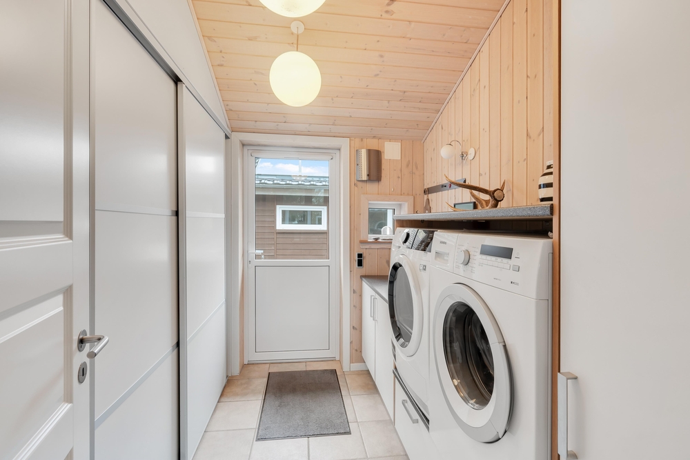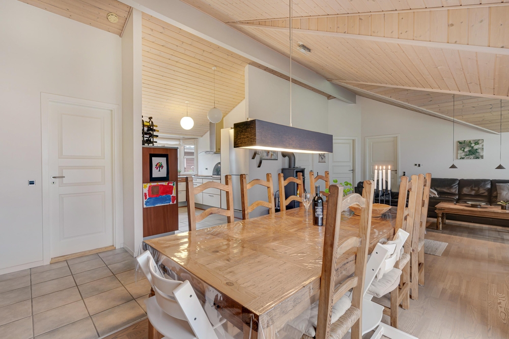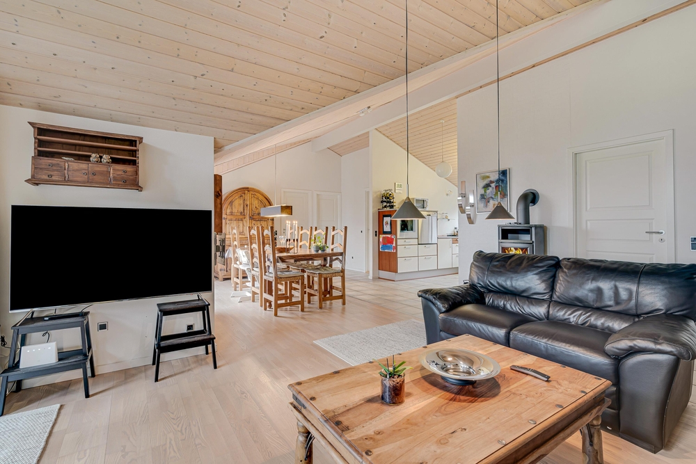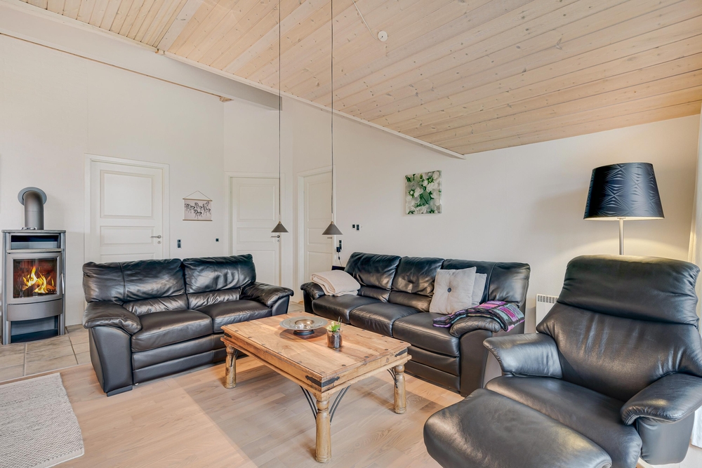 Feriehusets stue har både laminatgulv, klinker samt gulvvarme. I stuen finder du en brændeovn, men ønsker I en hurtig opvarmning af feriehuset, kan dette gøres med den energibesparende varmepumpe.