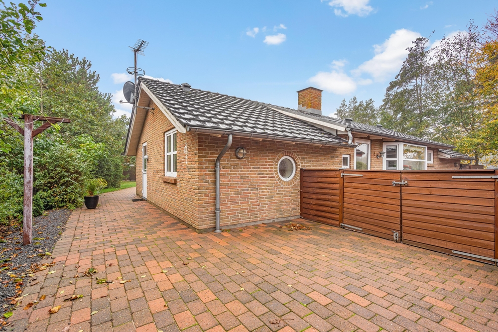 Feriehuset på Lukkebjerg 7B har også et dejligt udeområde. Feriehuset har en terrasse med havemøbler og grill, hvor der nemt kan grilles pølser og andet, mens der holdes øje med børnene, som måske har fundet på at spille bold på plænegrunden.