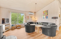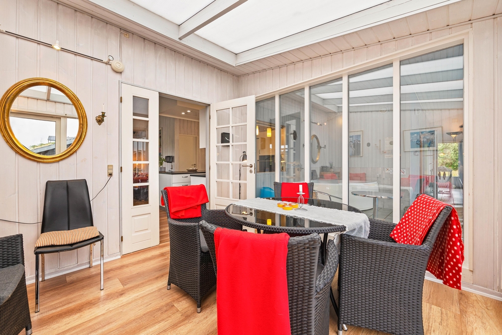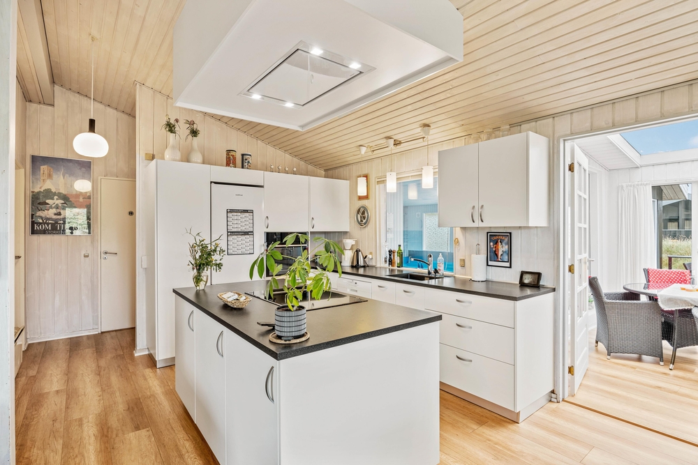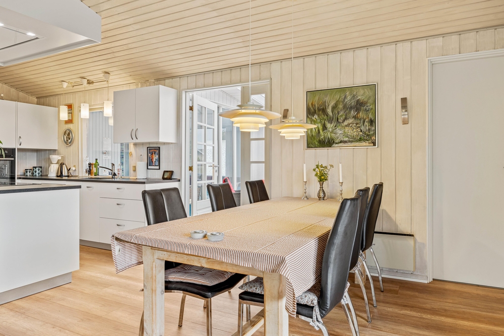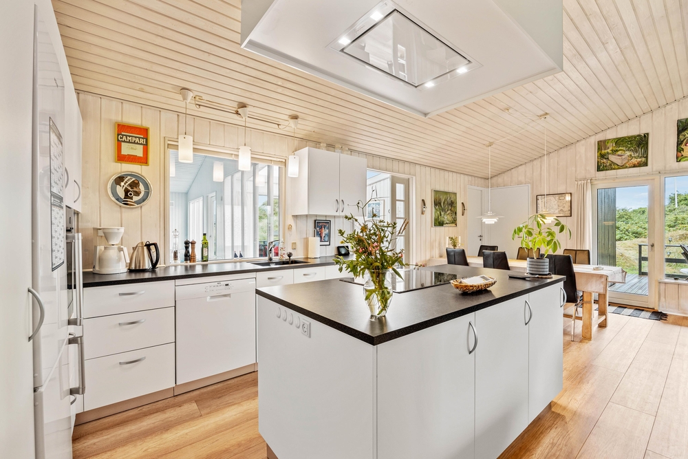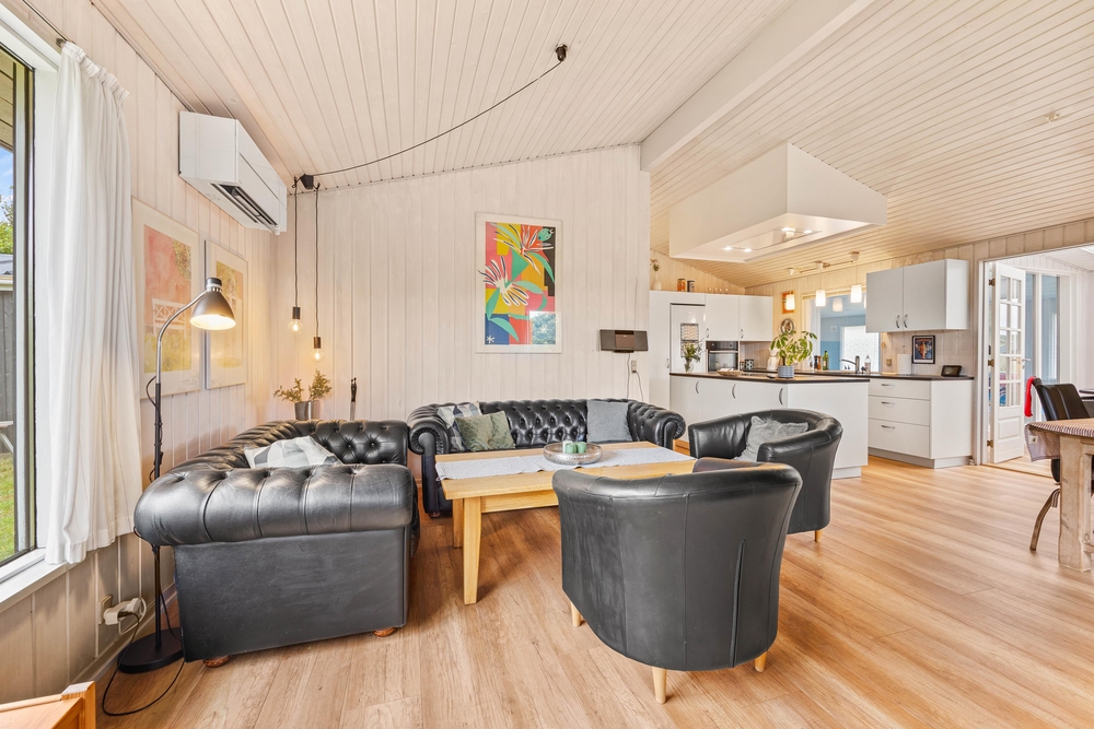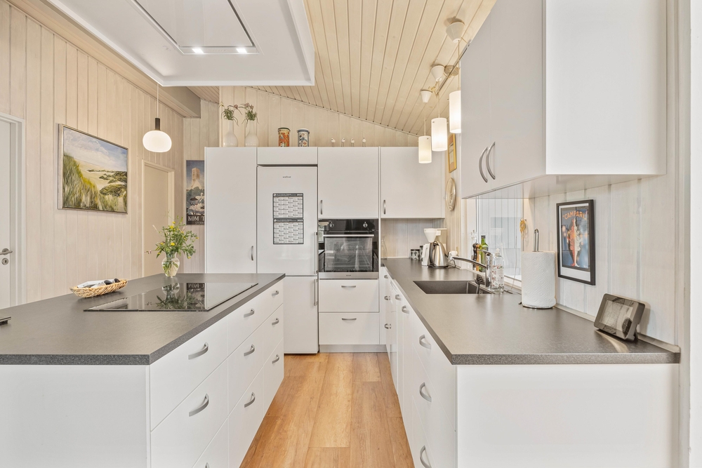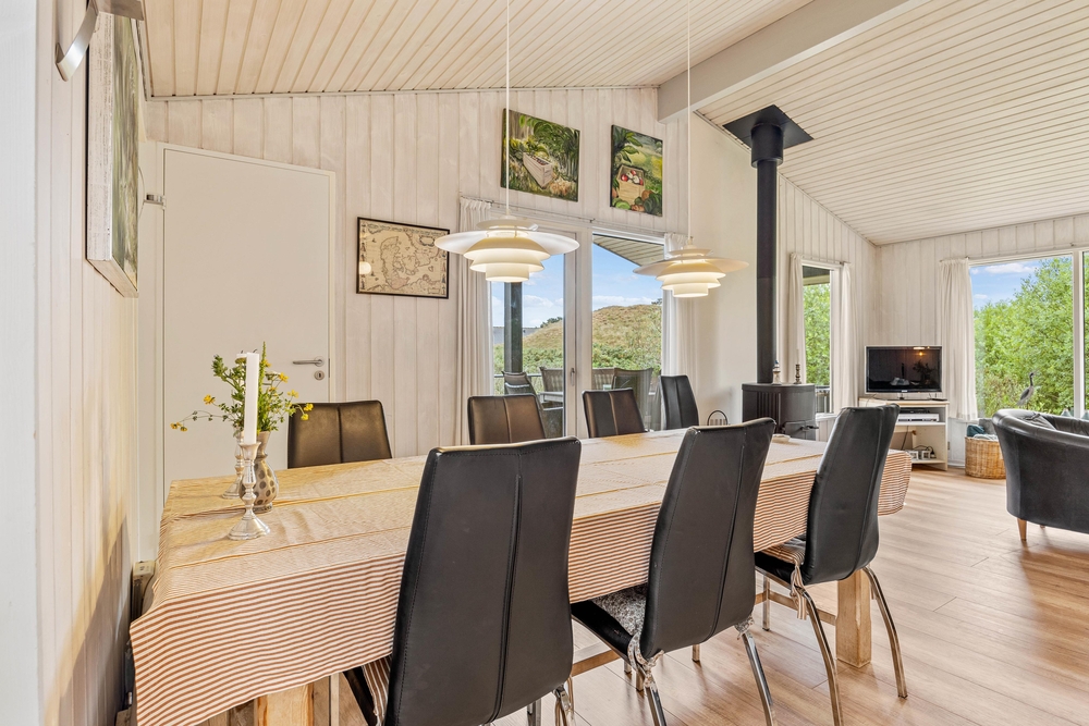 I dette 4-stjernet sommerhus vil I hurtigt mærke feriestemningen sænke sig over jer. Her er alrummet indrettet med et stort åbent køkken med opvaskemaskine og induktionskomfur, med god plads til madlavning og en spiseplads i åben forbindelse til stuen, hvor I kan samles til en hyggeaften i de komfortable sofaer, med en god film i fjernsynet eller et brætspil, alt imens brændeovnen sørger for den rette hyggefaktor med den sagte knitren i baggrunden