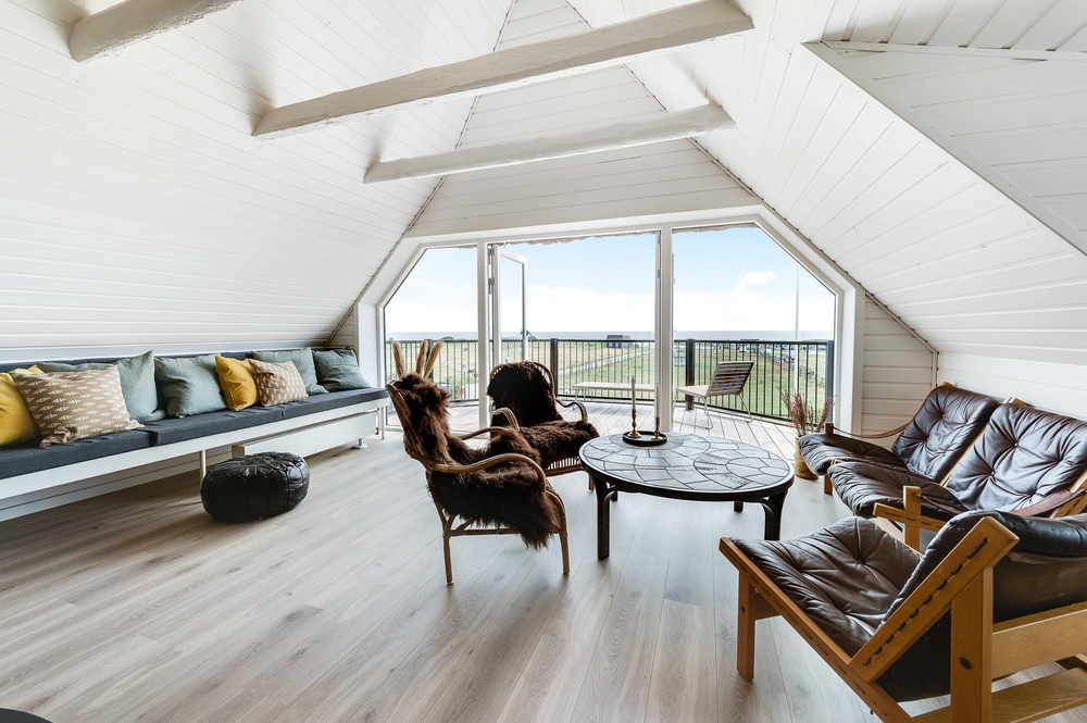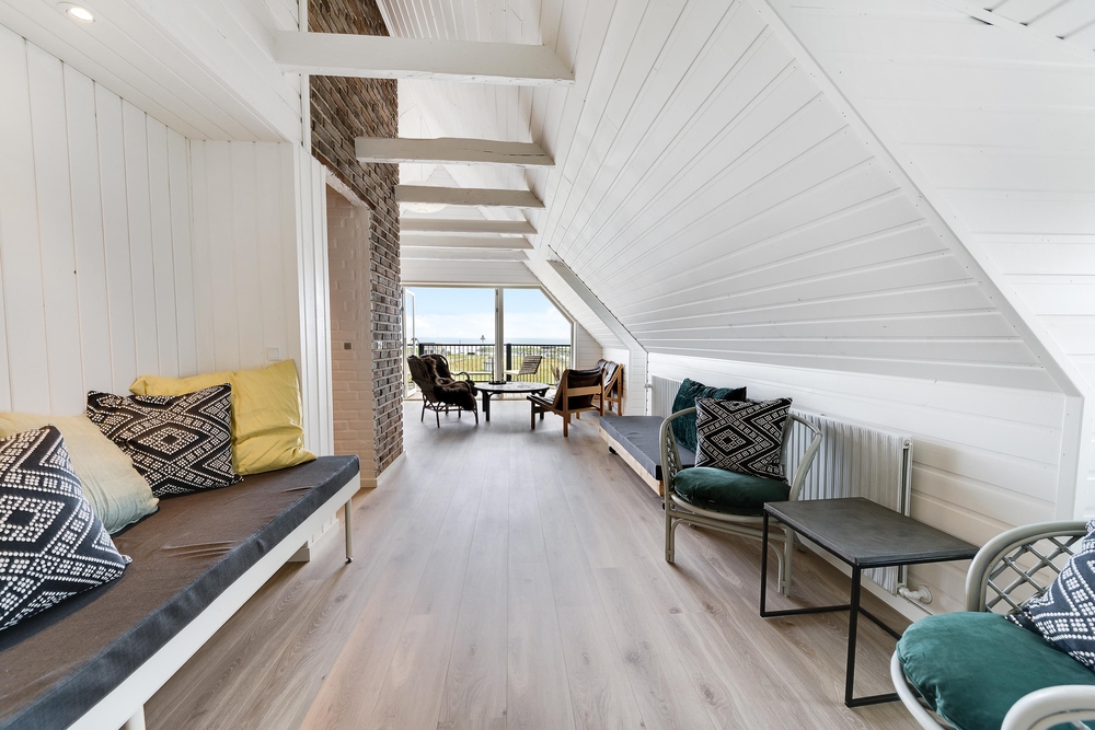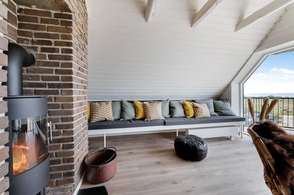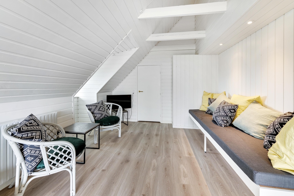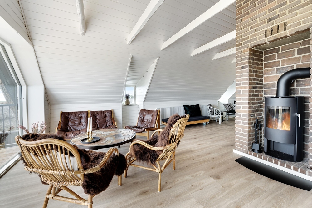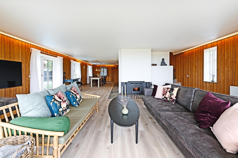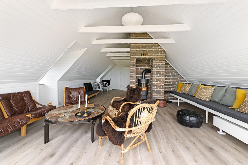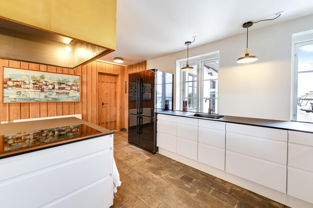 Både i stueetagens og 1.-salens opholdsområde er der kamin og en fantastisk fjordudsigt gennem de store vinduespartier. Der er i hele indretningen værnet om husets originale stil: Kombinationen af hvidmalede vægge, originale trævægge og forskellige træ- og stengulve gør stemningen i huset både hyggelig og moderne.