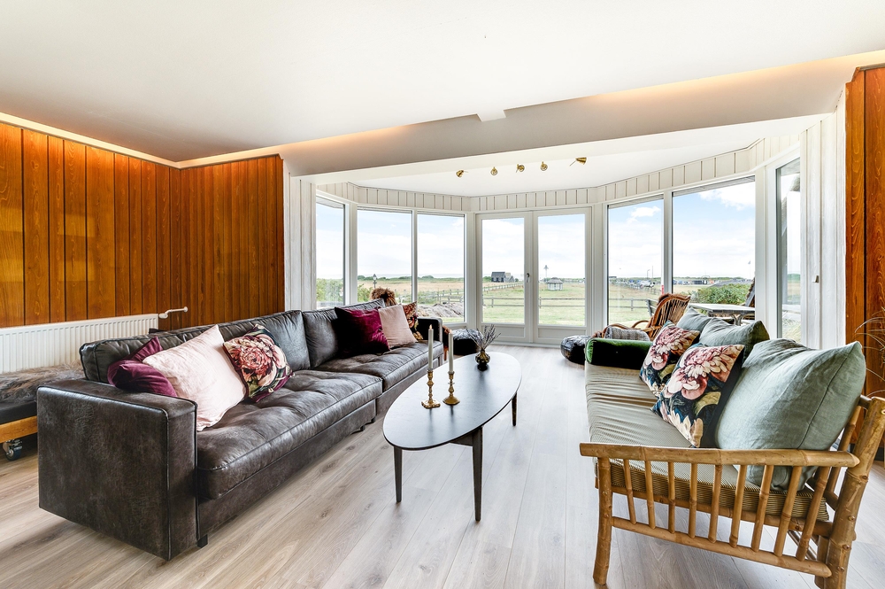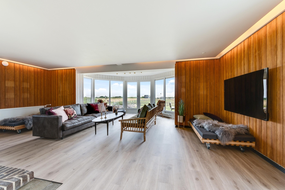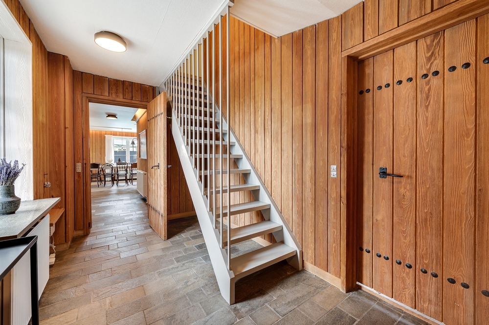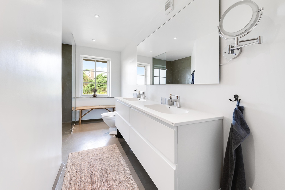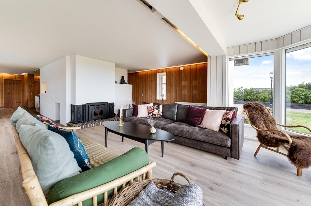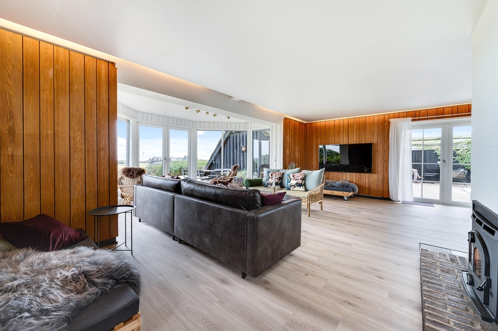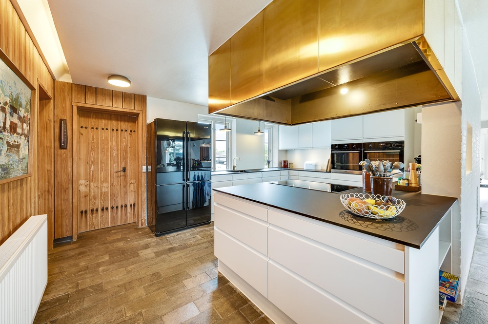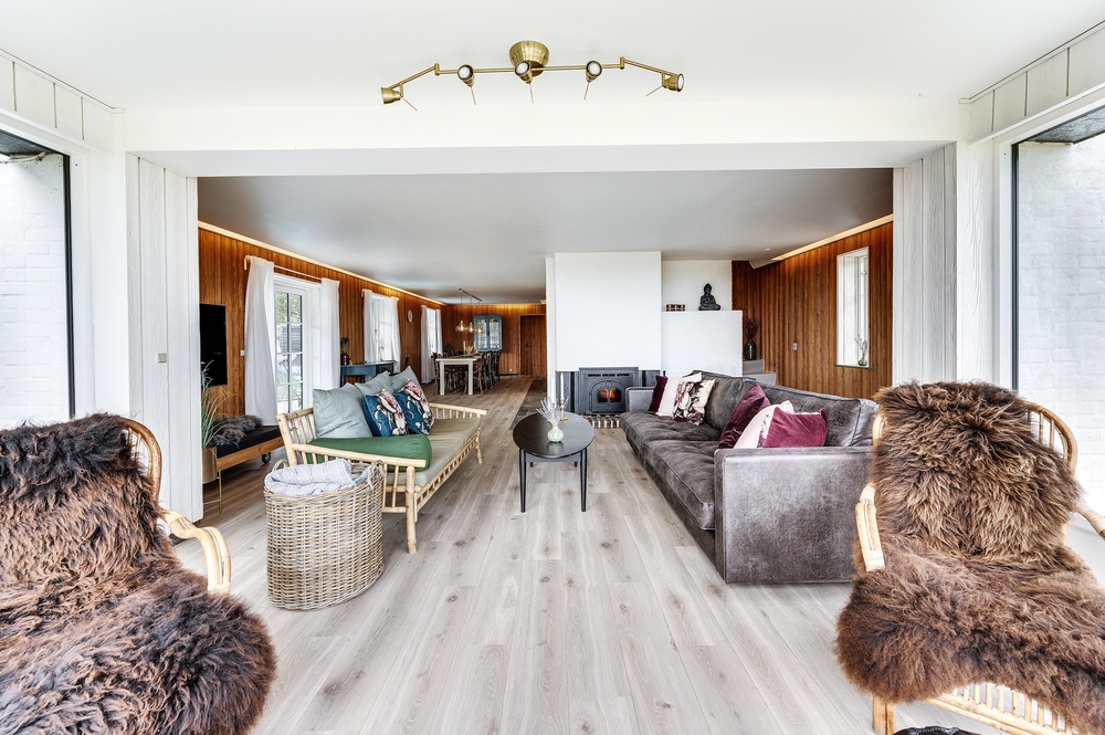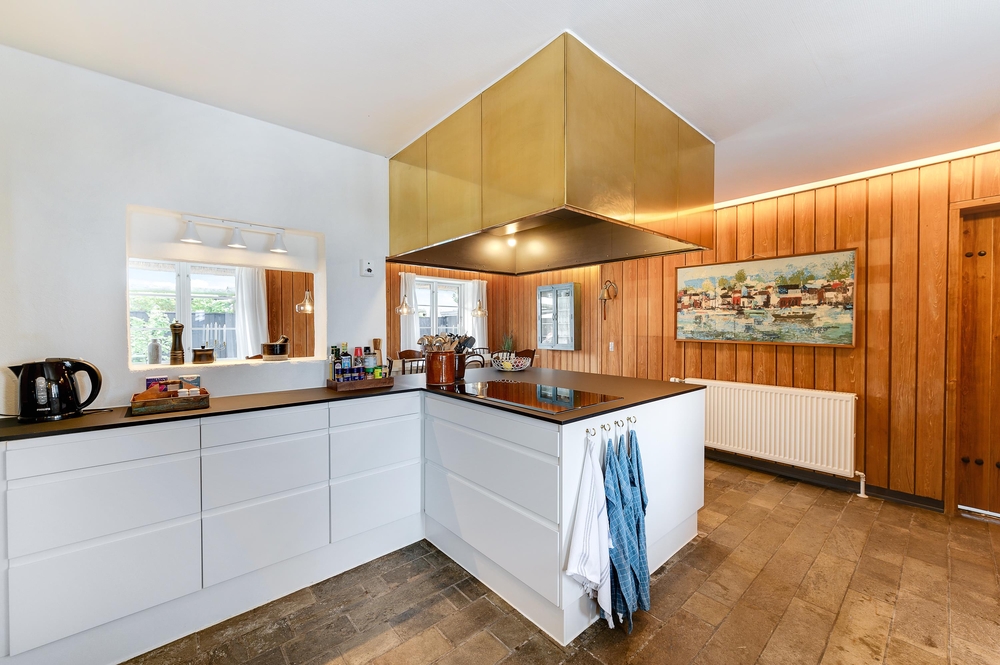 Både i stueetagens og 1.-salens opholdsområde er der kamin og en fantastisk fjordudsigt gennem de store vinduespartier. Der er i hele indretningen værnet om husets originale stil: Kombinationen af hvidmalede vægge, originale trævægge og forskellige træ- og stengulve gør stemningen i huset både hyggelig og moderne.