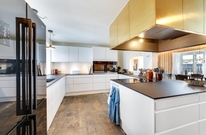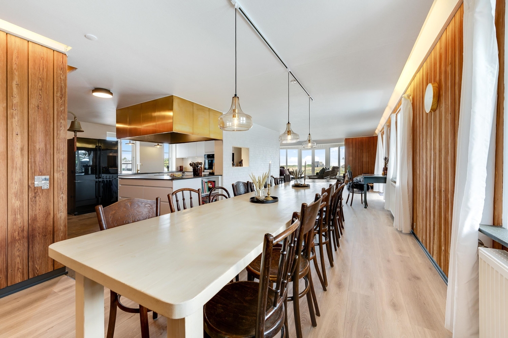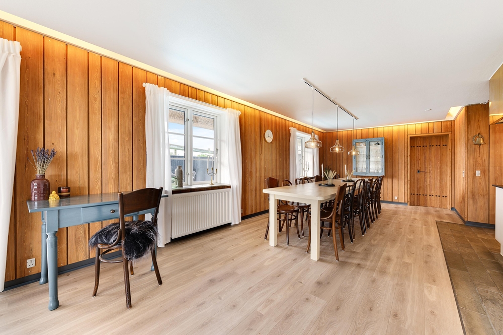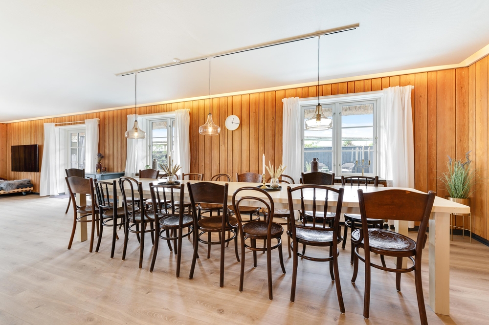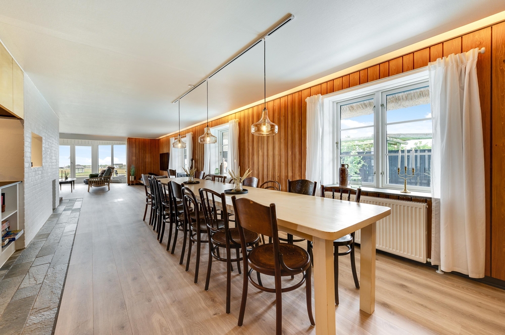 Det moderne køkken er rigt udstyret: Her er både 2 ovne, 2 køleskabe med frysere og opvaskemaskine. Fra køkkenet er der direkte forbindelse til spiseområdet, hvor hele ferieflokken kan samles til en lækker middag om det lange spisebord. Herfra kan I gå videre ud til poolen på terrassen.