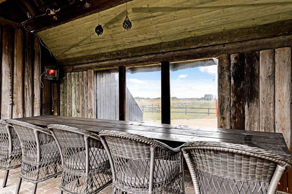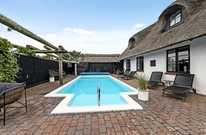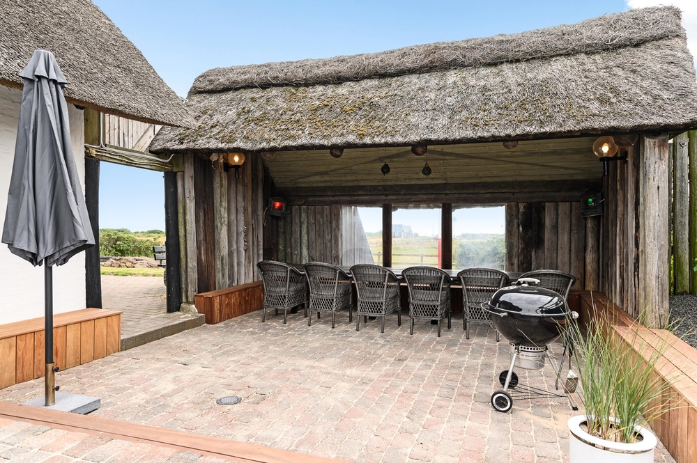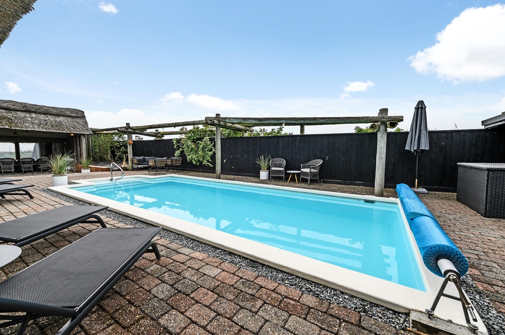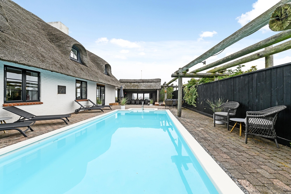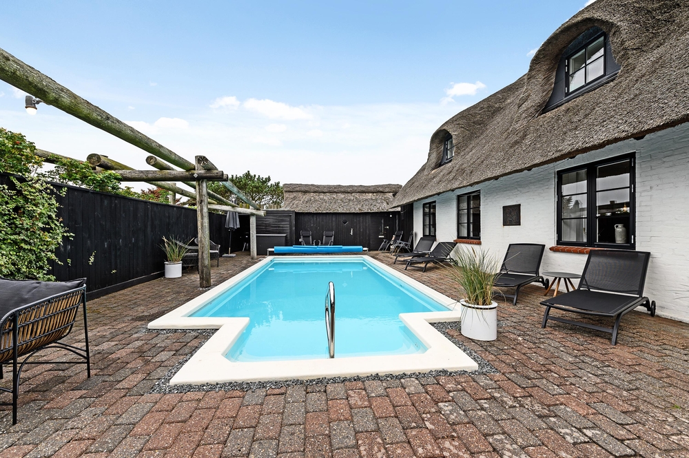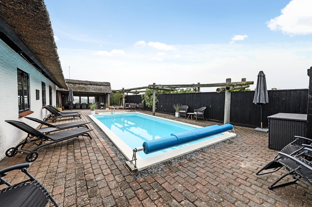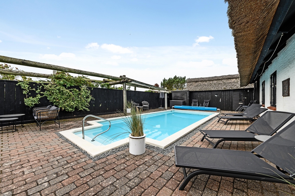 På den store terrasse langs siden af feriehuset finder I den dejlige udendørs pool, som I kan tage en morgendukkert i fra maj til og med oktober. Alt efter temperaturen udendørs, opvarmes poolen fra 16-26 grader af et solaranlæg. Mellem svømmeturene i poolen kan I solbade på liggestolene langs poolkanten eller nyde en kold drink i skyggen på den overdækkede terrasse.