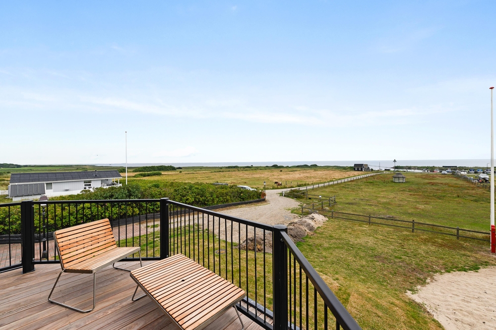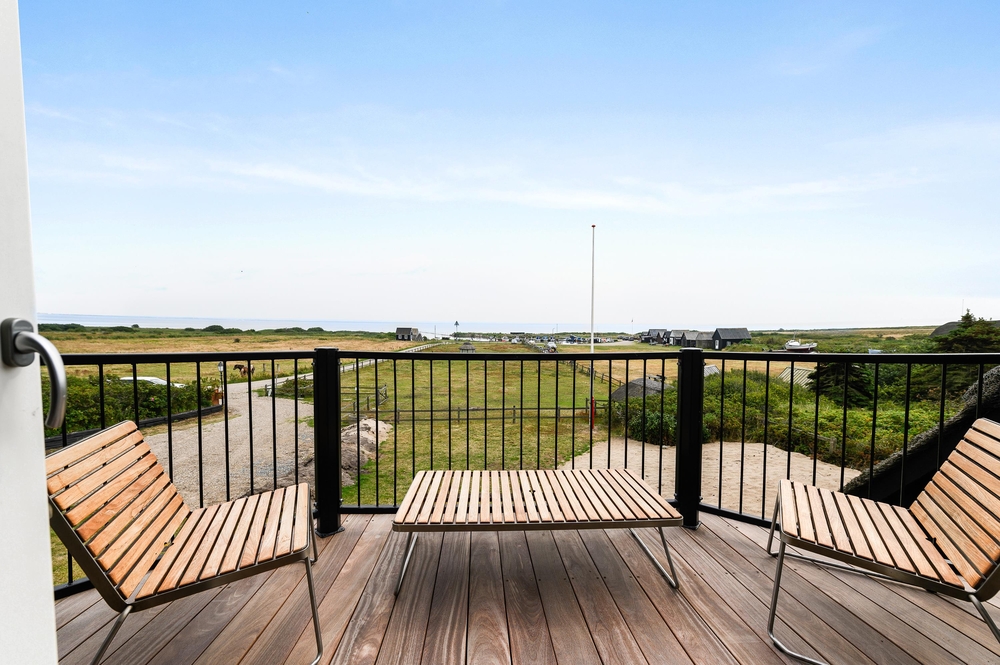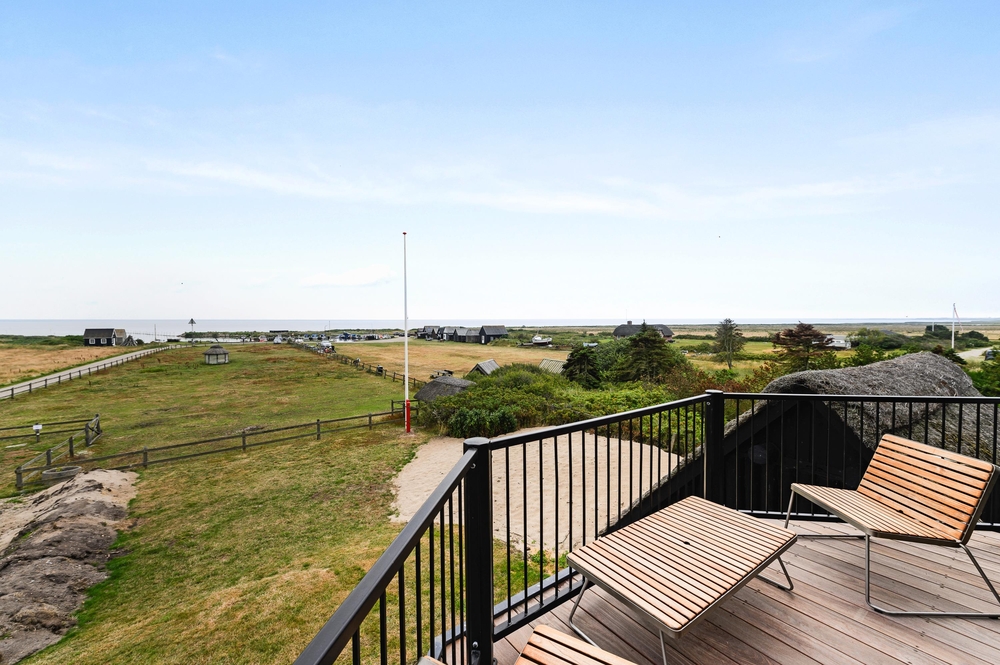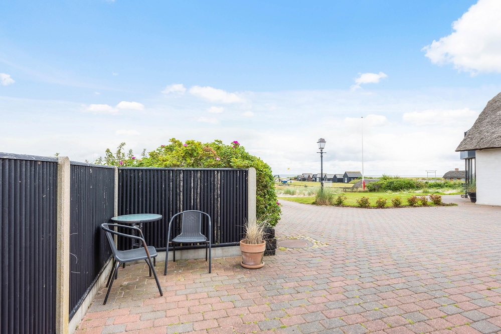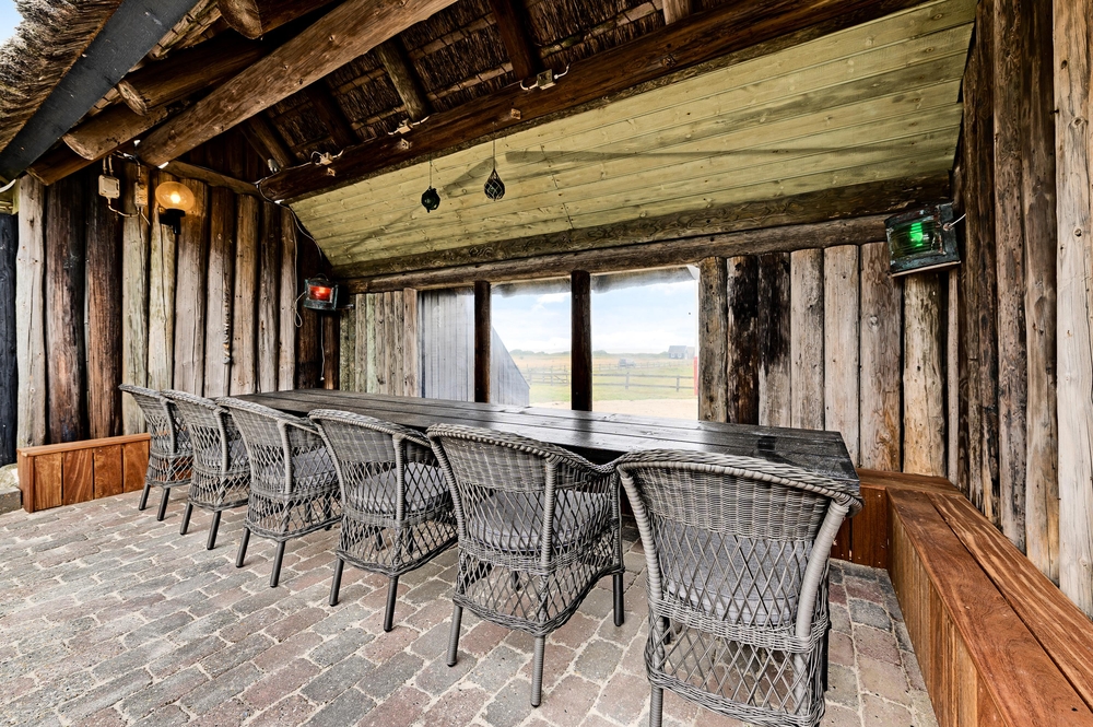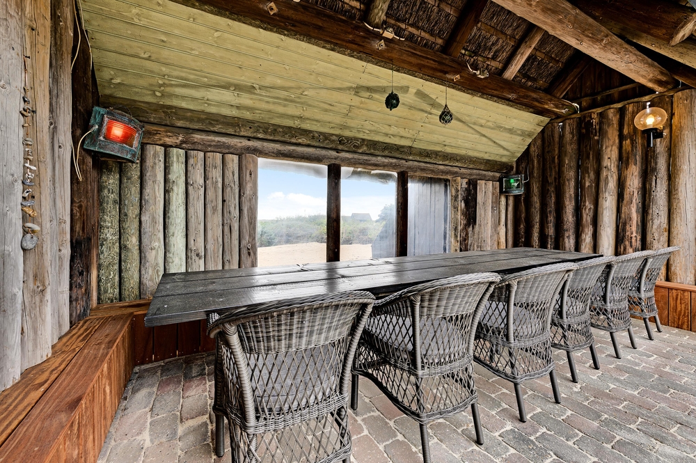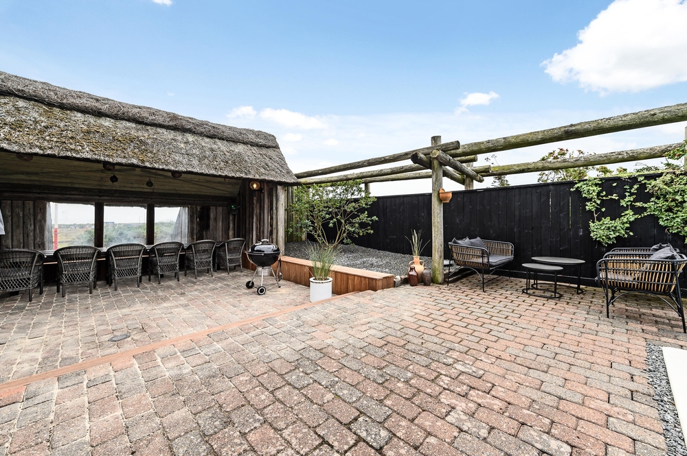 På den store terrasse langs siden af feriehuset finder I den dejlige udendørs pool, som I kan tage en morgendukkert i fra maj til og med oktober. Alt efter temperaturen udendørs, opvarmes poolen fra 16-26 grader af et solaranlæg. Mellem svømmeturene i poolen kan I solbade på liggestolene langs poolkanten eller nyde en kold drink i skyggen på den overdækkede terrasse.