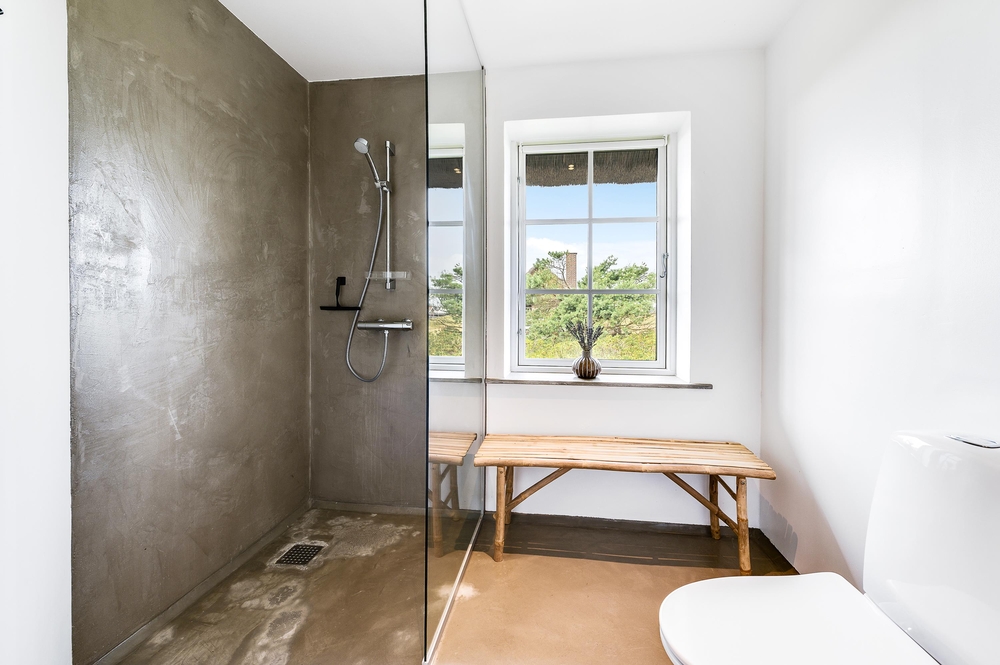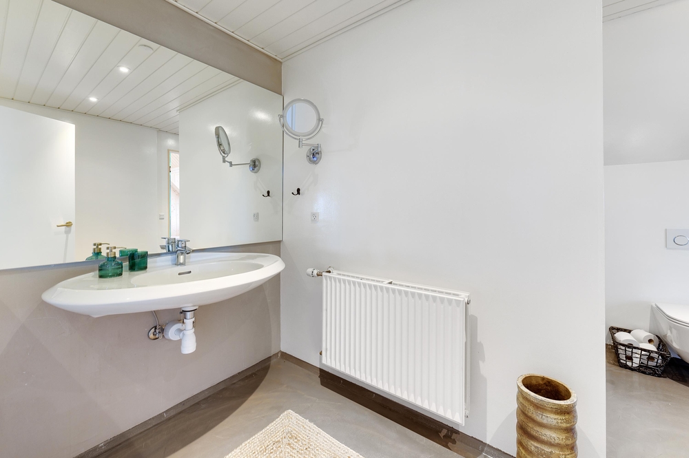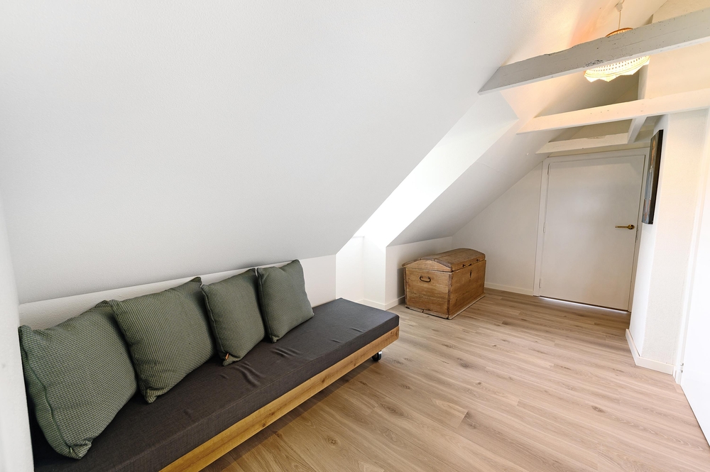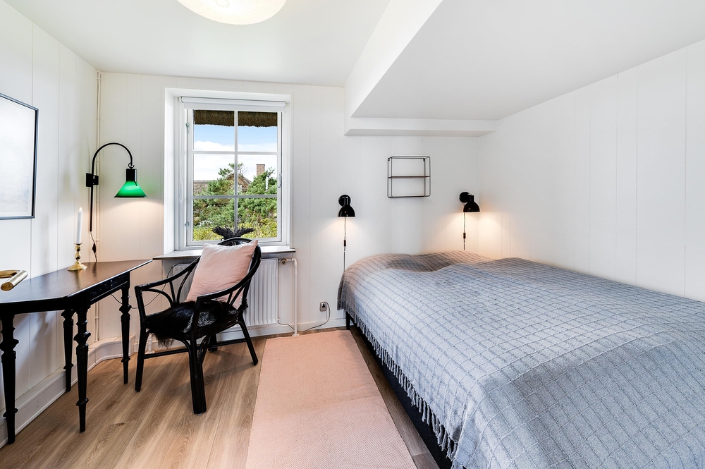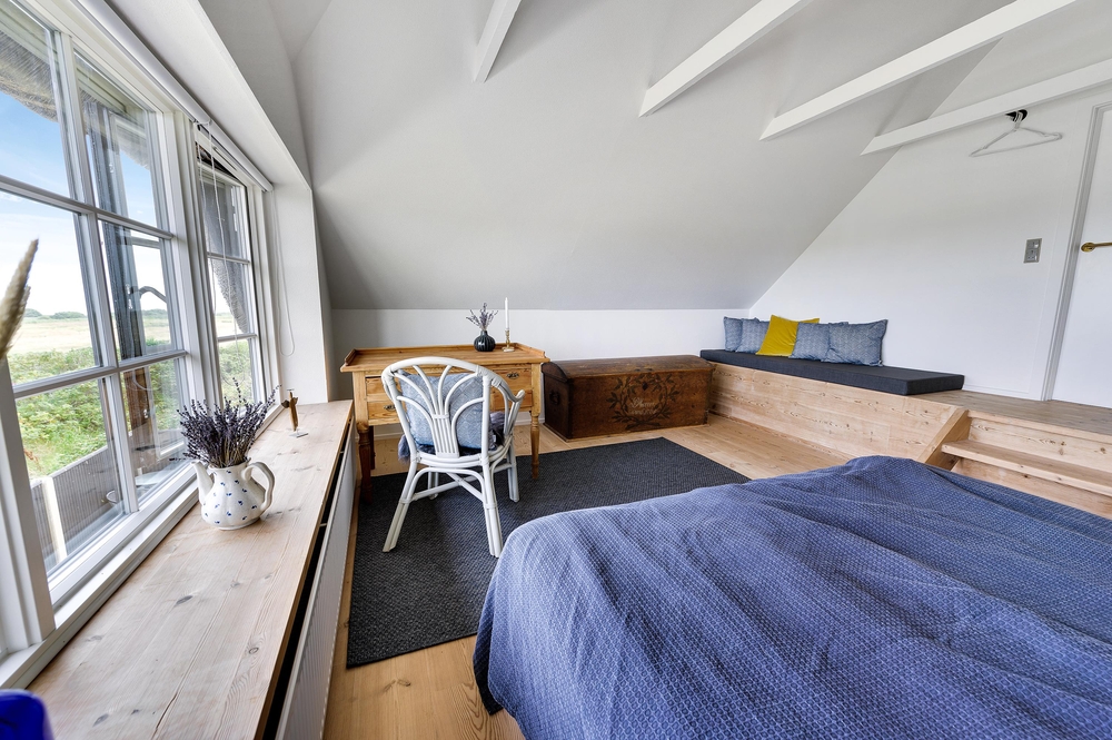 Når dagen går på held, kan I trække jer tilbage i de 7 forskellige soverum, der både ligger i stueetagen og på 1. sal. Her er lyse farver og bekvemme senge sat sammen med møbler i en ældre, original stil. De lave dørhøjder enkelte steder på 1.-salen kombineret med de høje lofter i kip vidner om husets alder og bidrager til den hyggelige bondegårdsstil.