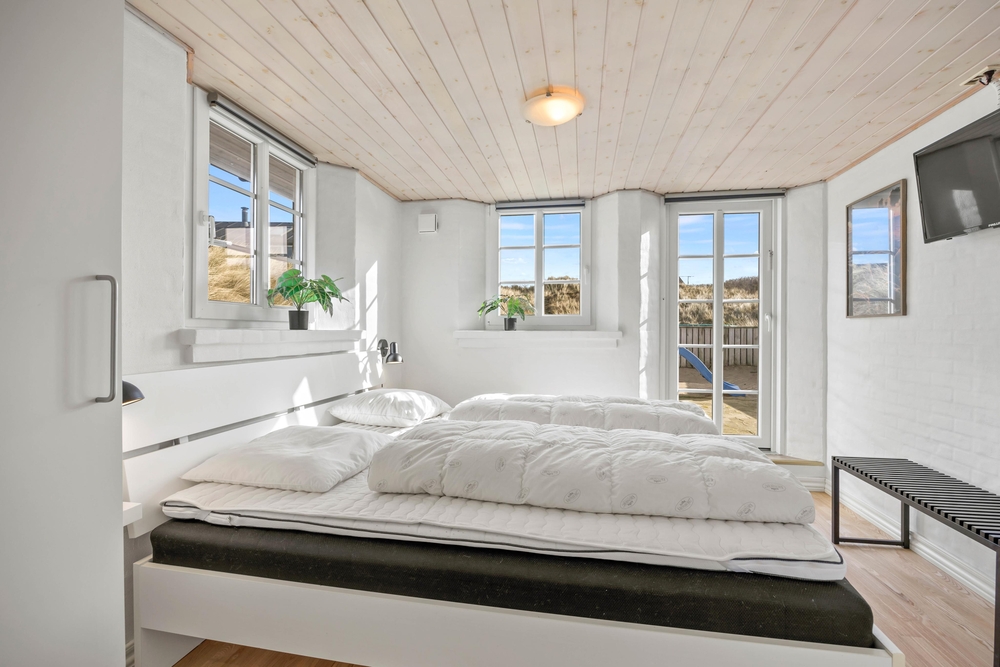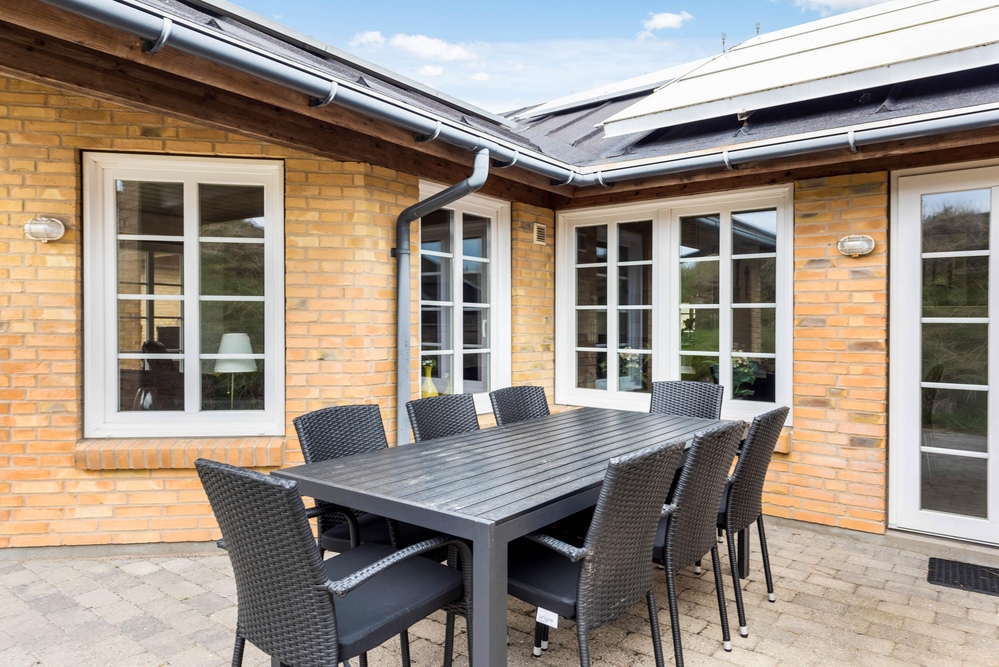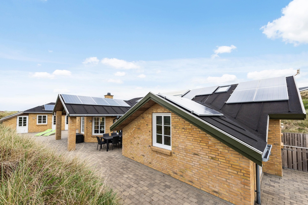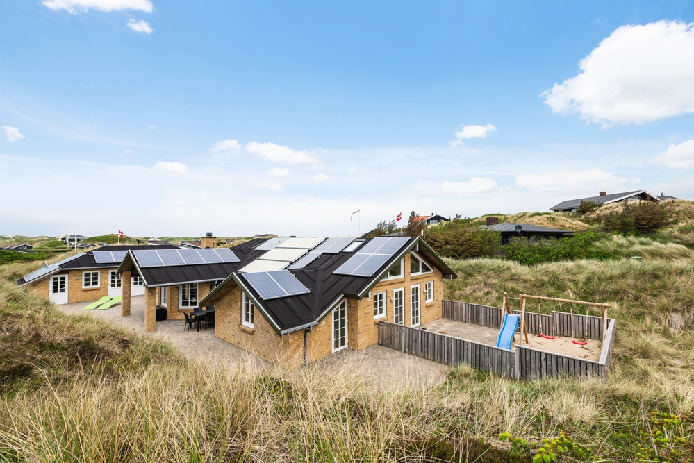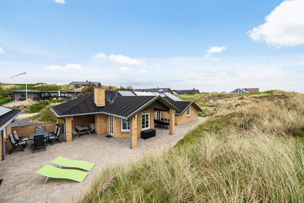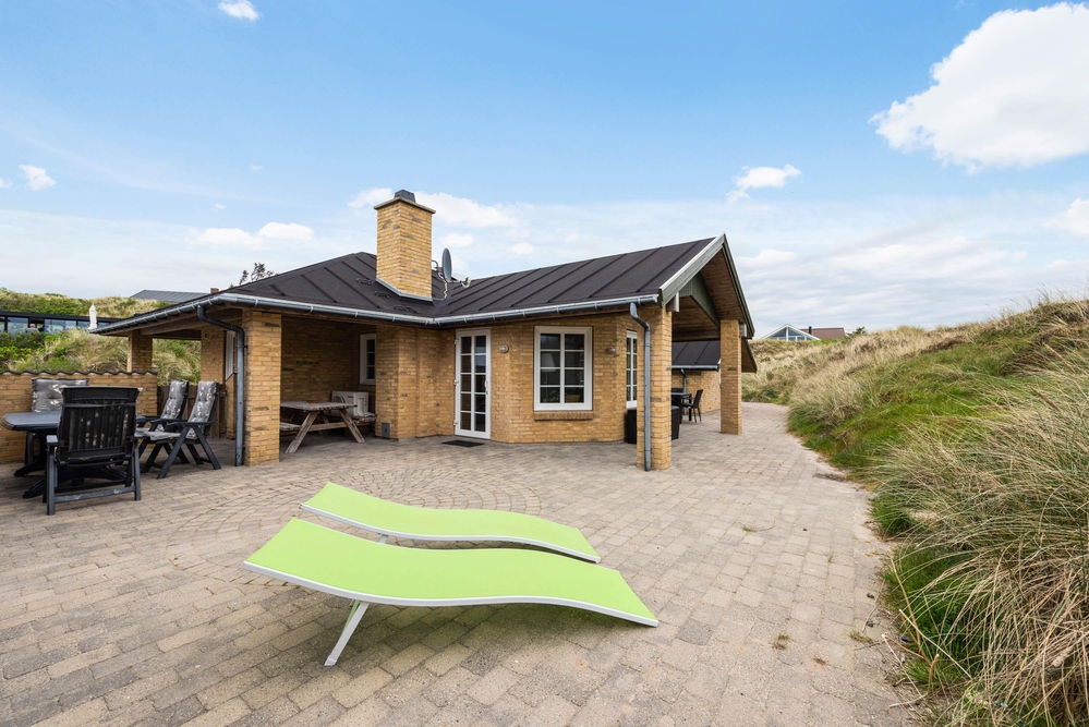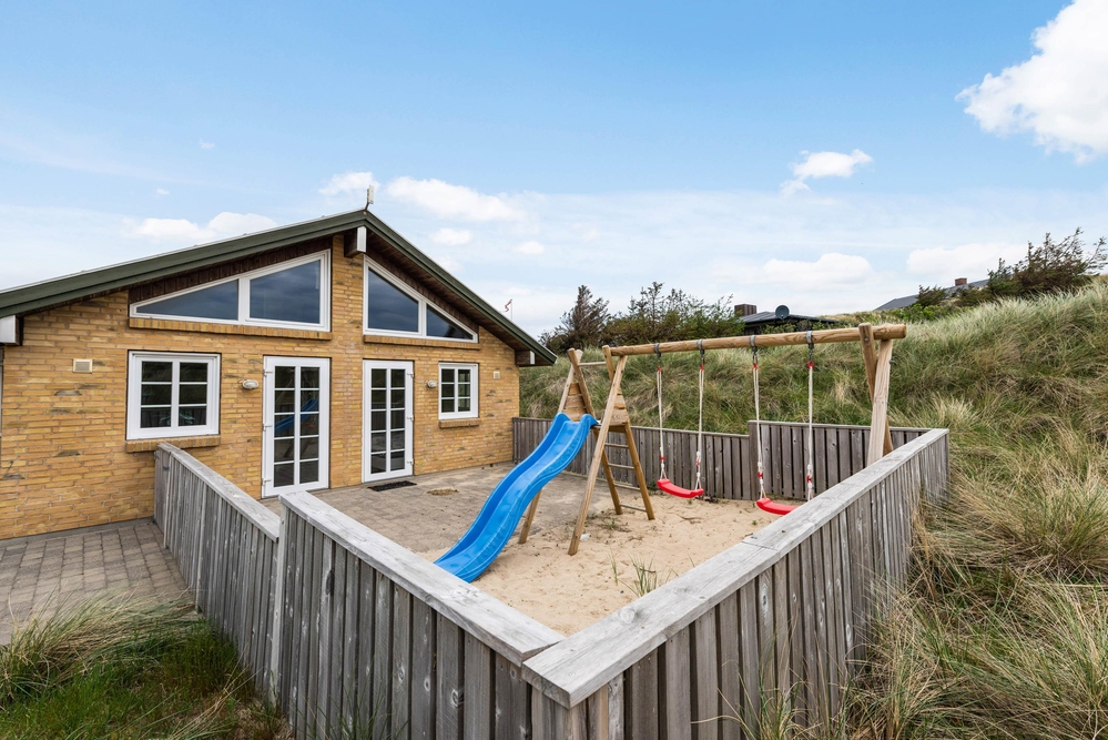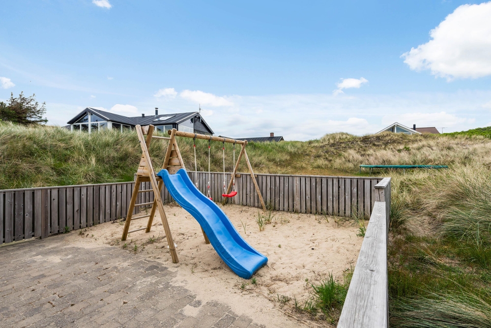 Huset ligger på en skøn kuperet klitgrund med naturlig afskærmning, så der er gode muligheder for at finde en skøn solplet, hvor I rigtig kan nyde ferien med en glas koldt at drikke. Til feriehuset hører der derudover en meget stor og rigtig lækker terrasse med god plads til udendørslivet. Der er gynge og trampolin til de små, hvor de rigtig kan få brændt krudt af. Som afslutning på aftenen har I mulighed for at tilberede aftensmåltidet på den tilhørende grill.