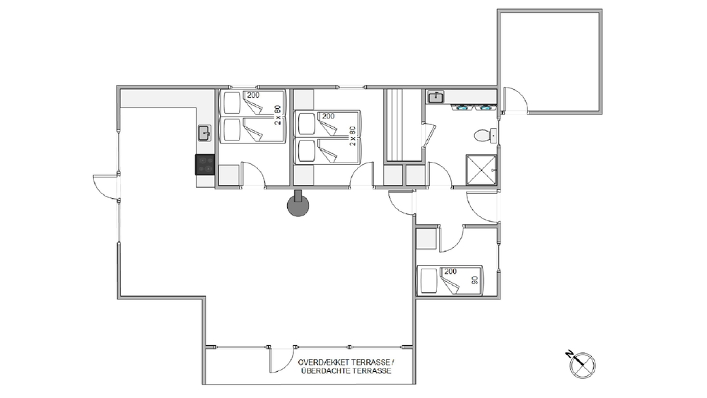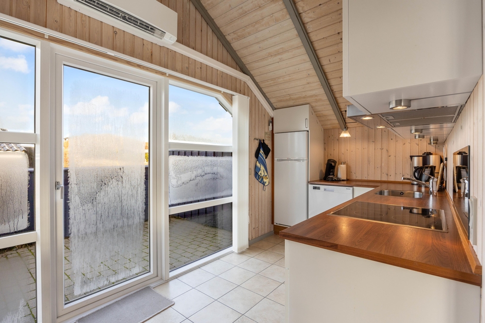 Når I træder ind i sommerhuset, bliver I mødt af en rummelig stue, der ligger i forlængelse af køkkenet. Imens I nyder et måltid fra spisepladsen, kan I lytte til brændeovnens knitren, der samtidig sørger for en lækker, behagelig varme og danner rammen om ægte feriestemning. I sommerhuset finder I ovenikøbet en vaskemaskine og tørretumbler, der gør det nemt for dig at holde dit tøj rent og frisk under hele dit ophold.