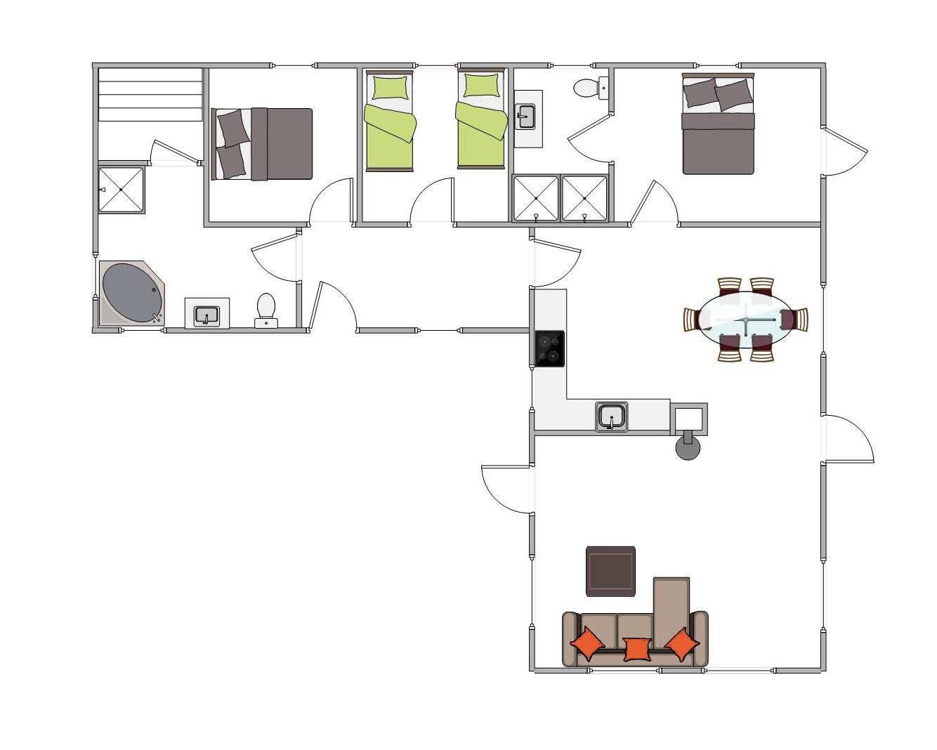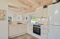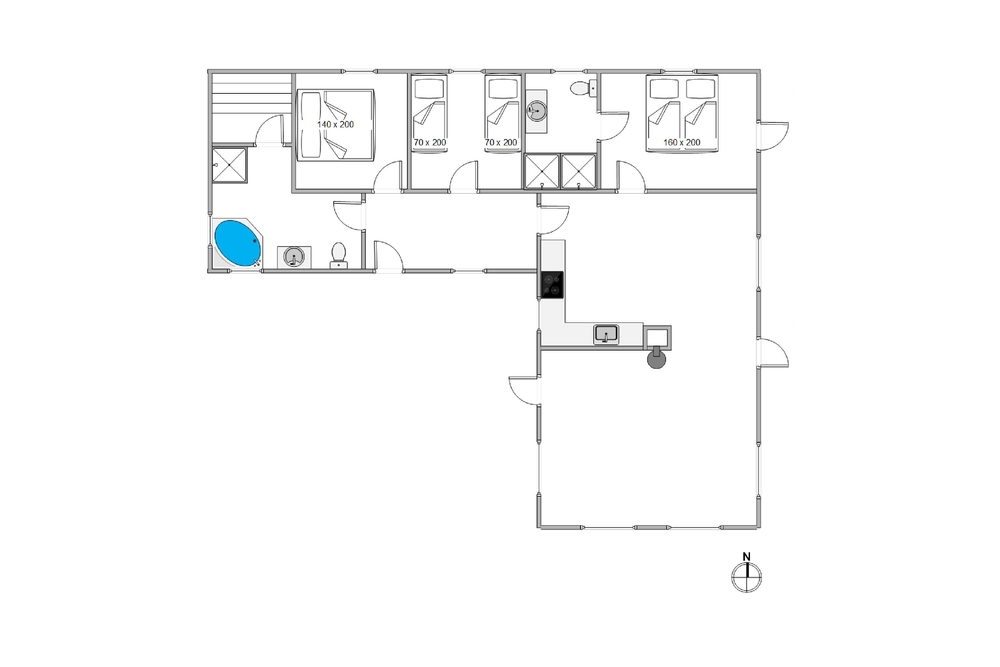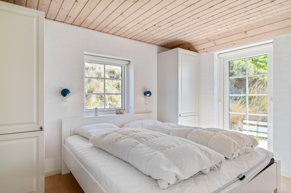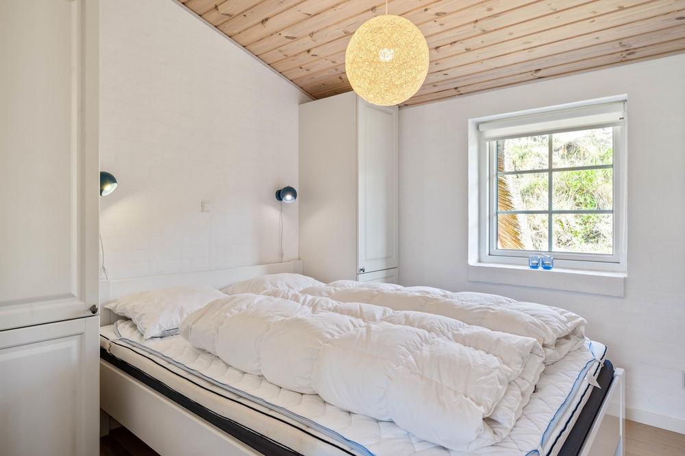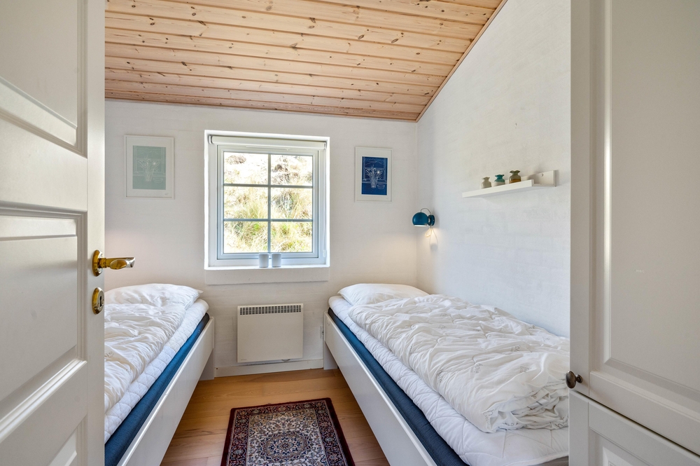 Feriehuset har 3 soveværelser, hvor 2 er med dobbeltseng. Det sidste værelse er med enkeltmandssenge, hvilket er oplagt til familiens børn. Desuden er huset oplagt til 2 familier, da der er 2 badeværelser, så hver familie kan få sit eget ? begge med gulvvarme. Derudover er feriehuset indbygget med en hems, som helt sikkert vil blive et hit for ungerne.