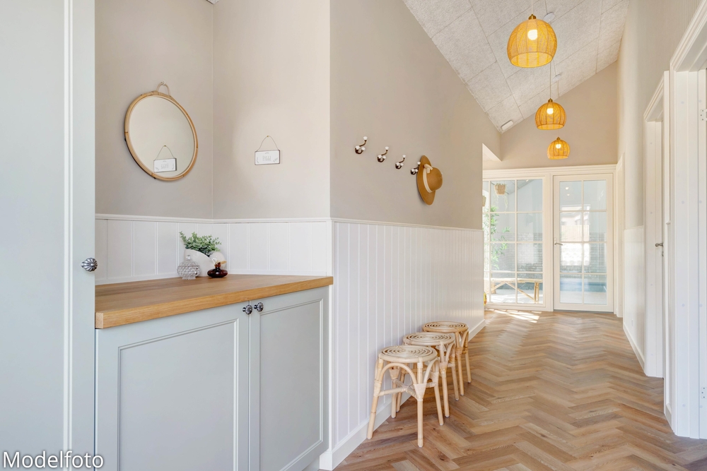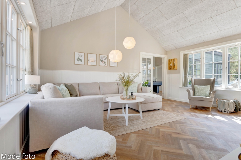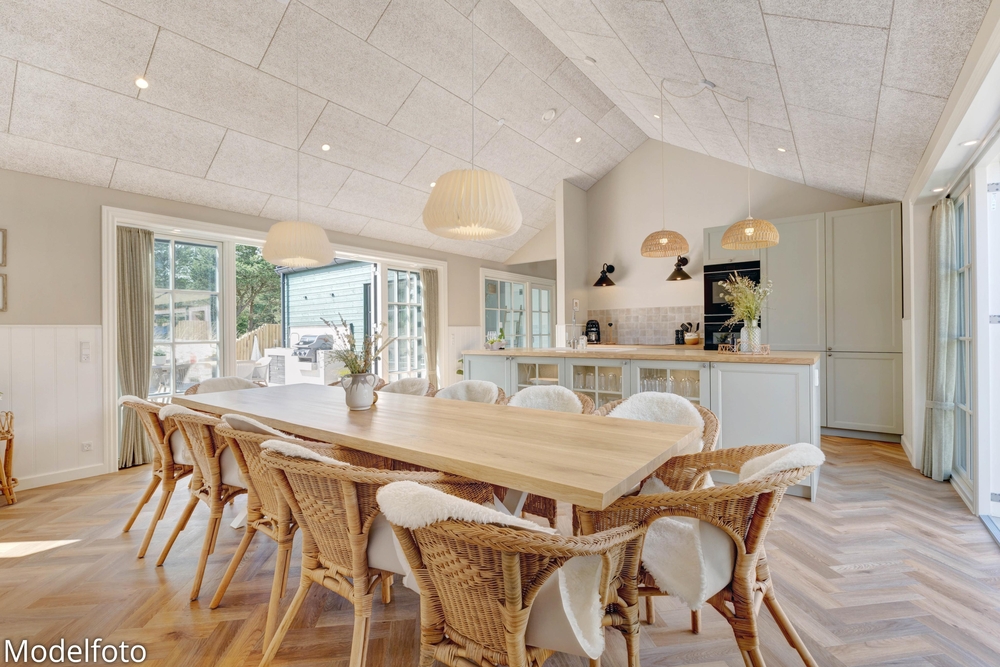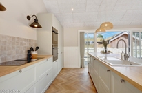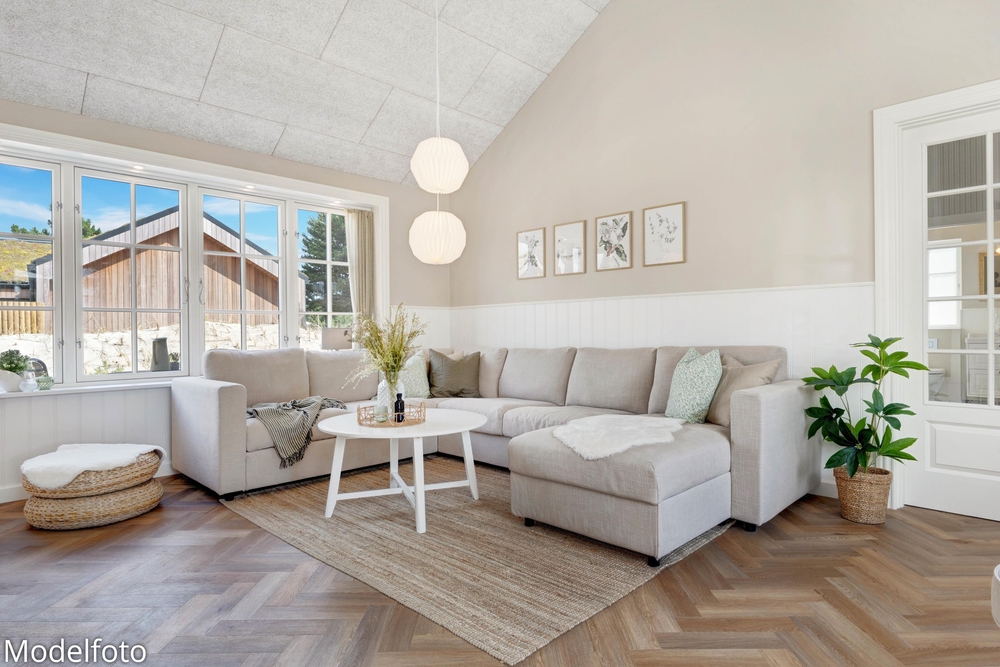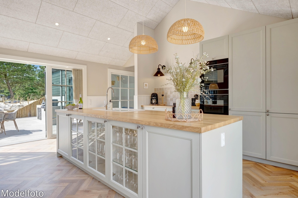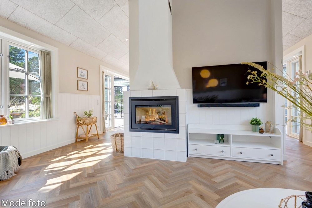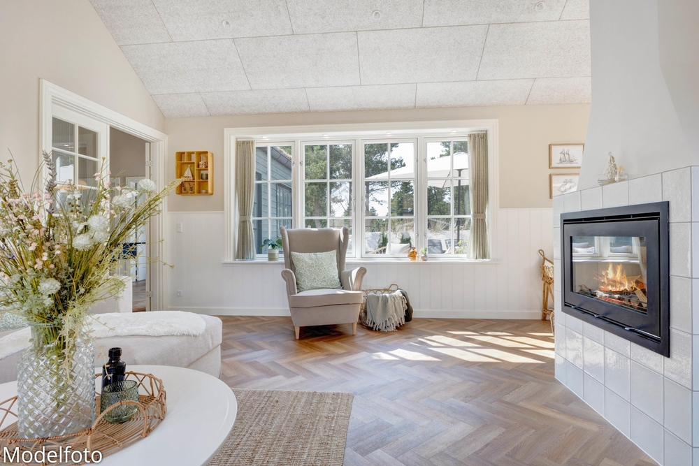 Hjerterummet er det lyse alrum, der forener stue og køkken. Her er en varm og rar atmosfære, og dagslyset strømmer gennem de mange vinduer. Her er plads til familielivet; uanset om I skal lave mad, holde spilleaften eller se en god film i fjernsynet. Med den hyggelige brændeovn er der lagt op til rigtig feriehygge ? tænd op i brændeovnen efter en dejlig vandretur i den skønne natur eller smid jer i sofaen med en god krimi og et glas vin. Endvidere byder sommerhuset på en energibesparende varmepumpe samt alle hverdagens hjælpere herunder vaskemaskine og tørretumbler.
