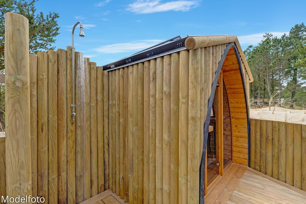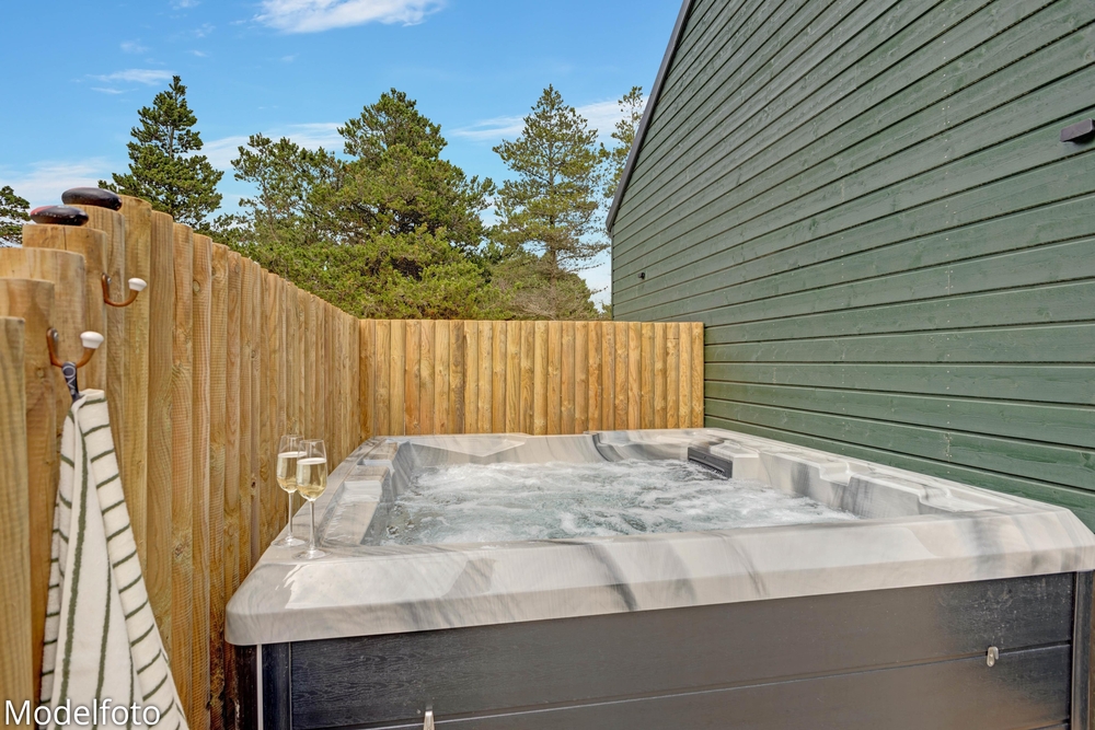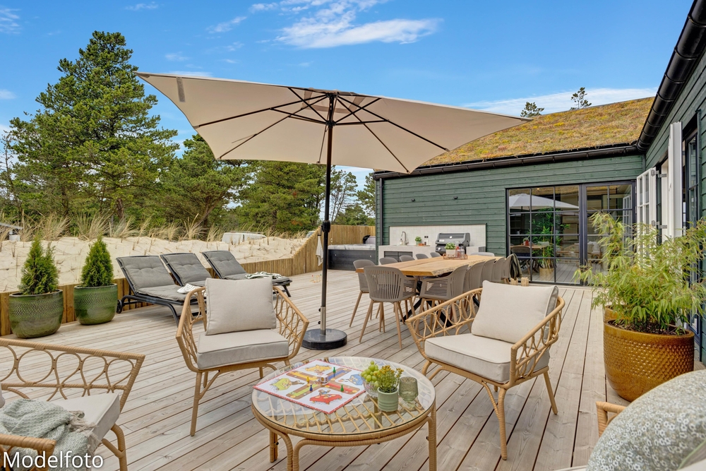 Imens kan familiens grillmester tilberede aftensmaden på gasgrillen ? dét hører sig sommeren til! Nyd måltidet med et køligt glas rosé efterfulgt af en aftentur i udespaen. Se den smukke stjernehimmel og mærk de varme bobler. Udenfor finder I også udesaunaen samt udebruser ? perfekt til at skylle sig mellem saunasessionerne eller efter en lang dag på stranden. Udebruseren kan benyttes fra april til november.