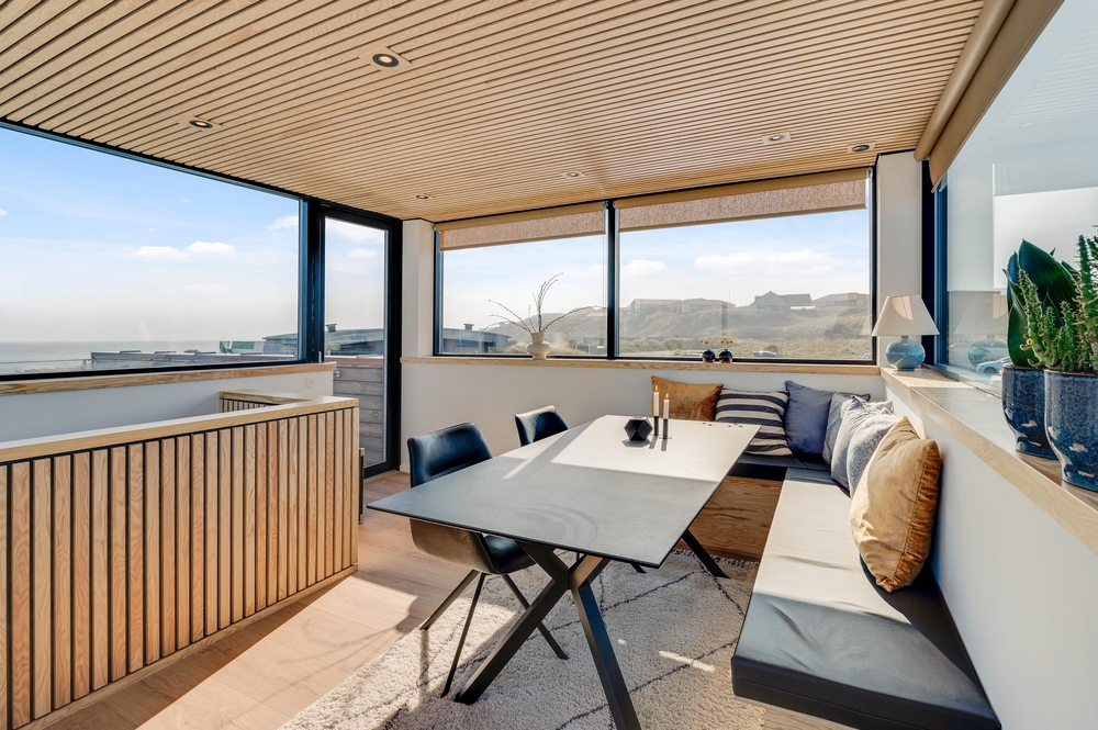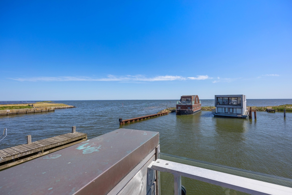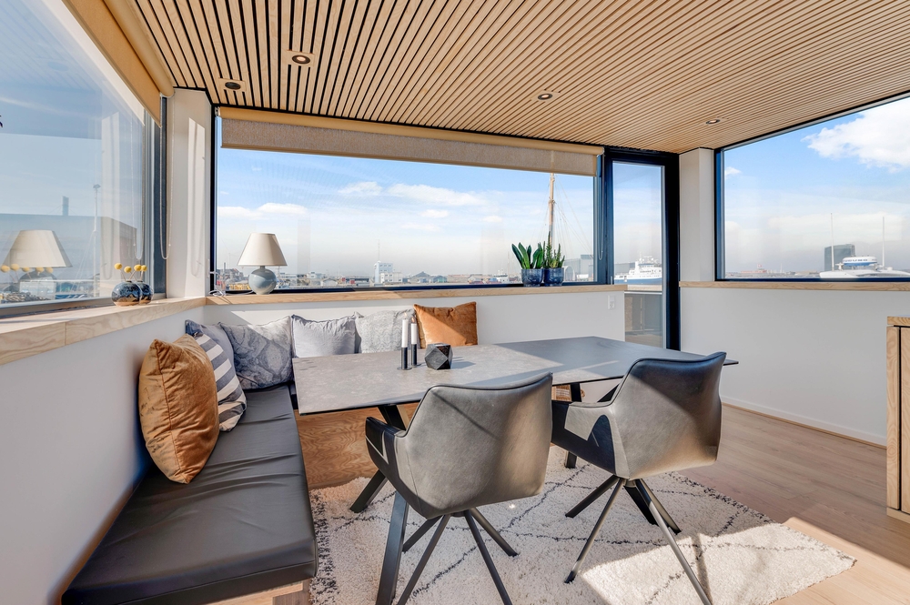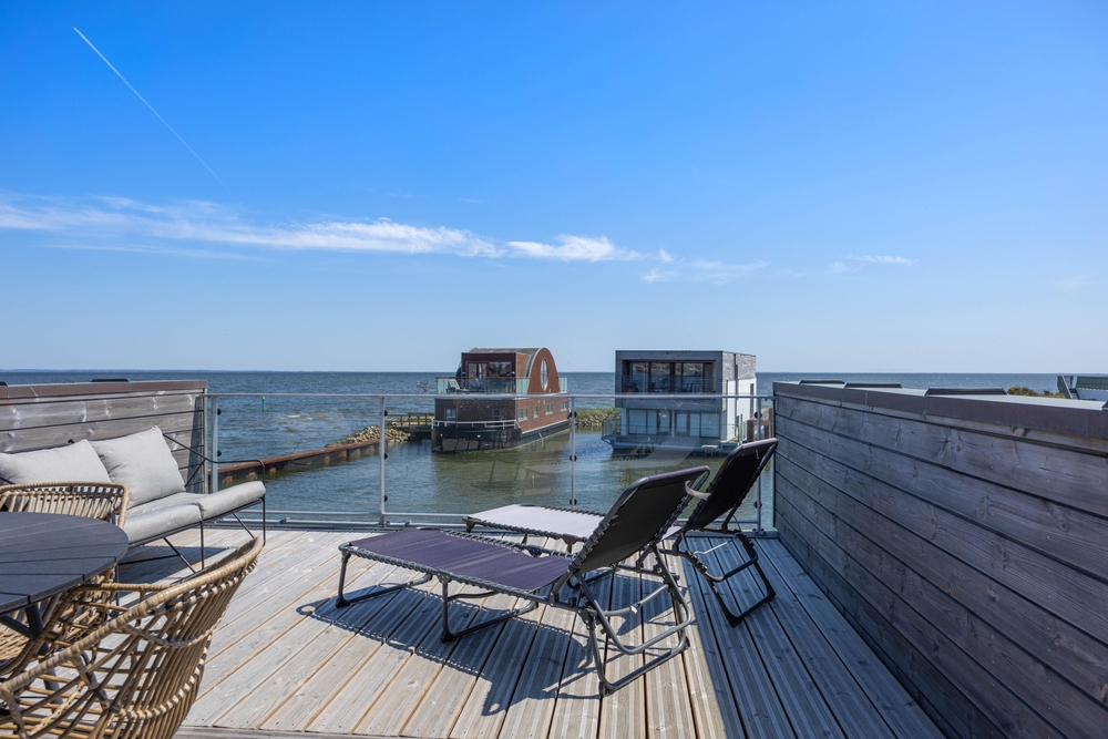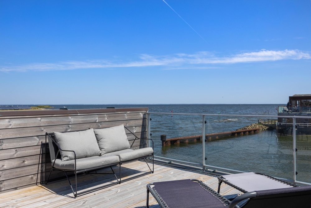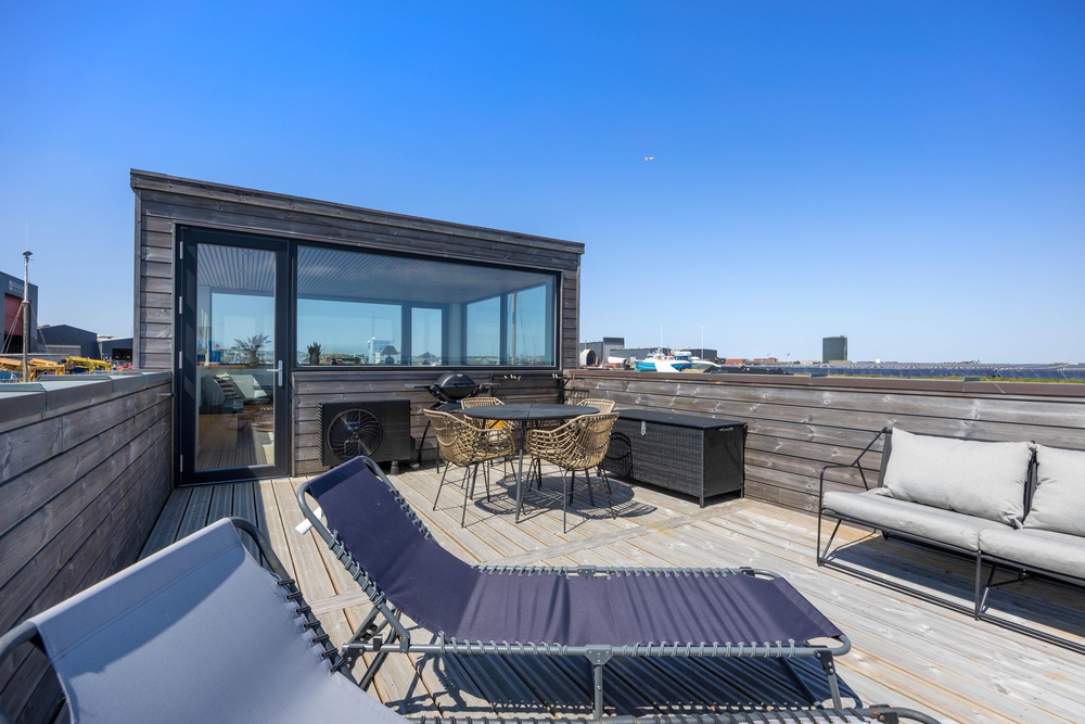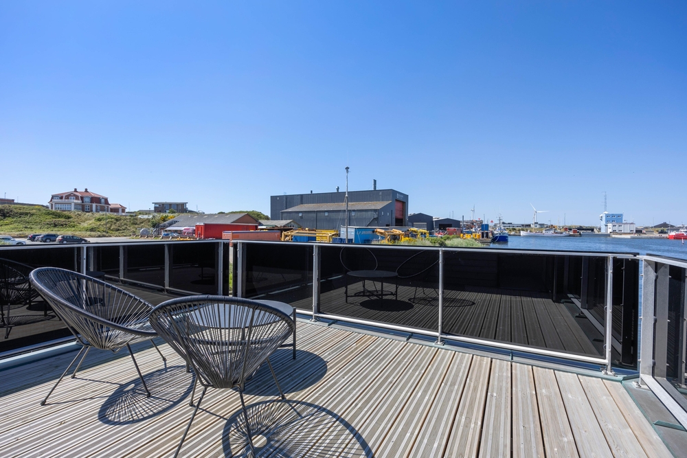 På taget af husbåden venter jer en skøn terrasse med fantastisk panoramaudsigt over Ringkøbing Fjord og havnen i Hvide Sande. Her kan I nyde en afslappende stund i den friske luft, mens solen går ned bag klitterne i vest. På terrassen kan I desuden sidde i fred og ro samt i læ for en lille vind.