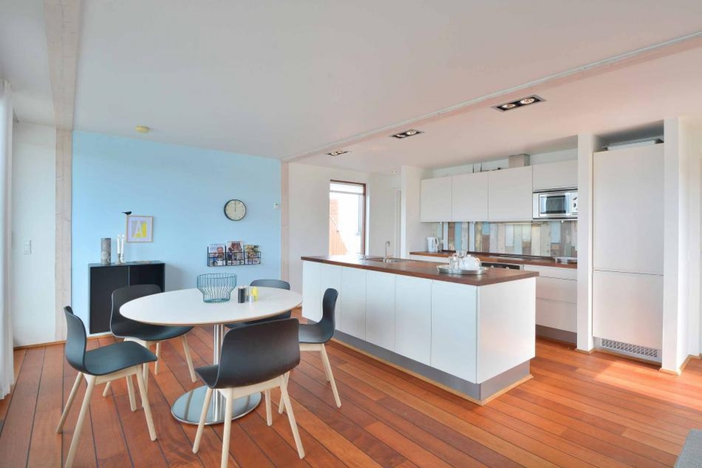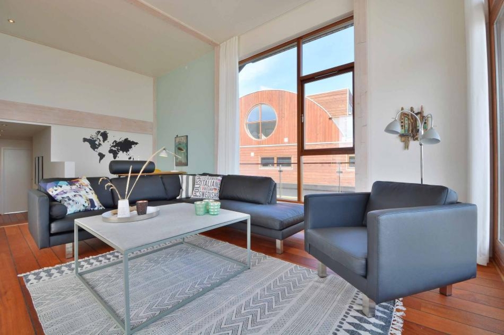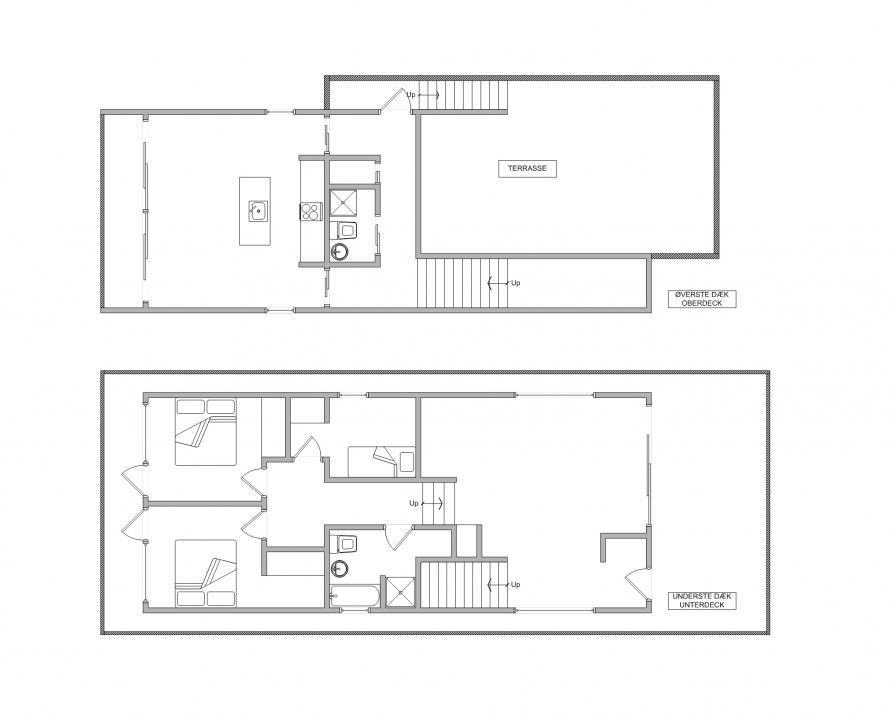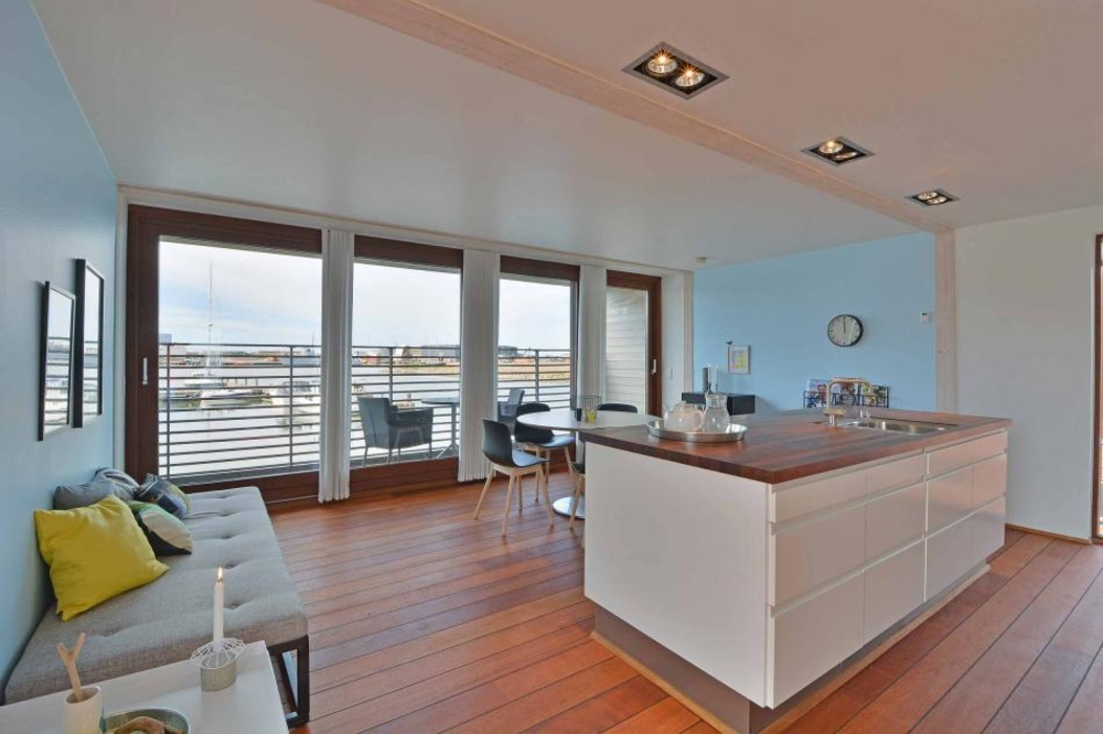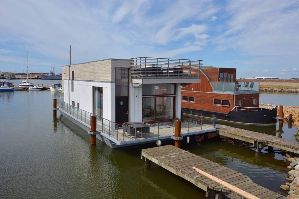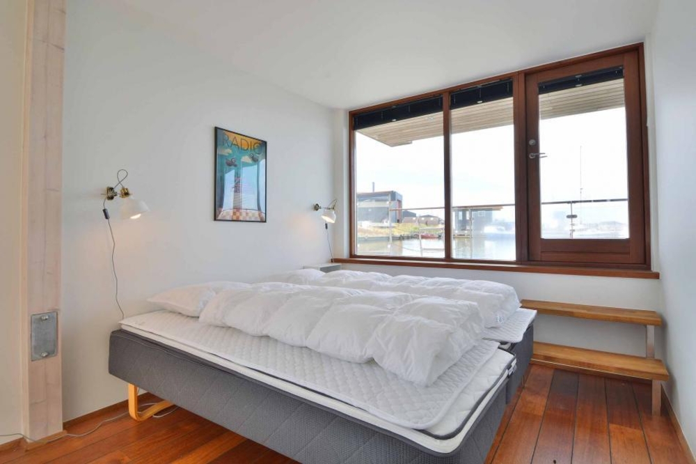 Arkitekturen er flot, enkel og maritim, møbleringen er flot og stilren, og ingen steder er der gået på kompromis med kvaliteten. Husbådens 140 m2 er fordelt på to plan, og praktisk indrettet med et badeværelse på hver etage.