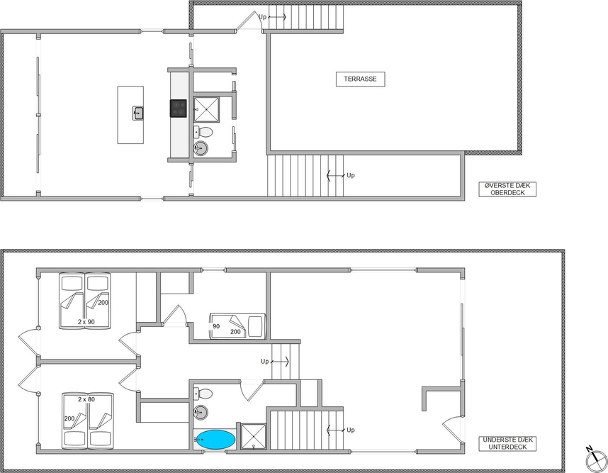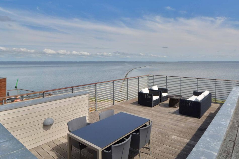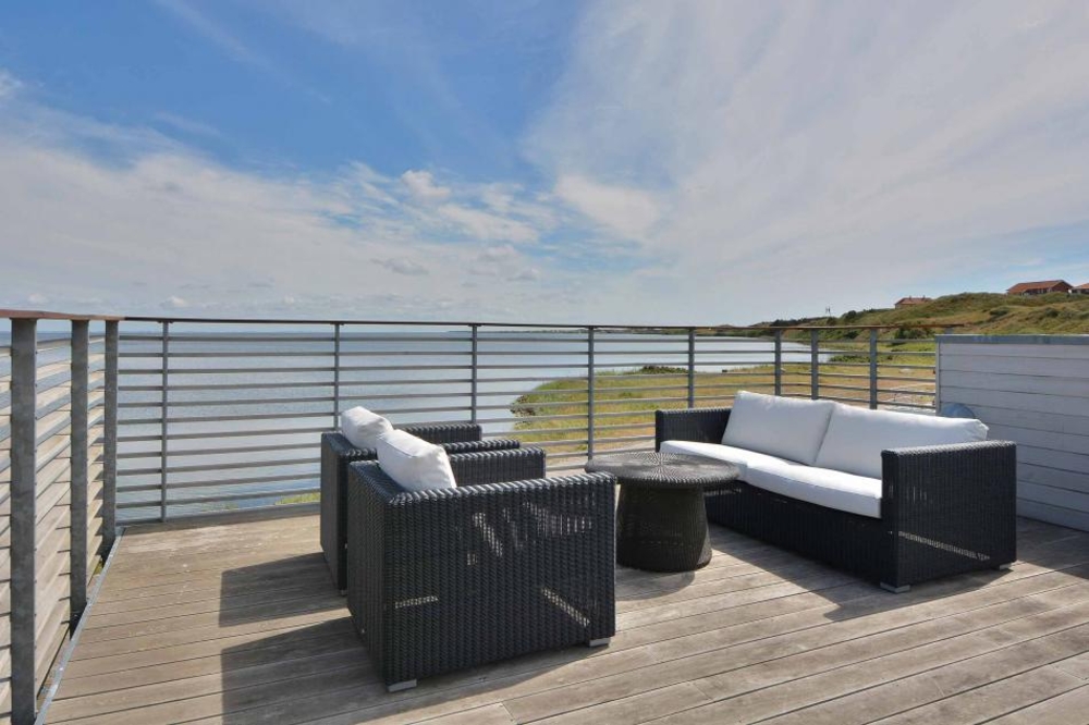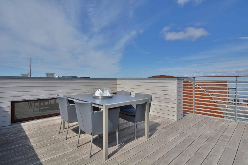 Husbåden har også terrasser på begge plan. Nederst er der en mindre terrasse og øverst er der en noget større, som også er delvist afskærmet. Og her kan I nyde en smuk udsigt over fjorden og Hvide Sande havn, ? og måske nyde en grillmiddag, tilberedt på bådens gasgrill.